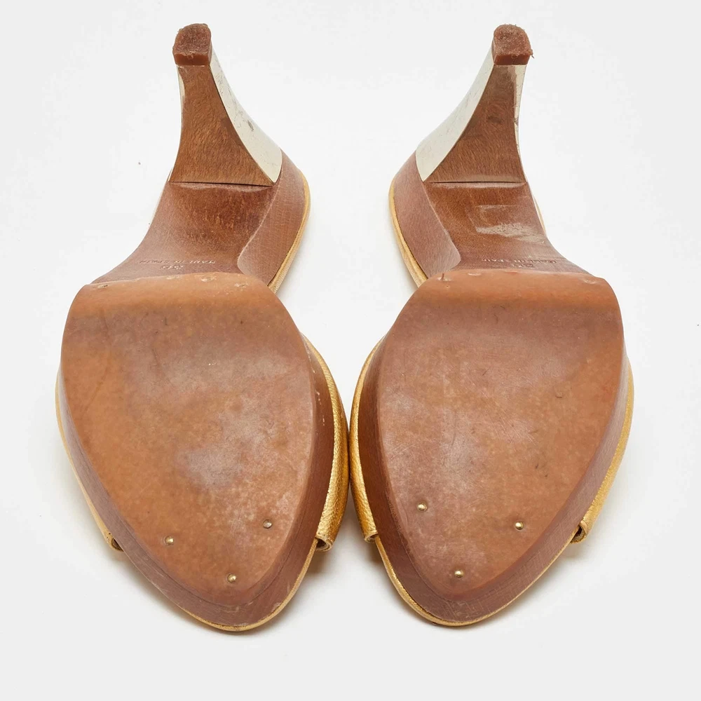 Exterior Material: Leather Department: Women Insole Material: Leather Color: Gold Outsole Width: 7 cm Upper Material: Not Available Platform Height: 2.5 cm Heel Size: 9 cm Sole Material: Rubber Style: Not Available Type: Slip on Brand: Yves Saint Laurent Seller Notes: “- In good condition with minor scuffs/darkening/scratches on few areas, normal wear on sole/lining.” Country of Origin: France Outsole Length: 23 cm Includes: Original Dustbag US Shoe Size: Not Available Closure Type: Slip on Lining Material: Leather