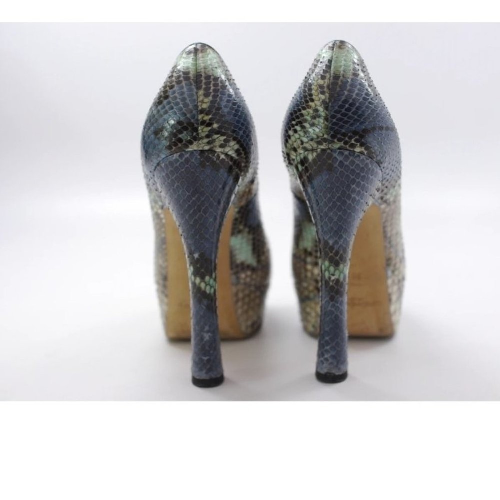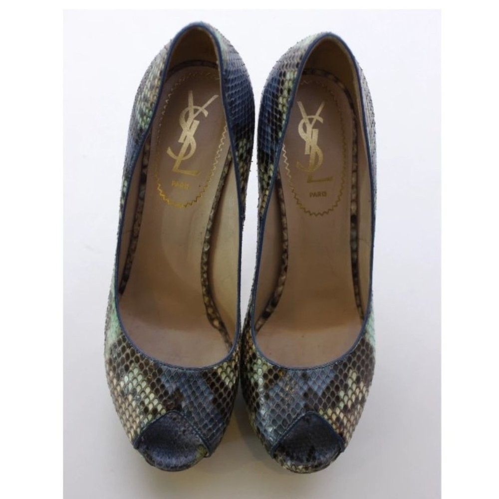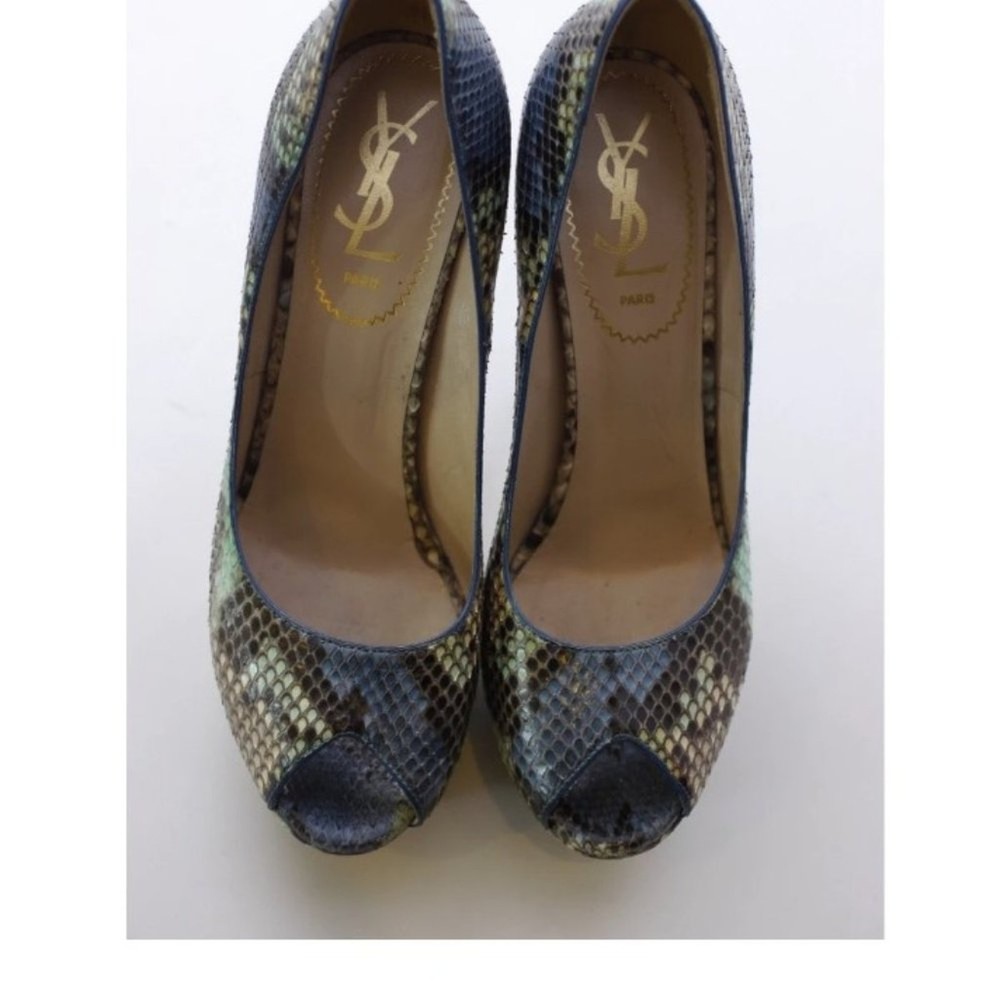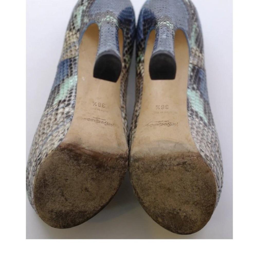 Beautiful Yves Saint Laurent Exotic Python Leather Pumps Shades of Blue, Beige and Green Genuine Python Leather Open Toed Pump 5.25" Heel with 1.5" Platform Offset Size: 36.5 (6 - 6.5 US) Excellent Pre-Owned Condition. Thoroughly Cleaned and Ready to Wear. Comes to You in A Windowed Shoe Bag For Safe Storage. FAST SHIPPING