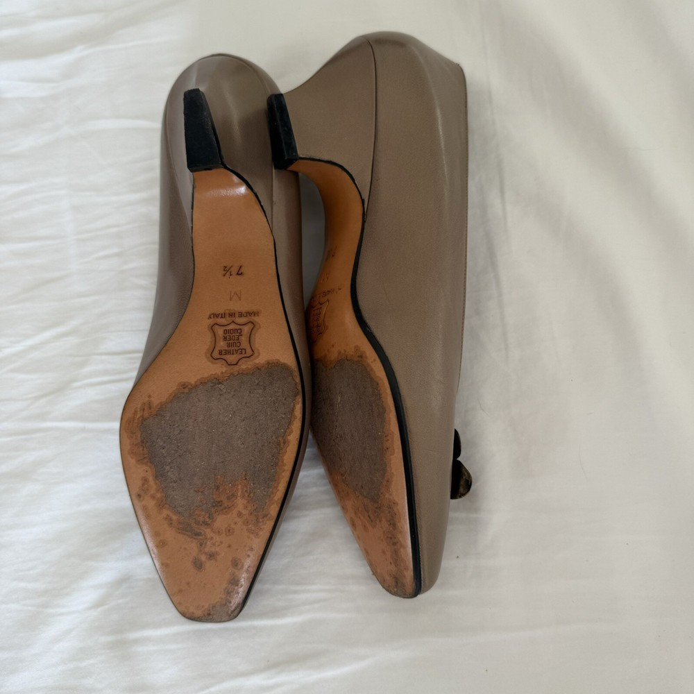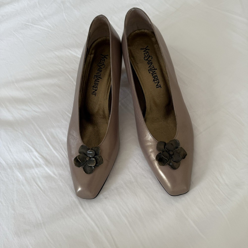 VINTAGE YVES SAINT LAURENT KITTEN HEELS CLOSED TOE. SIZE 7.5 MADE IN ITALY. FLOWER DETAIL. IN GOOD CONDITION!