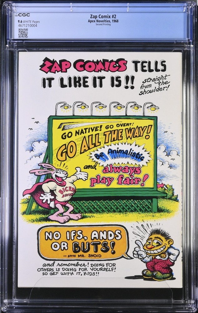 Collectible Comix Titled: ZAP COMIX #2 Robert Crumb CGC Graded 9.6 Published: July 1968 Publisher: Apex Novelties Pages :52 Artist's: Robert Crumb, Clay Wilson, Rick Griffin, Victor Moscoso, 70 Lb. paper stock first printing. first 5000 copies Collector's item! Second Zap comix book in the series in rack fresh Shape like you picked it up today off a rack in the store crisp corners Bright staples White Pages Have any Questions? Click the Ask a question link at the top of the listing. PAYMENT : We accept eBay Payments. must be received within 3 days from the auction end date to receive your comic fast as possible. Shipping in the (USA): Ground Advantage tracked and insured. RETURNS: Buyer may return the item within 14 days of receiving the comic's/comix you pay return shipping if your unhappy with this comic/comix. Check the pictures the comix you will receive will be this one pictured. Items MUST be returned in the same condition and must be packaged as it was received then You will receive a refund for the full amount "Excluding Shipping fees". when it arrives and is checked. Your/Our FEEDBACK - Each buyer will receive positive feedback at the end of every successful Transaction, and we would appreciate feedback in return! Thank You! for looking Feel free to check out our other comic's/comix's for sale and we will be adding many more in the future we will be adding 100's slowly in time so keep watching us grow and get some killer deals on unread copy's that will soon disappear in time get some now before they vanish and you lose out on awesome deals coming your way. Thank you for reading this long Description! The product is a vintage comic book titled ZAP COMIX #2 from 1968, featuring the art and story by Robert Crumb. Published by Apex Novelties, Inc., this single issue belongs to the Silver Age era of US comics. With a focus on adult humor and satire, this comic book showcases the unique and innovative style of Crumb and his contemporaries, making it a sought-after collectible for fans of alternative comics.
