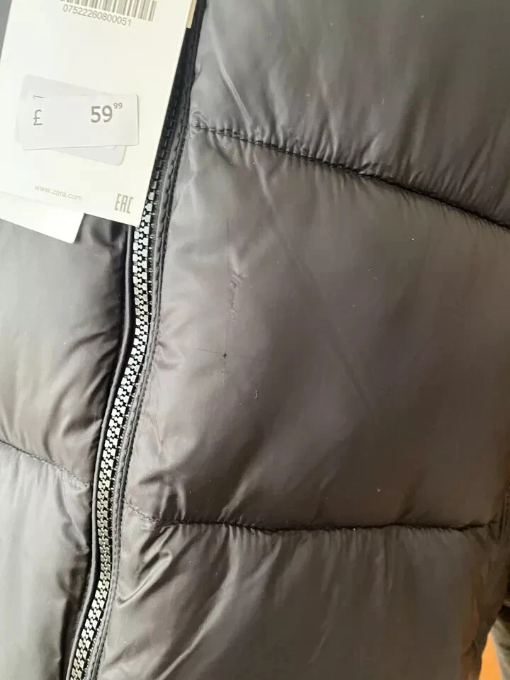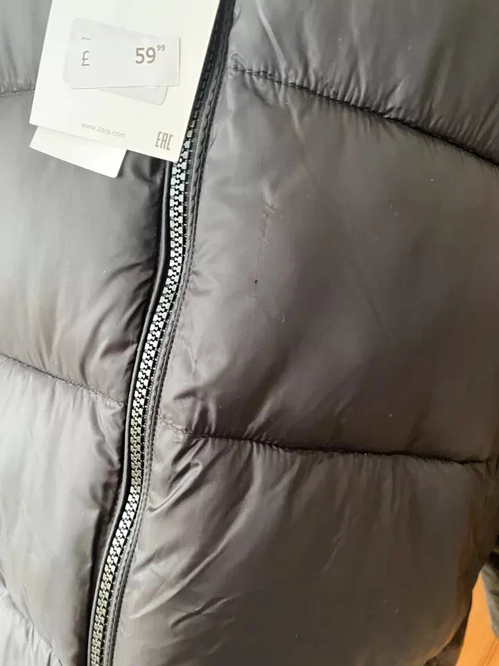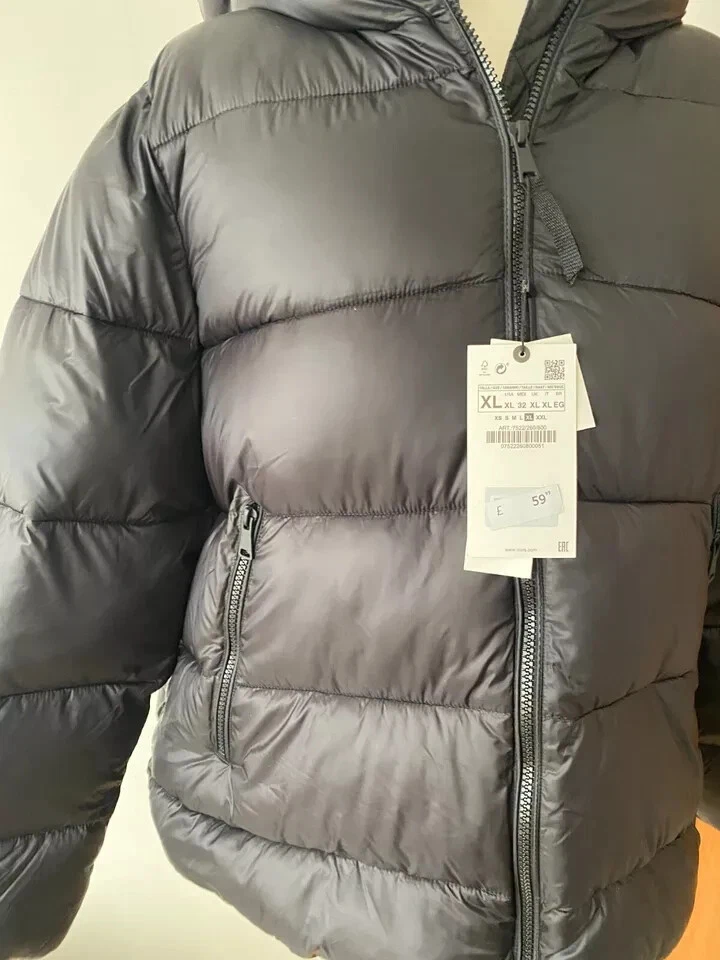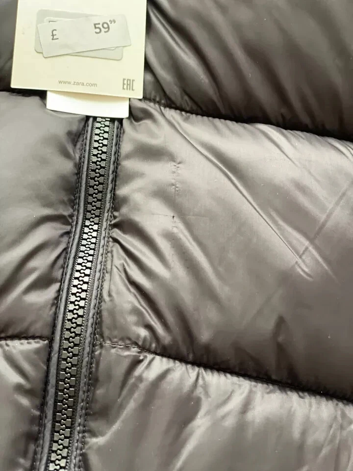 ZARA BLACK COMFORTEMP® THERMAL INSULATION PUFFER JACKET NEW WITH DEFECTS SIZE XL Due to storage slight defect/ please see last 7 photos PRICE REDUCED Hooded puffer jacket with a high collar. Long sleeves with elastic trims. This garment contains a Comfortemp® Thermal insulation by FREUDENBERG: An ultra-soft thermal insulation filling material that retains body heat. It is lightweight, breathable and easy to clean. Front zip pockets. Asymmetric hem. Zip-up front fastening. Approximate measurements are as below; Arm pit to pit approx. 24.5" Length approx. Front approx. 25.5" back longest par from nape to hem approx.27.5" Sleeve approx. 25.5" Shoulder from back approx. 17" OUTER SHELL 100% nylon LINING 100% nylon FILLING 100% polyester Thank you for looking SORRY, NO RETURN