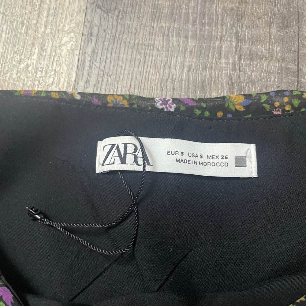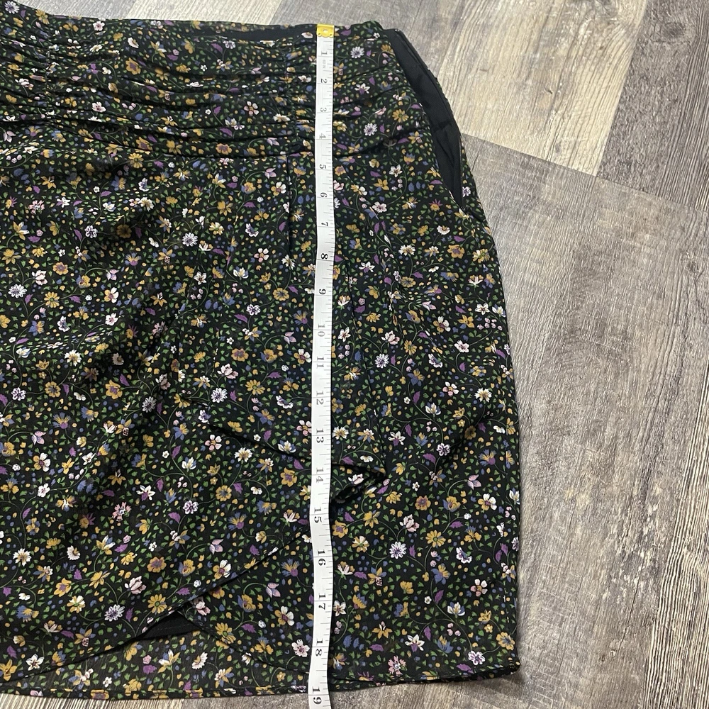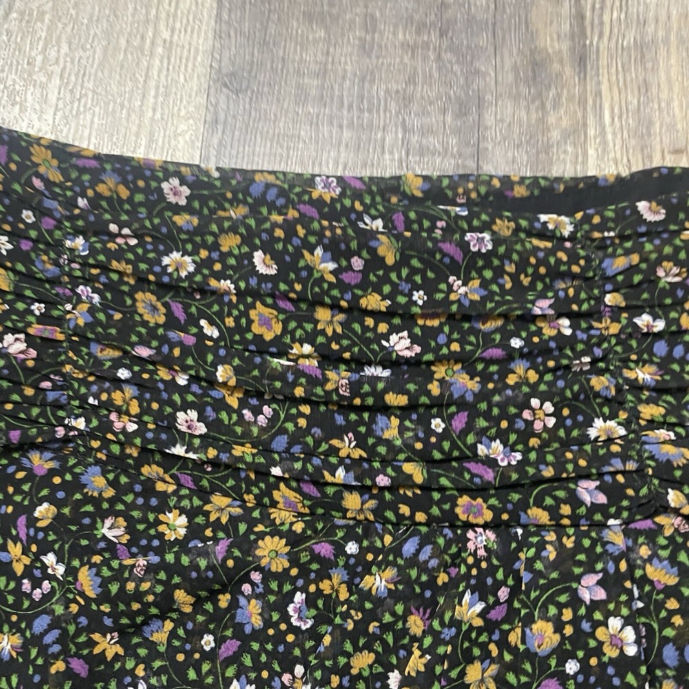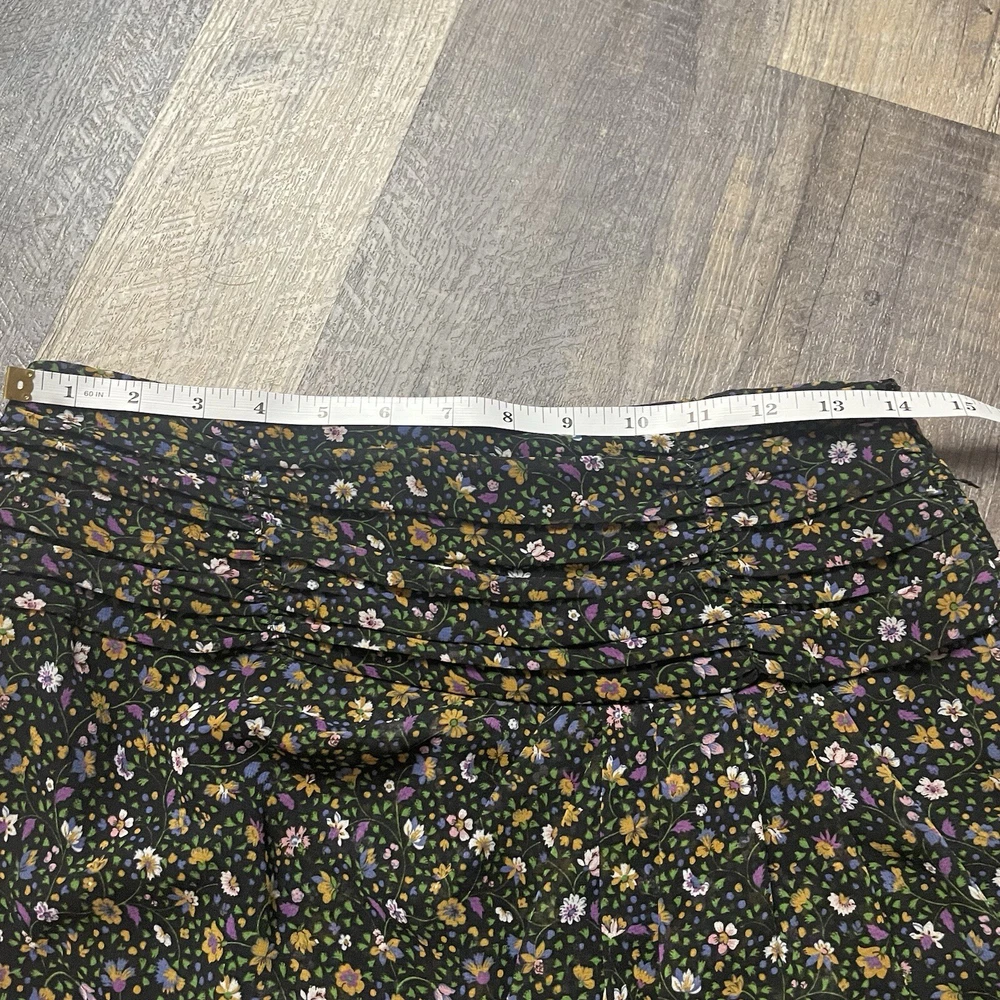 The ZARA Black Floral Print Ruched Mini Skirt in size S is a stylish and versatile piece perfect for various occasions. The skirt features a vibrant floral pattern, ruched detailing, and a zip closure for easy wear. Made from polyester fabric with a medium wash, this skirt is designed for a regular fit and mini length, making it ideal for summer, fall, and spring seasons. The colorful theme adds a playful touch to the black base, making it a perfect addition to any woman's wardrobe for both party and casual looks.