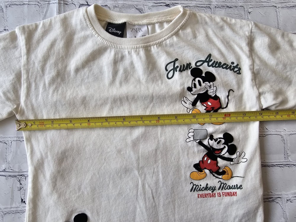Description: Bring some Disney magic to your child’s wardrobe with this adorable ZARA Kids Mickey Mouse short-sleeve T-shirt. Featuring a cheerful "Fun Awaits" and "Everyday is Funday" graphic print of Mickey Mouse in vibrant red, yellow, and black tones. Brand: ZARA Kids (Disney Collection) Size: 5 Years / 110 cm Material: Main fabric: 100% Cotton Secondary fabric: 98% Cotton, 2% Elastane Color: Off-white / Cream Made in: Morocco Condition: Pre-owned, gently used, in good condition. No holes or major stains. Minor signs of wear consistent with normal use. Care Instructions: Machine wash cold, tumble dry low, do not bleach (see care tag for details). Perfect for everyday wear, playtime, or Disney fans of all ages. Your little one will love the comfortable fit and fun design!