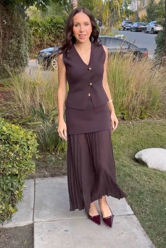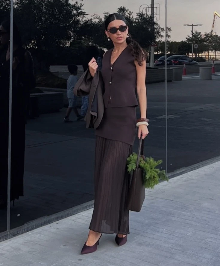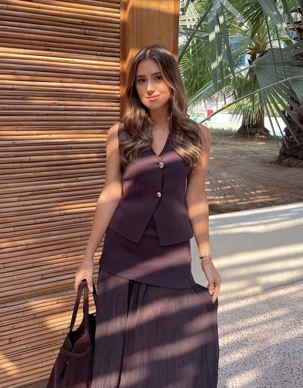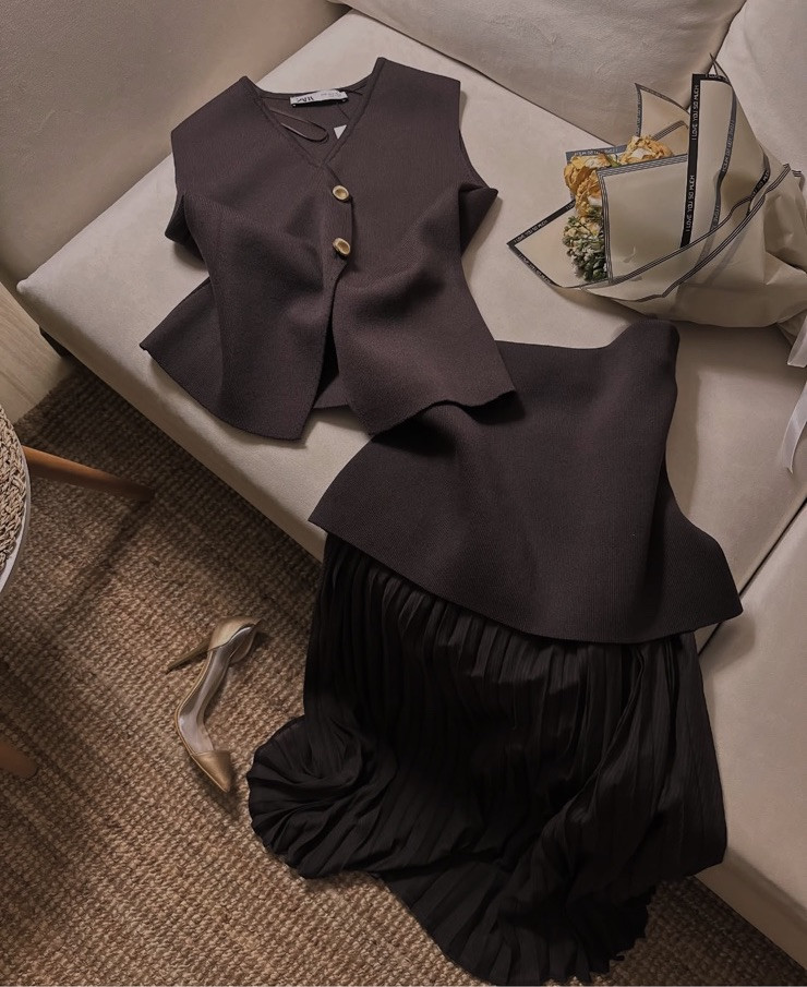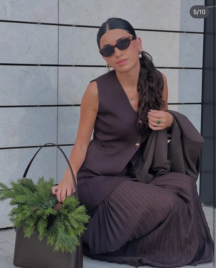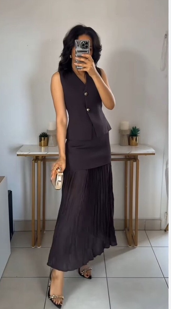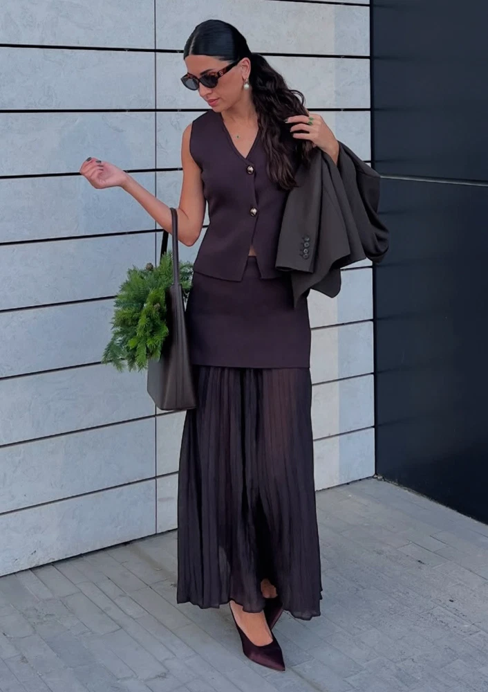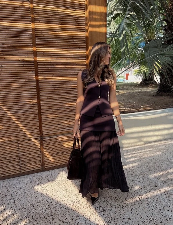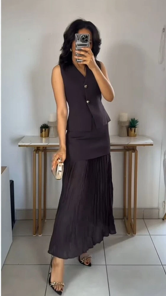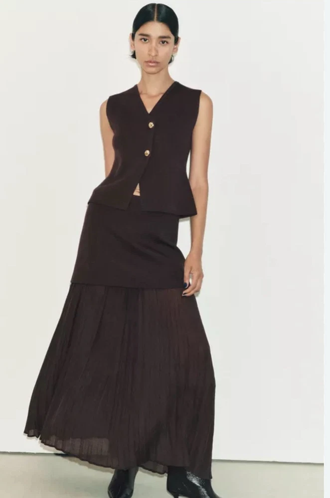 The ZARA New Woman Combined Pleated Knit Skirt and Matching Top Set in Brown, size S, is a stylish and versatile co-ord set perfect for a variety of occasions. Made from a blend of polyester, viscose, and polyamide, this high-rise skirt features pleats for added detail. The set includes a matching top, making it easy to put together a complete and coordinated outfit. Ideal for parties, casual outings, workwear, or business meetings, this set from Zara is designed to make a statement and elevate your wardrobe.