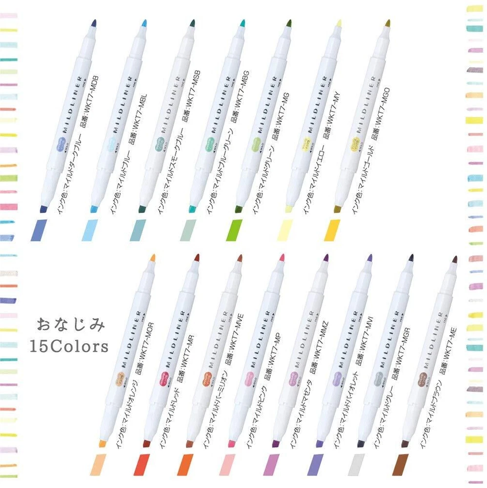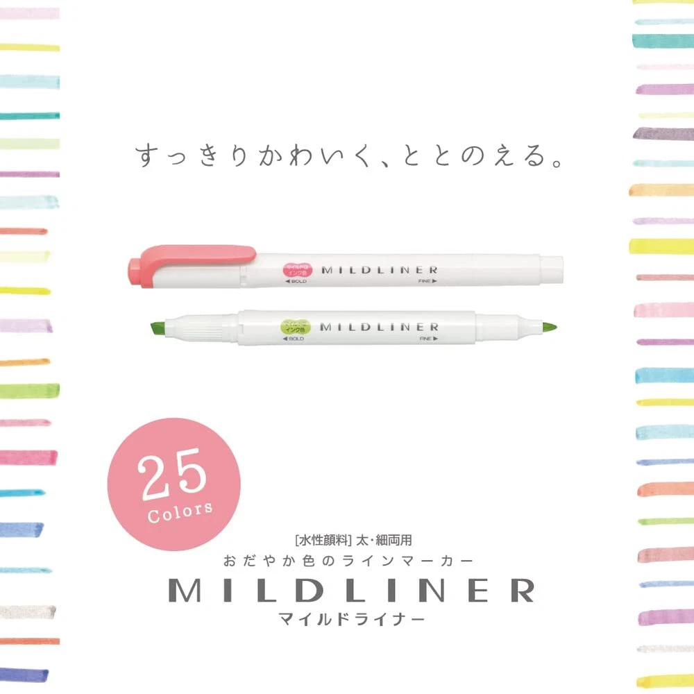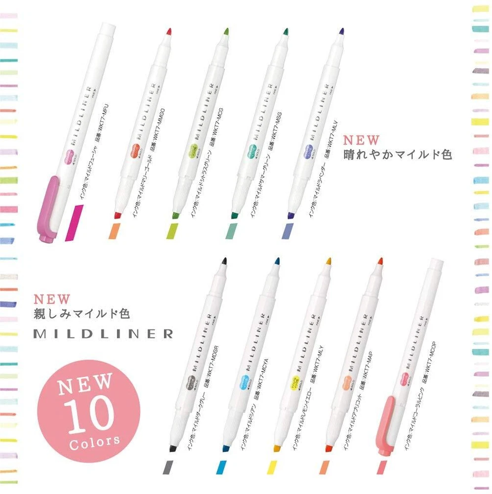 New colors appeared in the Zebra "Mild liner" ! The Mild liner highlighter features a unique color that shows up softly on paper. It has just the right shade to attract your attention, but won't overwhelm you with bright fluorescence. The highlighter is double-sided with a broad and fine tip. This set includes 5 colors: Mild Citrus Green, Mild Fuschia, Mild Lavender, Mild Marigold, and Mild Summer Green. This set includes 5 colors: Mild Citrus Green, Mild Fuschia, Mild Lavender, Mild Marigold, and Mild Summer Green. The highlighter is double-sided with a broad and fine tip. The Mildliner highlighter features a unique color that shows up softly on paper.