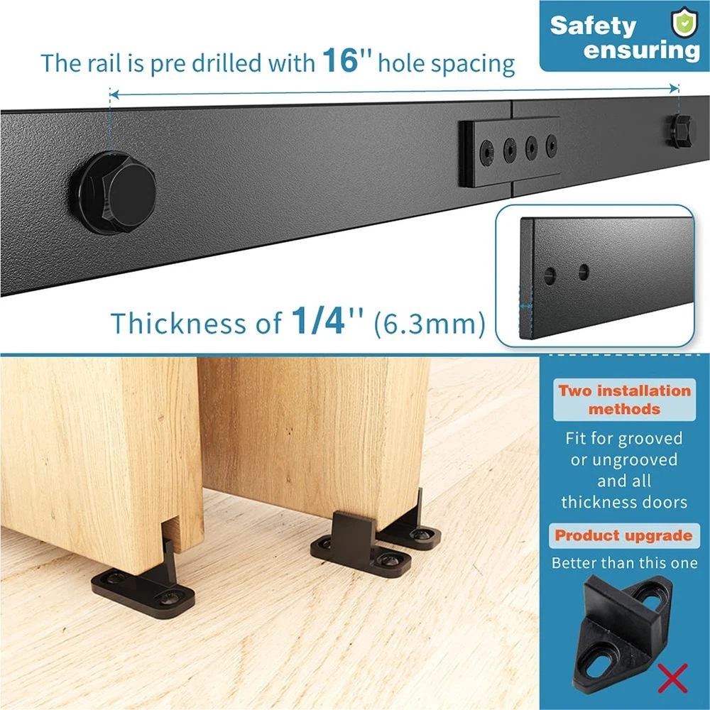 ZEKOO 10FT Single Track Bypass Sliding Barn Door Hardware Kit for Double Doors, Barn Door Bypass Hardware Kit, Flat Track Roller, Low Ceiling (J Shape Hanger) Product Details Size Name: 10 Feet Brand: ZEKOO MPN: GCM5001-1 UPC: Does not apply EAN: Does not apply Brand: ZEKOO Color: Black Material: Steel Style: bypass sliding door hardware Assembly Required: Yes Brand: ZEKOO Color: Black Material: Steel Style: bypass sliding door hardware Assembly Required: Yes Manufacturer: ZEKOO Part Number: GCM5001-1 Item Weight: 25.6 pounds Package Dimensions: 41.5 x 6.3 x 3.6 inches Country of Origin: China Item model number: GCM5000 Is Discontinued By Manufacturer: No Size: 10 Feet Shape: J Shape Installation Method: Screw-In Measurement System: English/Standard Batteries Included?: No Batteries Required?: No Date First Available: September 6, 2018 About Single Track Bypass DesignThis is single track bypass, one track hang 2 doors, the roller diameter is 2-5/8'', so the door will be have 8''-10'' distance door overlap between 2 doors, so each door should be 6'' wider than half the width of the opening, and the 2 rollers will be hit together when one door slide, maybe drive another door slide Single Track Bypass System Upgraded single track bypass sliding barn door hardware is low ceiling design, only need 6 inch ceiling space from top of the door to ceiling; Wall-mounted is very easy to install, no tedious installation steps, no request wall to be twice the width of the opening, suitable for small home space, saves more space than a side pull door and traditional double track bypass kit, can help you finish the project more quickly and easily. Why Choice Bypass Barn Door Hardware Kit1.Roller Bearing is high purity bearing steel Gcr15, made of reinforced steel and electrophoretic, ring fixed structure and external dust cover, prevent steel ball from leaving the locus and oil leakage, keep roller lifetime lubricated; Passed the test of opening - closing for 160000 times, wear-resisting, ensure the stability of the move and the wheel's fluency. 2. Pre-drill 16" apart hole on rail to line up standard studs. Heavy duty construction ensures safetyMaterial thickness up to 1/4 inch (6.3mm) Solid carbon steel (High Standard Q235), multiple high temperature fine electrostatic powder spraying process black frosted,corrosion protection, antirust, anti-scratch. 8.8 grade Self-tapping and roller bolt make our hardware kit can hold total 265 lbs doors comfortably. Door Stopper have rubber covered, good buffer effect, and educe the noise.The hanger wheel surface is covered with nylon, slide very quietly. Single Track Bypass Sliding Barn Door Hardware Package include3 x 3.3FT Rails, 2 x Junction Plate, 8 x spacers, 4 x Rollers, 2 x Door Stops, 4 x anti-jump pad, 2 x Floor Guides, 1 x Installation Manual (step by step with fractional measurements in inch, very easy to install)--Only barn door hardware for sale, barn door is not include. Fit for 1-3/8" to 1-3/4" door thickness, can't more than 1-3/4". we will provide the proper bolt and spacer to you for other thickness doors you need contact us. Service AssuranceThe price is because we have better products, make the product more durable. ZEKOO ensure you will get everything you need in a timely manner,we will send you the replacement at first time if missed or broken parts, any problem in using it, our professional staff of the barn door hardware will answer questions for you.