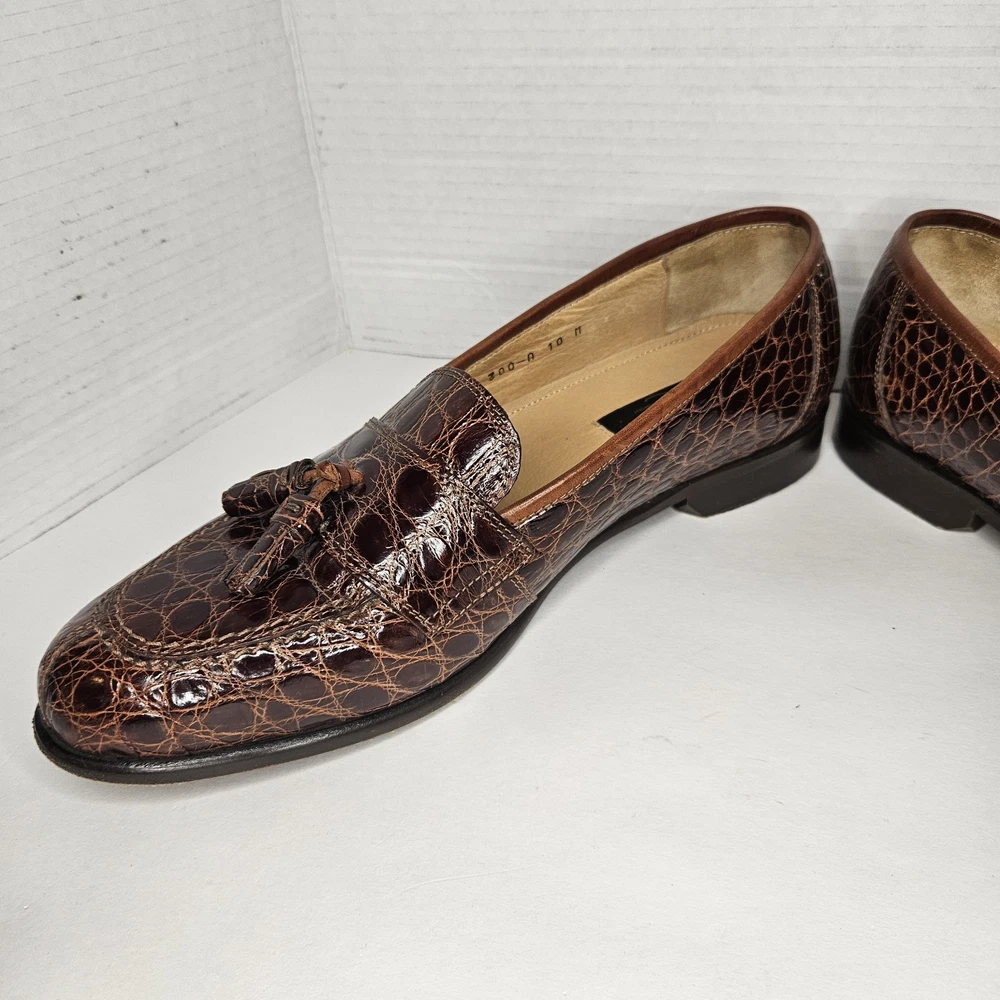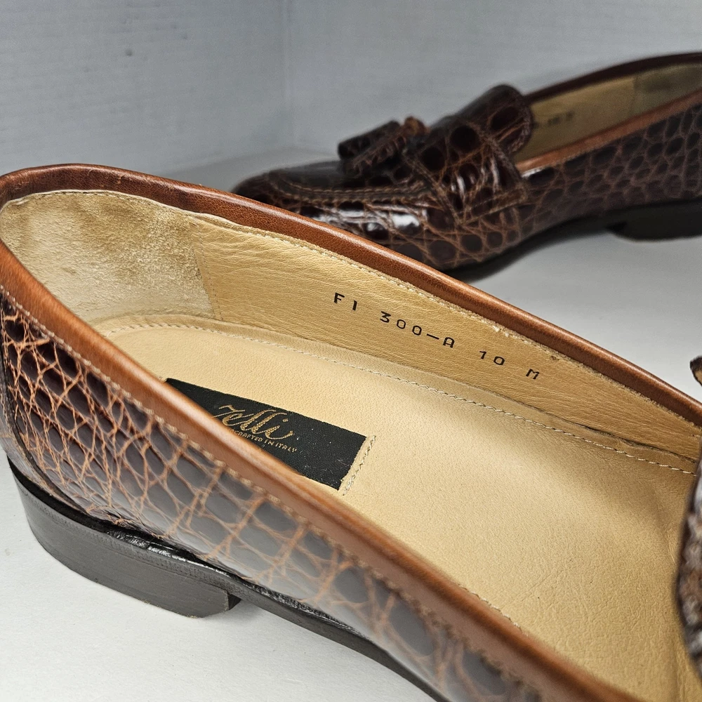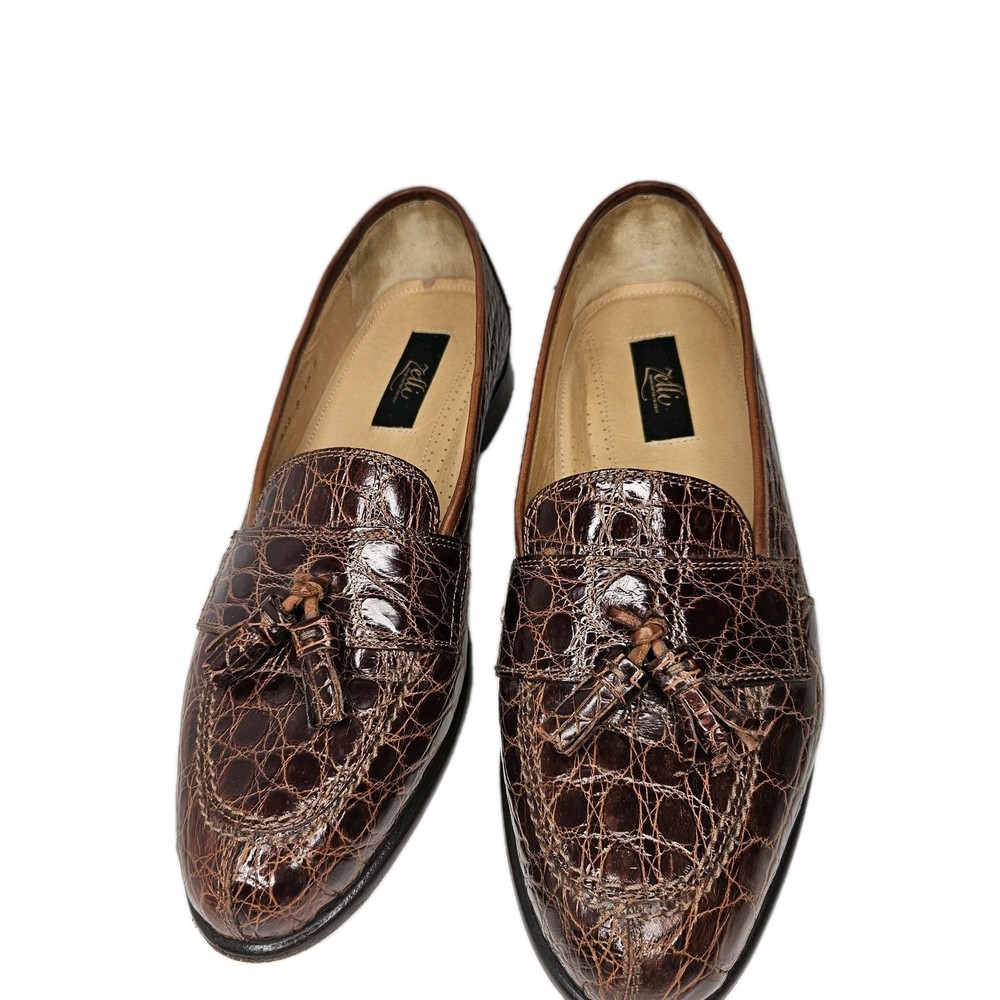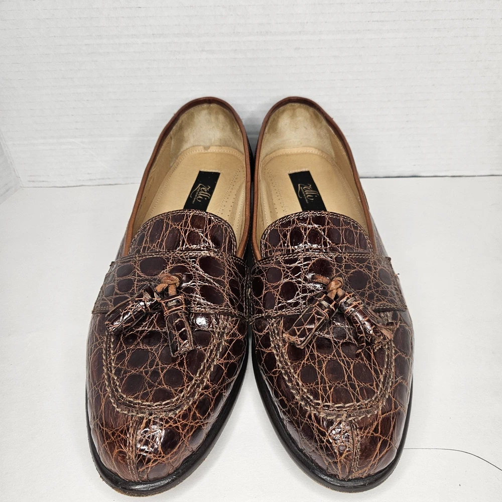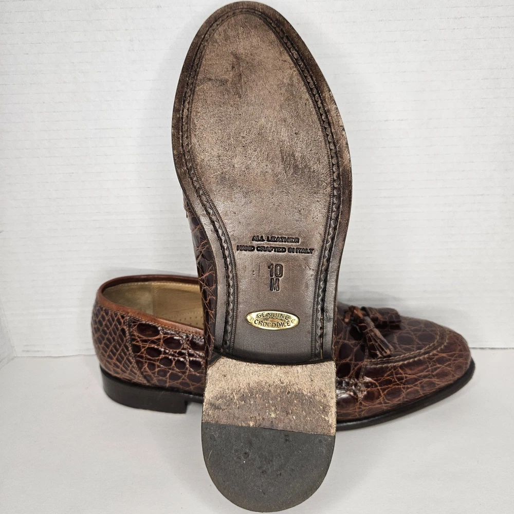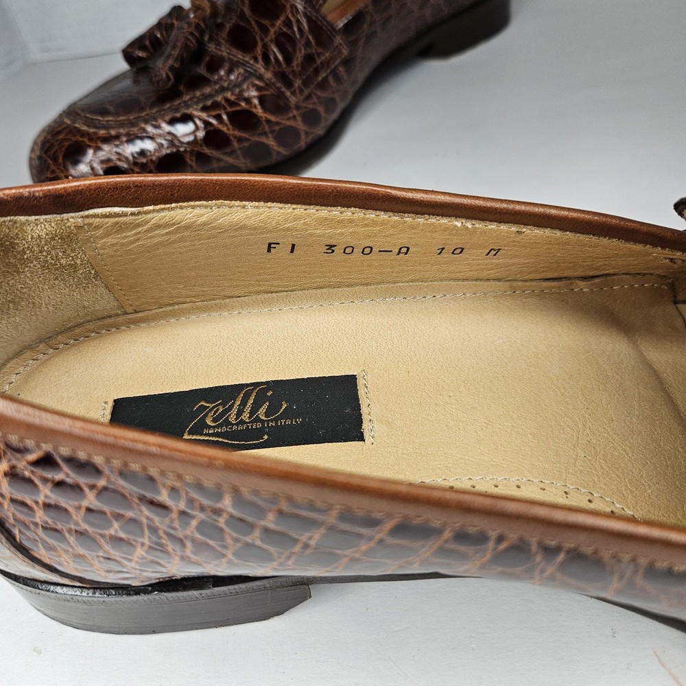 Authentic Zelli men’s luxury loafers crafted from genuine crocodile leather and handcrafted in Italy. These elegant tassel loafers feature rich brown exotic leather with a high-gloss finish, classic penny/tassel loafer styling, and premium leather lining and sole. Marked “Genuine Crocodile” on the sole and “All Leather – Handcrafted in Italy”, confirming authenticity and craftsmanship. A rare and highly sought-after style from one of the world’s most prestigious men’s luxury brands. Details: Brand: Zelli Material: Genuine Crocodile Leather Style: Tassel Loafer / Dress Shoe Color: Brown Size: Men’s 10 M Made in Italy Leather lining and sole Slip-on design Condition Notes: Pre-owned with normal wear consistent with light use. Some surface creasing and sole wear present (see photos for exact condition). Minor print transfer on insole from aftermarket insoles that were worn with these (see photos). No structural issues noted. Perfect for collectors, luxury fashion enthusiasts, or anyone looking to own an elite Italian exotic leather shoe at a fraction of retail. 📦 Ships carefully packaged 📸 Please review all photos — they are part of the description ❓ Message with any questions before purchase