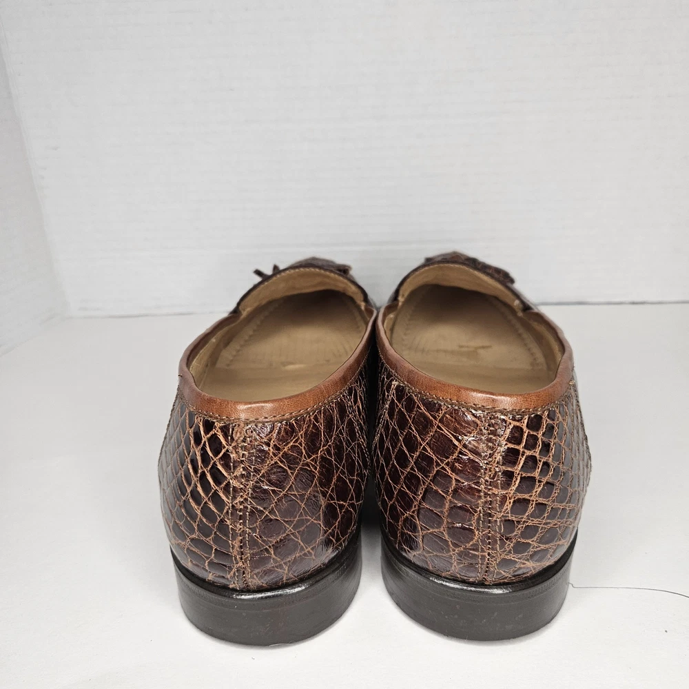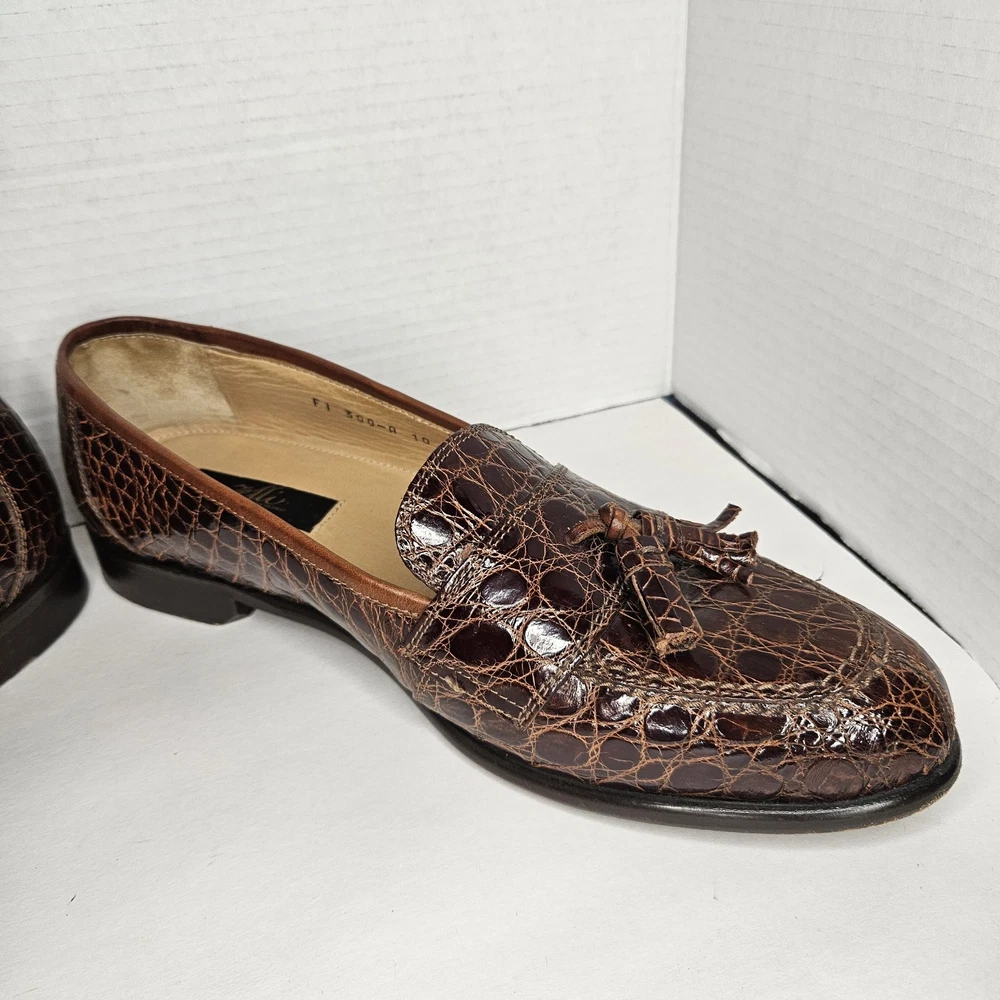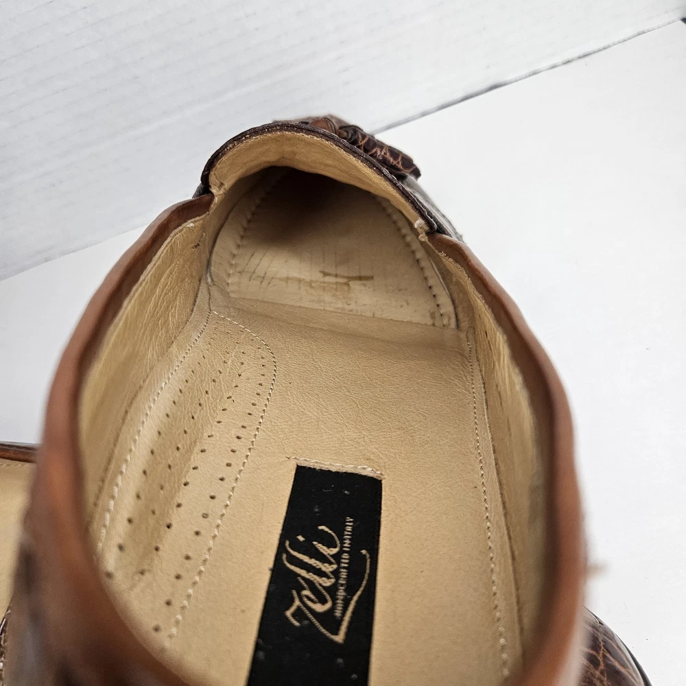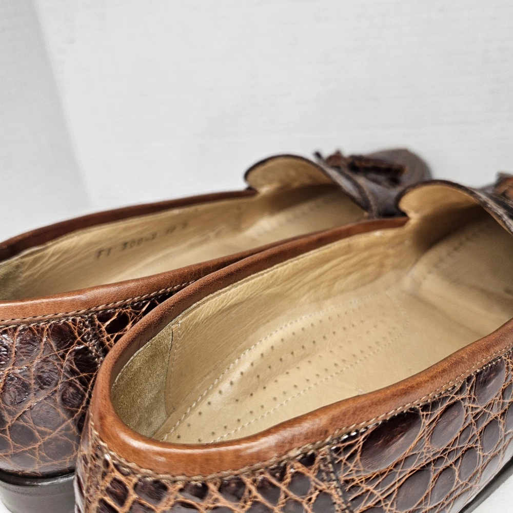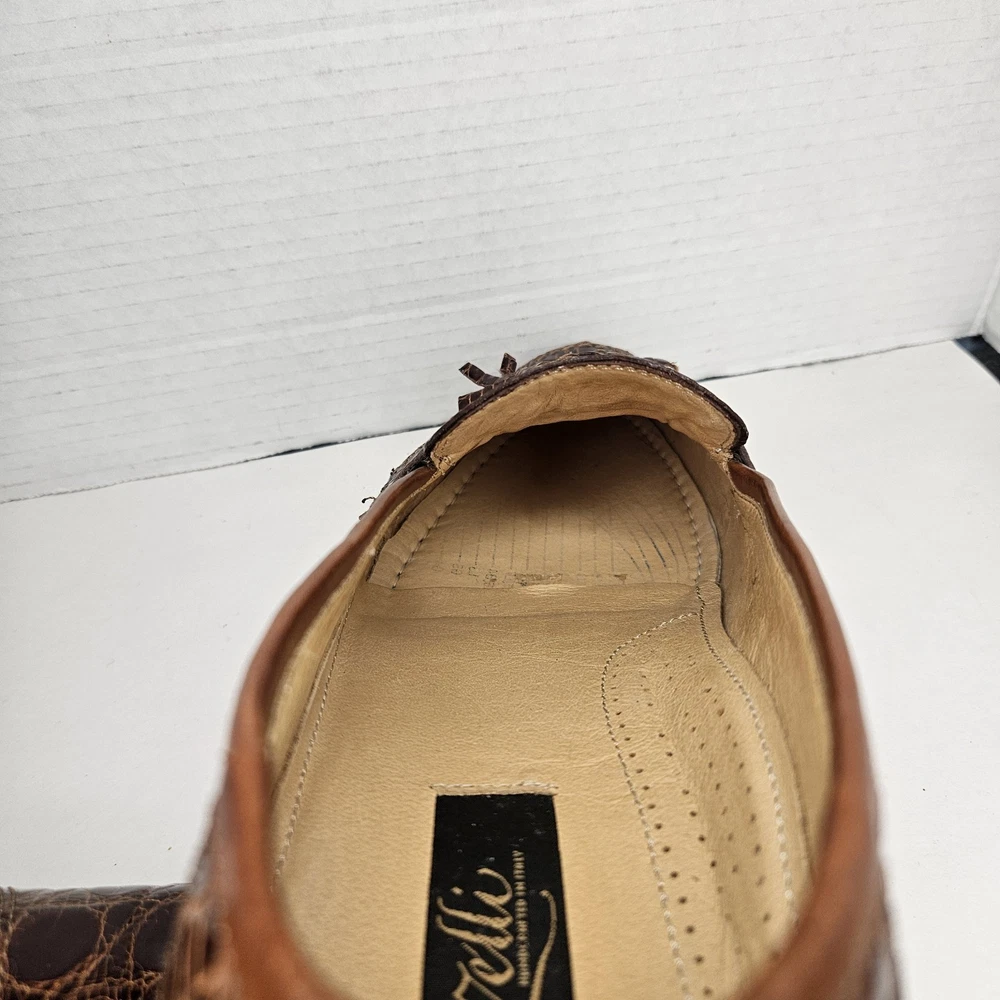 Authentic Zelli men’s luxury loafers crafted from genuine crocodile leather and handcrafted in Italy. These elegant tassel loafers feature rich brown exotic leather with a high-gloss finish, classic penny/tassel loafer styling, and premium leather lining and sole. Marked “Genuine Crocodile” on the sole and “All Leather – Handcrafted in Italy”, confirming authenticity and craftsmanship. A rare and highly sought-after style from one of the world’s most prestigious men’s luxury brands. Details: Brand: Zelli Material: Genuine Crocodile Leather Style: Tassel Loafer / Dress Shoe Color: Brown Size: Men’s 10 M Made in Italy Leather lining and sole Slip-on design Condition Notes: Pre-owned with normal wear consistent with light use. Some surface creasing and sole wear present (see photos for exact condition). Minor print transfer on insole from aftermarket insoles that were worn with these (see photos). No structural issues noted. Perfect for collectors, luxury fashion enthusiasts, or anyone looking to own an elite Italian exotic leather shoe at a fraction of retail. 📦 Ships carefully packaged 📸 Please review all photos — they are part of the description ❓ Message with any questions before purchase