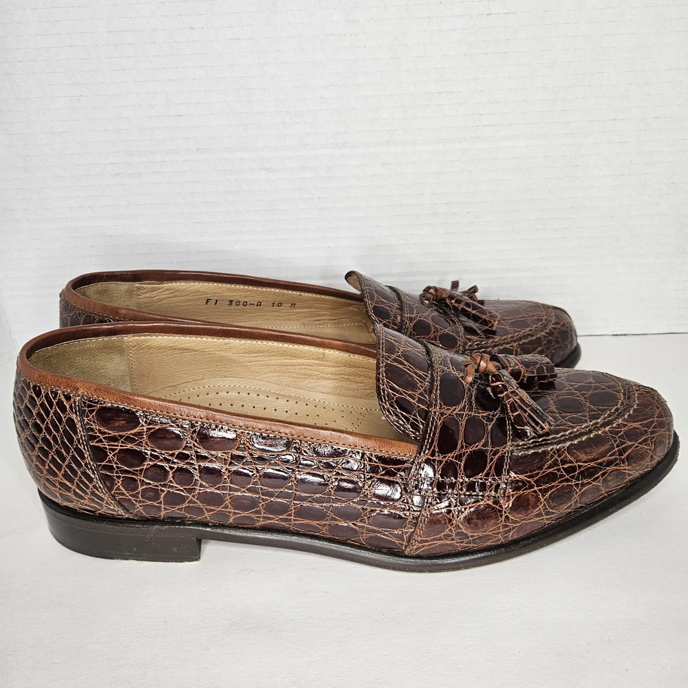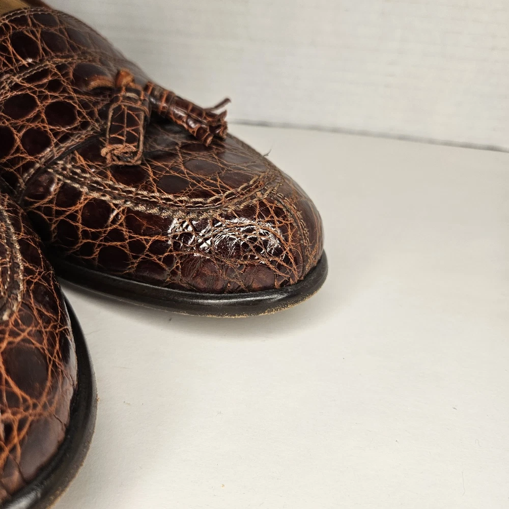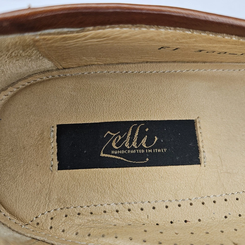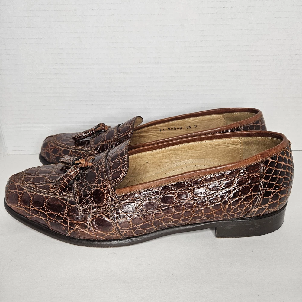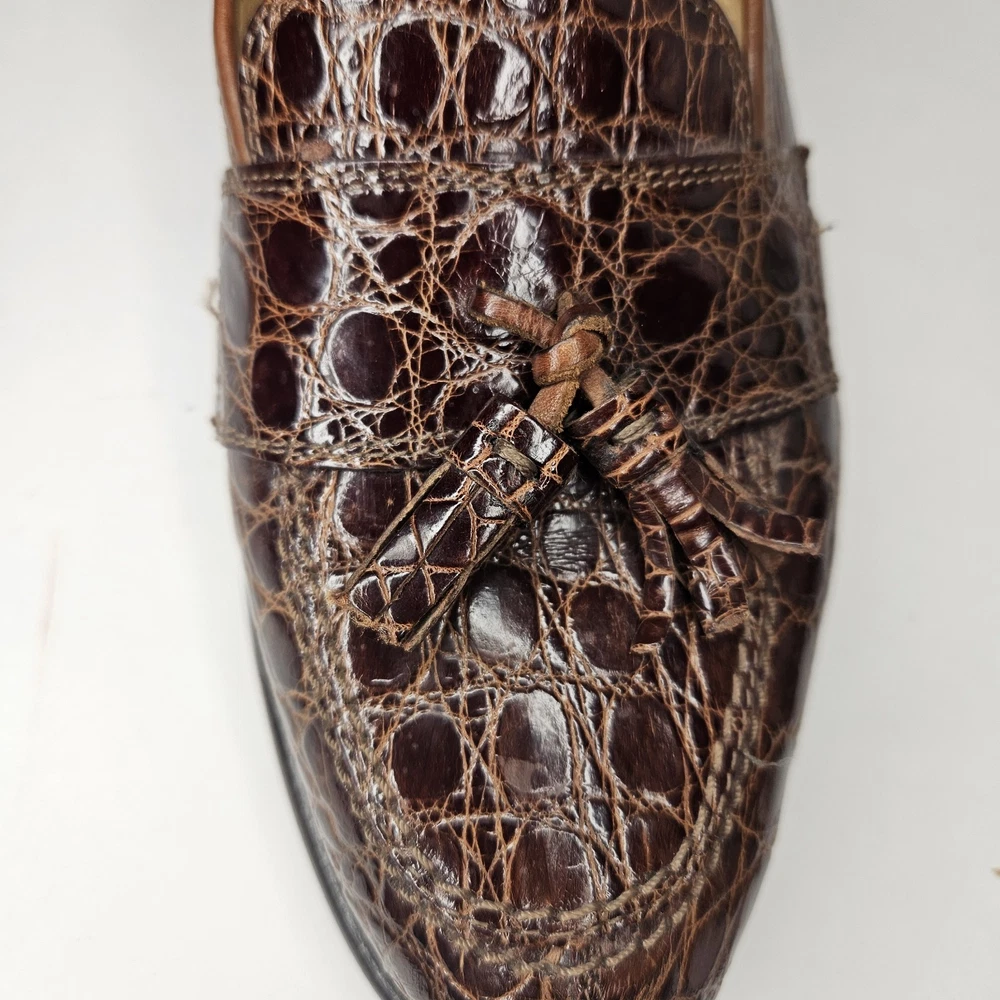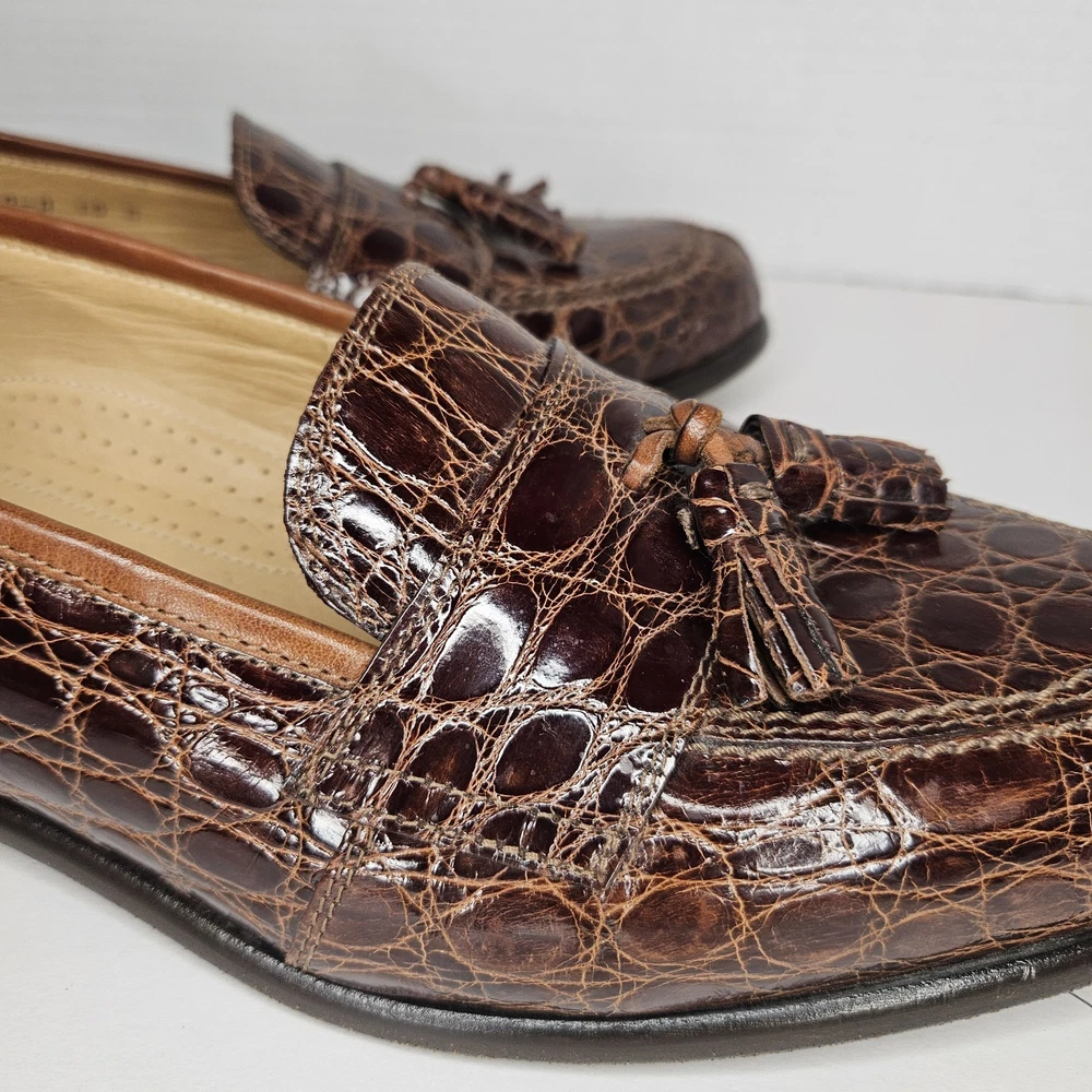 Authentic Zelli men’s luxury loafers crafted from genuine crocodile leather and handcrafted in Italy. These elegant tassel loafers feature rich brown exotic leather with a high-gloss finish, classic penny/tassel loafer styling, and premium leather lining and sole. Marked “Genuine Crocodile” on the sole and “All Leather – Handcrafted in Italy”, confirming authenticity and craftsmanship. A rare and highly sought-after style from one of the world’s most prestigious men’s luxury brands. Details: Brand: Zelli Material: Genuine Crocodile Leather Style: Tassel Loafer / Dress Shoe Color: Brown Size: Men’s 10 M Made in Italy Leather lining and sole Slip-on design Condition Notes: Pre-owned with normal wear consistent with light use. Some surface creasing and sole wear present (see photos for exact condition). Minor print transfer on insole from aftermarket insoles that were worn with these (see photos). No structural issues noted. Perfect for collectors, luxury fashion enthusiasts, or anyone looking to own an elite Italian exotic leather shoe at a fraction of retail. 📦 Ships carefully packaged 📸 Please review all photos — they are part of the description ❓ Message with any questions before purchase