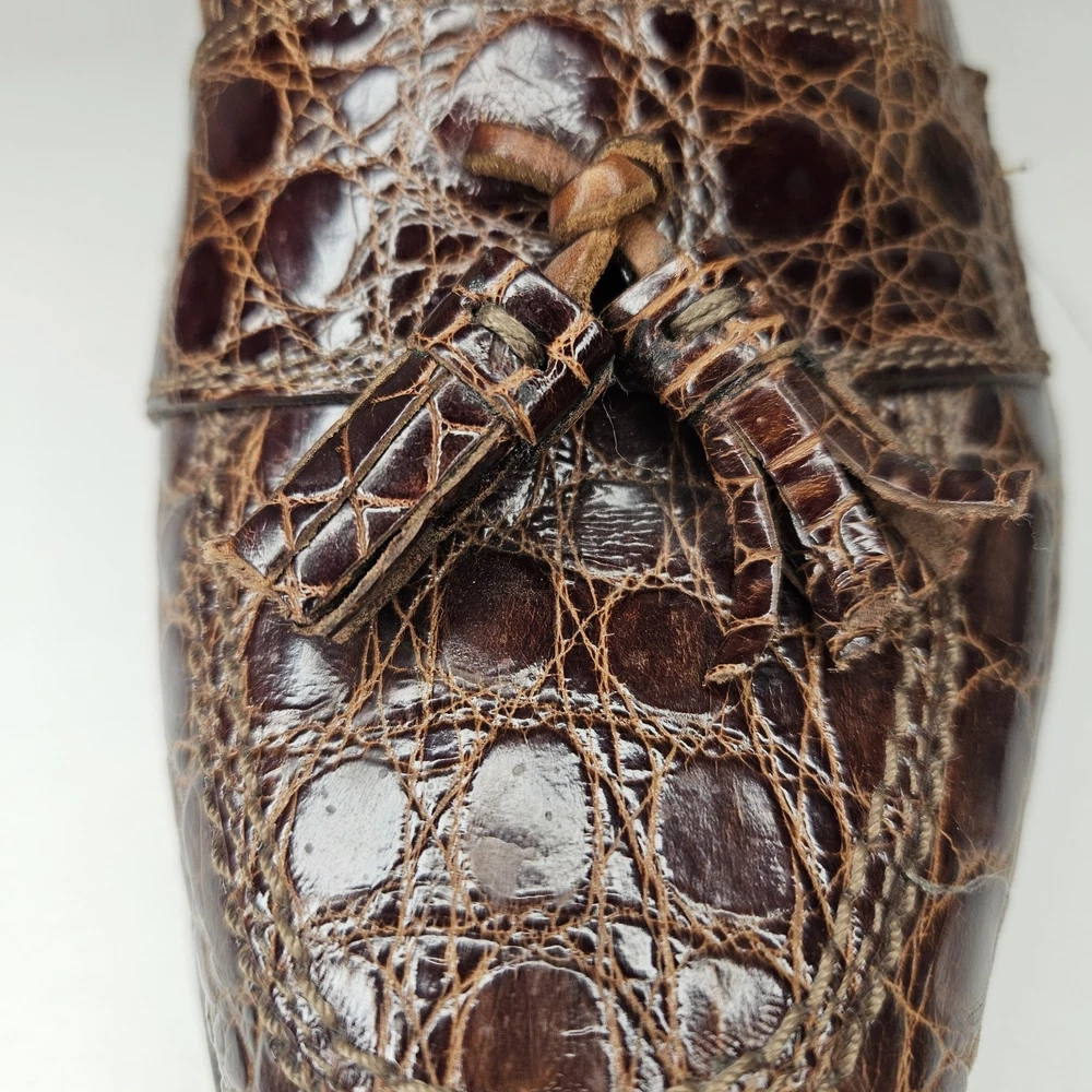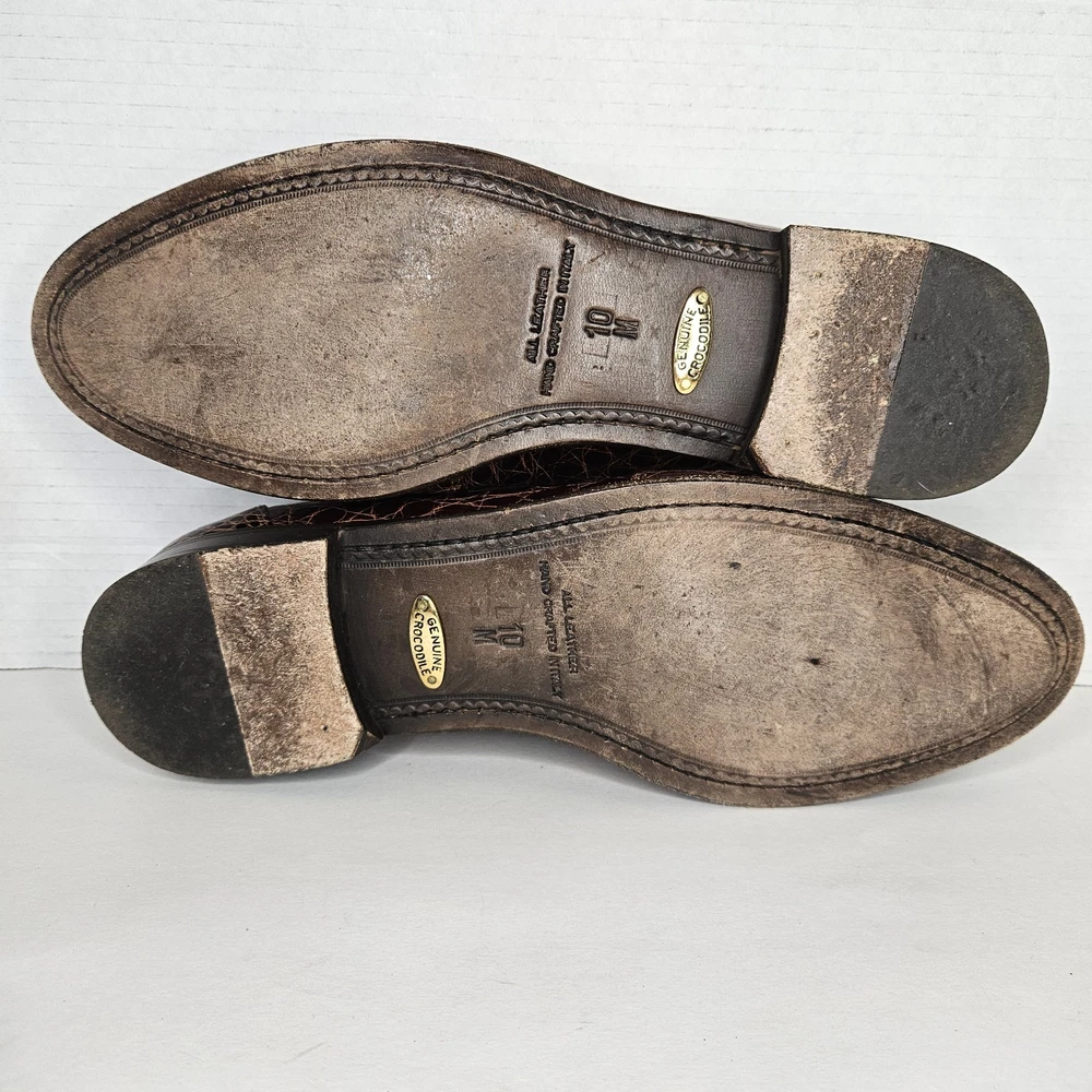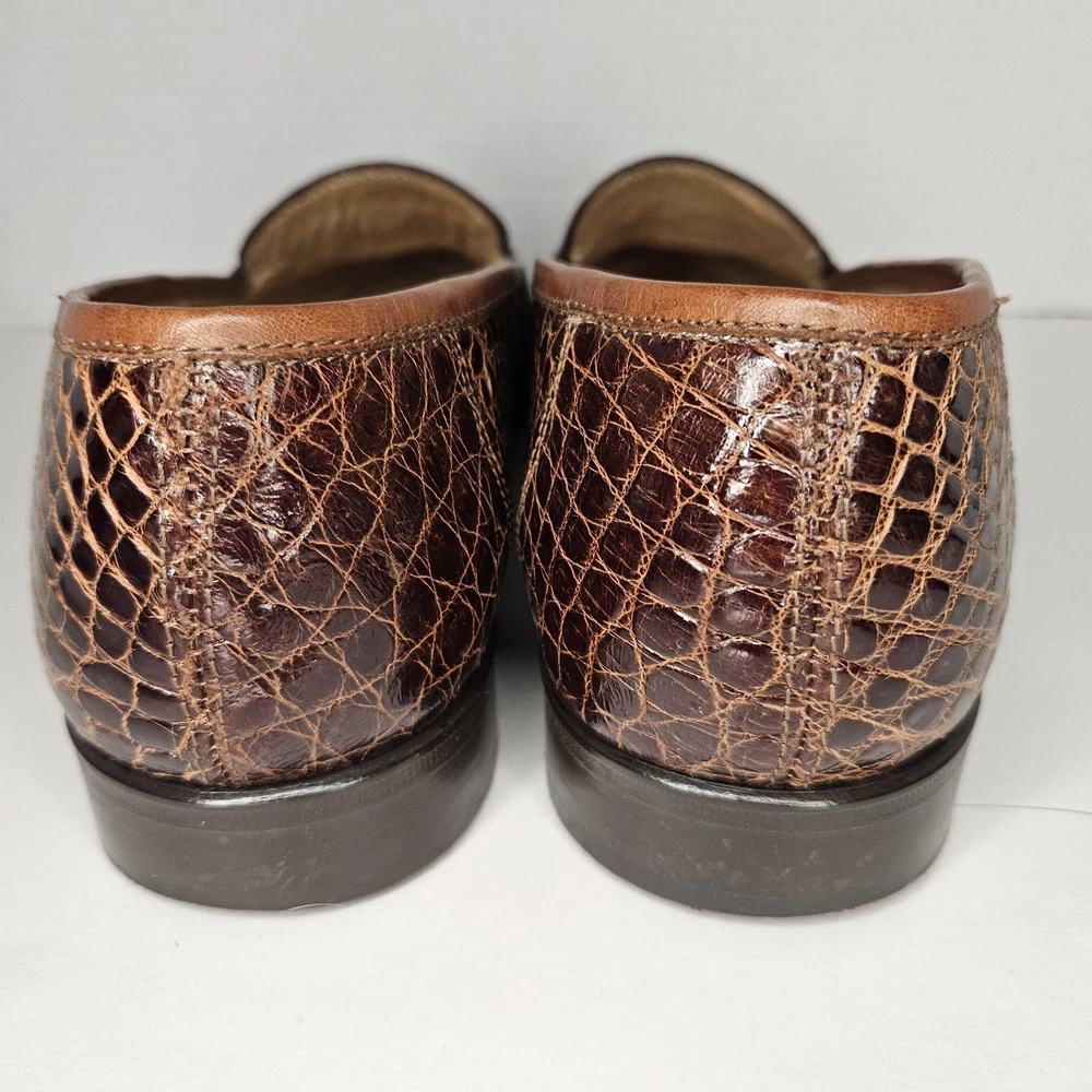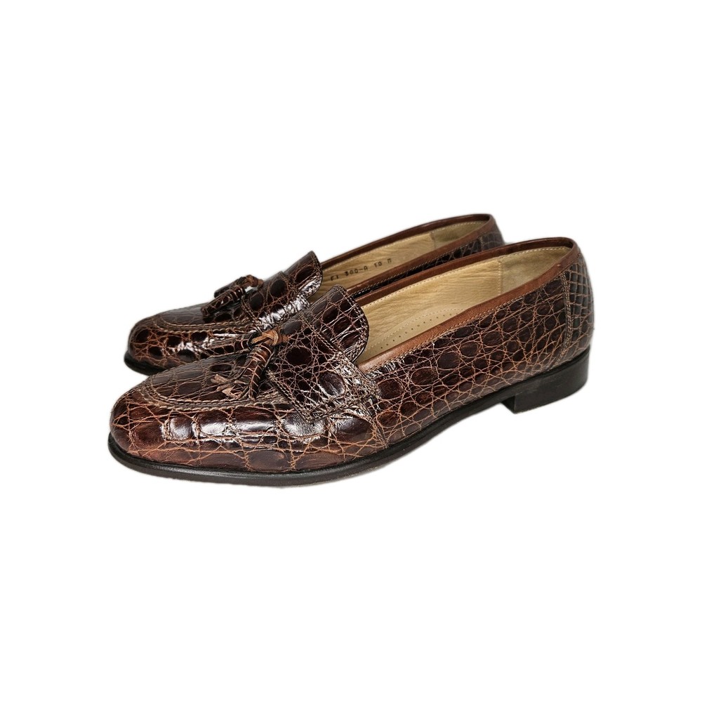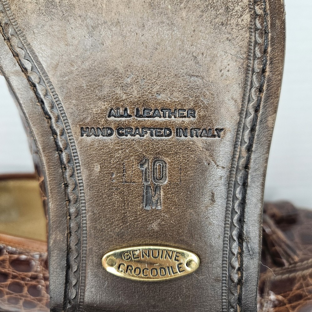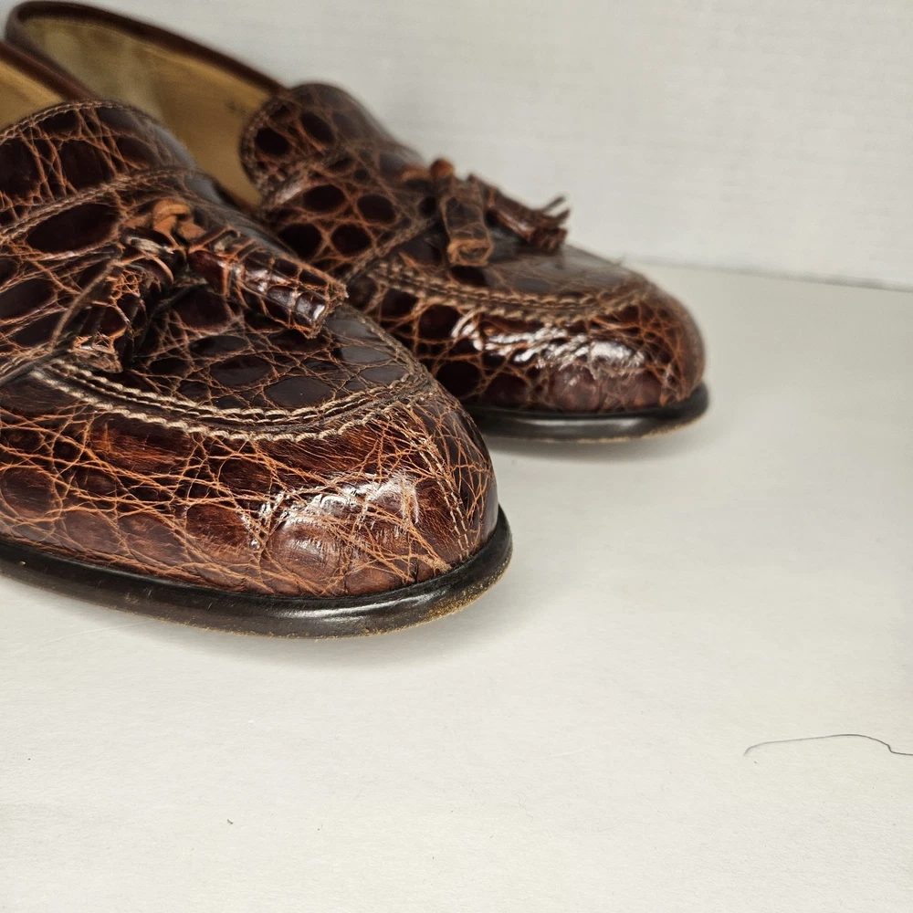 Authentic Zelli men’s luxury loafers crafted from genuine crocodile leather and handcrafted in Italy. These elegant tassel loafers feature rich brown exotic leather with a high-gloss finish, classic penny/tassel loafer styling, and premium leather lining and sole. Marked “Genuine Crocodile” on the sole and “All Leather – Handcrafted in Italy”, confirming authenticity and craftsmanship. A rare and highly sought-after style from one of the world’s most prestigious men’s luxury brands. Details: Brand: Zelli Material: Genuine Crocodile Leather Style: Tassel Loafer / Dress Shoe Color: Brown Size: Men’s 10 M Made in Italy Leather lining and sole Slip-on design Condition Notes: Pre-owned with normal wear consistent with light use. Some surface creasing and sole wear present (see photos for exact condition). Minor print transfer on insole from aftermarket insoles that were worn with these (see photos). No structural issues noted. Perfect for collectors, luxury fashion enthusiasts, or anyone looking to own an elite Italian exotic leather shoe at a fraction of retail. 📦 Ships carefully packaged 📸 Please review all photos — they are part of the description ❓ Message with any questions before purchase