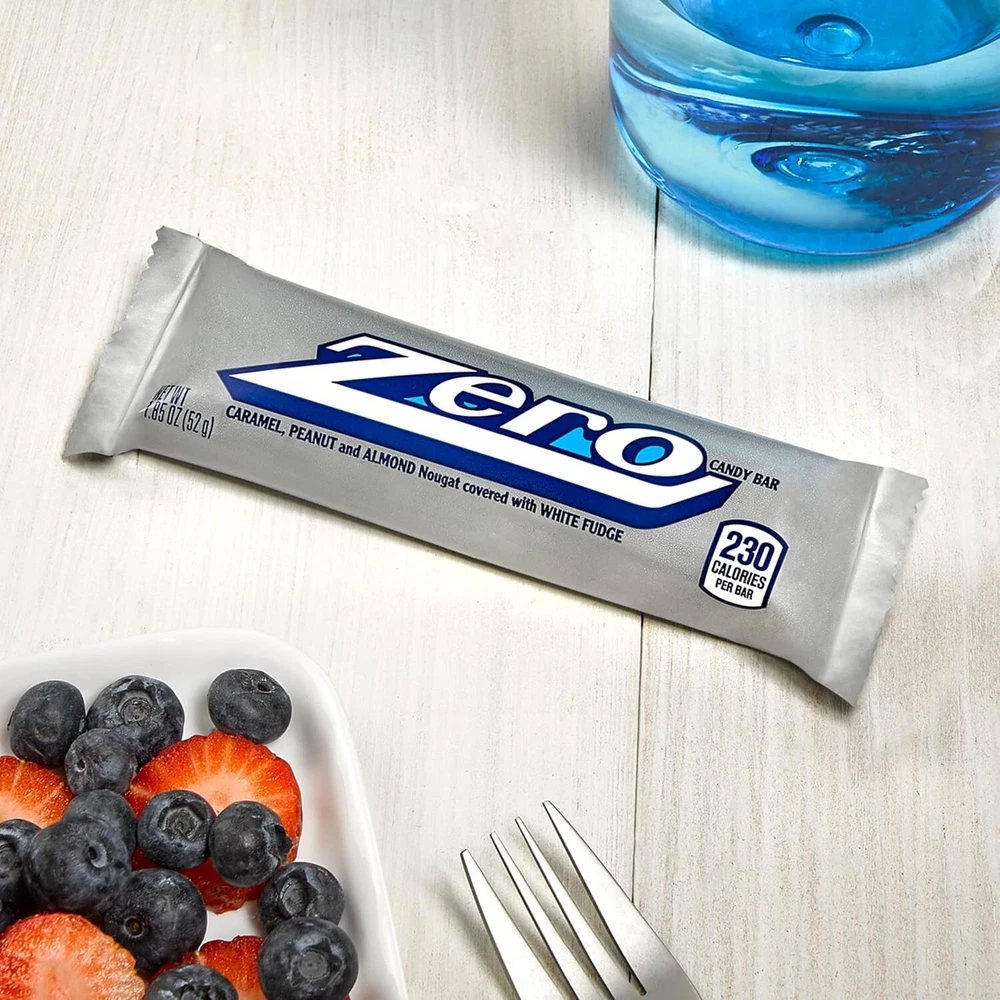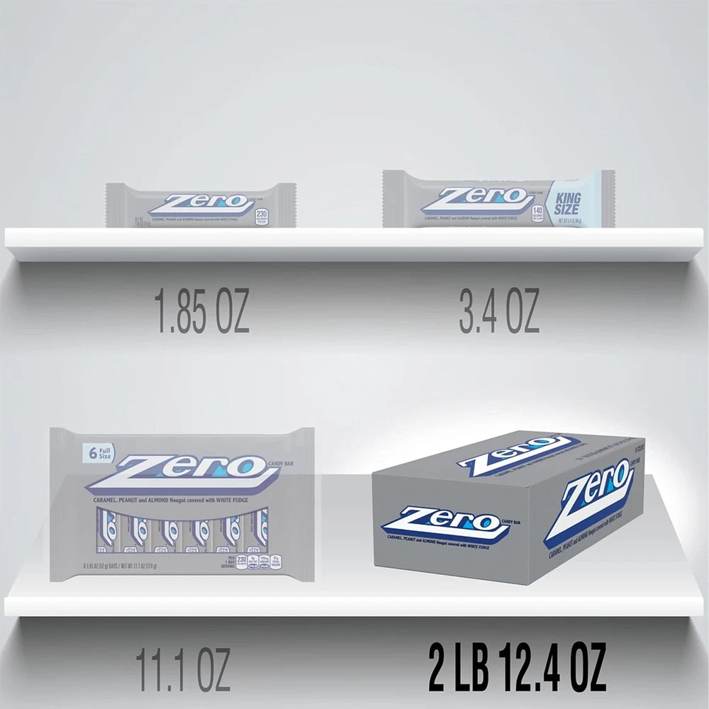 Contains twenty-four (24) 1.85-ounce ZERO White Fudge, Caramel, Peanut and Almond Nougat Candy Bars in a box An out-of-this-world white fudge nougat candy bar jam packed with creamy caramel, crunchy peanuts and almonds to enjoy as a dessert or tasty treat Individually wrapped kosher candy bars to entertain your party guests and stock your pantry Offer delicious ZERO candy bars for birthdays, retirement parties, graduations, special celebrations and everyday moments Enjoy ZERO candy bars full of white fudge and almond nougat flavor as the perfect Easter, Christmas, Valentine's Day or Halloween candy selection