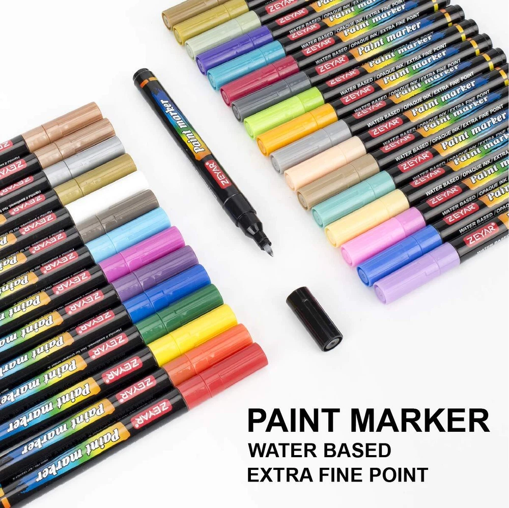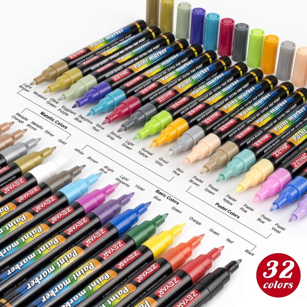 ZEYAR is a professional art&crafts artwork manufacturer The world of science is full of many beautiful colors! Some of the colors in our world cannot be seen with just your eyes, but we are trying to give you more colors for your options. Vibrant 32 colors: This size pen is ideal for the detailing and outlining you're likely to do. Made with Water-Based ink and Acrylic material tips, which can help create a colorful world, give you more options to improve your imagination. Excellent quality: Advanced valve-action structure inside the marker. Non-toxic, xylene free and safe to use. Conforms to ASTM D-4236 certificate. Nearly any surface for drawing: Suitable for rocks, canvas, paper, wood, metal, glass, plastic, leather and so on. No Fuss, No Mess & No Worries Recap after use and no food contact. USA Brand ZEYAR. SHAKE WELL BEFORE USE, GREAT IMPROVEMENT: Larger Capacity, Longer Writing Distance, Easier Marker Shaking, More Comfortable Holding Valve Mechanism: Great control of ink and gas, High-Technology, Archival Quality 32 vibrant colors: Basic Colors: Black, White, Blue, Red, Yellow, Dark Green, Light Green, Pink, Violet, Orange, Brown, Grey, Light Brown, Chocolate; Pastel Colors: Pastel Yellow, Pastel Pink, Pastel Blue, Pastel Violet, Pastel Green; Metallic Colors: Gold, Silver, Metal Blue, Metal Violet, Metal Red, Metal Green, Metal Pink, Metal Turquoise, Metal orange, Metal dark grey, Metal bronze, Metal brown, Metal dark green Ink properties: Waterproof and Sunproof, Fade-resistant after totally dry, quick-drying, Environmental friendly. Conforms to ASTM D-4236 certificate, non-toxic and acid free. But don't swallow it and No food contact Smooth Writing: Writes on nearly all smooth surfaces with your imagination and creation, allowing you to easily write on paper, stone, rubber, ceramics, wood, glass, plastic! Not suitable for porous and rough surfaces