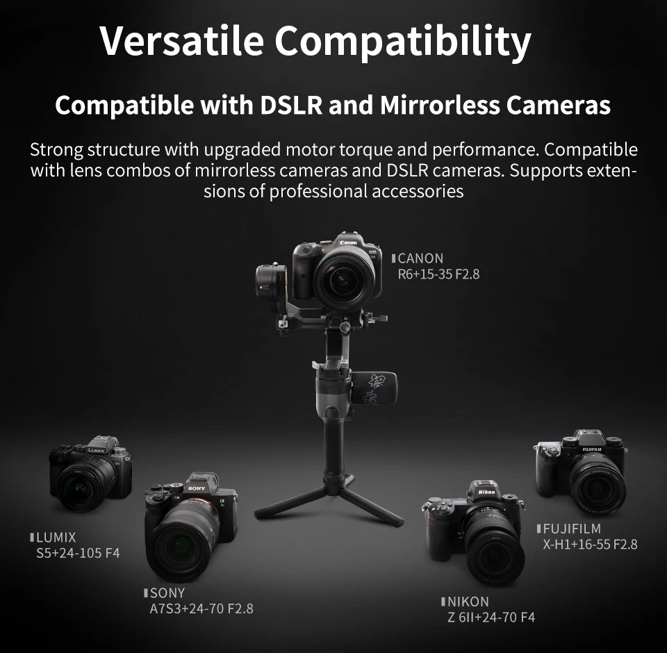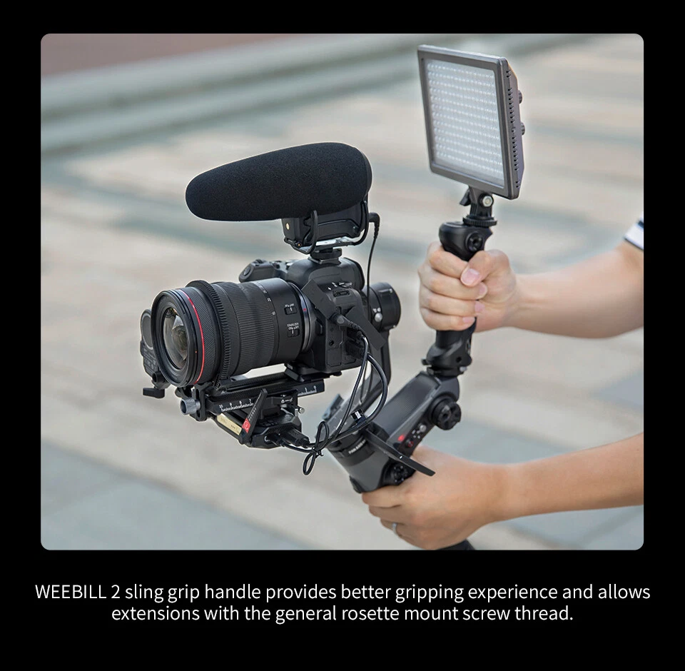 Product Description Professional 3-Axis Stabilizer Introducing a stabilizer with quick responsiveness, brand new touch screen and advanced operation logic. WEEBILL 2 - A stabilizer strives to create a better experience for users in filmmaking with its effort-saving sling structure, powerful Infineon chip, upgraded algorithm and new image transmission experience. The outstanding grip function facilitates low-angle shooting and is suitable for comfortable, extended-hours operation. Versatile Focus Control Wheel Creative Shooting Features Convenient Fast Charge Battery Transmission & More About ZHIYUN ZHIYUN Tech is a pioneer and a world leader in gimbals and stabilizers for both professional filmmakers and personal video creators. ZHIYUN believes in innovation as the primary productive force, keeps making breakthroughs, and pushes forward technological and industrial development. Its product line ranges from professional to consumer gimbals. ZHIYUN is dedicated to arduous research and innovation for delivering a better experience for global filmmakers and video content creators. 2.88" Full-color Touch Screen The first gimbal to incorporate a feature-rich 2.88 inch, full-color, flip-out HD touchscreen allowing for full command. The intuitive, rotatable, and retractable interface allows for heightened user interaction as well as parameter adjustment and footage monitoring in a few taps for uninterrupted shooting. Unique Robust Build Combines well-crafted lines with the artistic structure to bring the new stabilizer into life. A creative rotatable flip-out touch screen to make every feature and operation easier. Infineon Vector-Splitting Sensor The sensor will analyze the complex interruptions, improve stability with its core algorithm and precisely compensate any micro-jittery, providing a smoother follow and quicker response for the stabilizer. Classic & Effort-saving Design With the classic structure and sling grip design in WEEBILL series, an effort-saving sling mode is within reach with no extensions added and structure altering. Boosted Ergonomic Industrial Design Operation Voltage:9.8V一12.6V Output Voltage:5V Operation Current:160mA-6000mA Charging Time: 1.6h (24W PD Fast Charge) Runtime:9h Tilt Angle Range:-80°- 160° Roll Angle Range:-35°- 35° Pan Angle Range:-80°-180° ZHIYUN Weebill 2 Combo Packing List 1/ WEEBILL 2 is designed for mainstream mirrorless and DSLR camera and lens combinations, for example, Sony's A7III+FE 24-70mm F2.8 or the Canon 5D4+EF 24-70mm F2.8. 2/ Tripod 3/ Quick Release Plate 4/ Backing Base 5/ Lens Support 6/ Lens Support Screw 7/ Quick Start Guide (International) 8/ Tripod 9/ Panasonic Camera Control CableL LN-UCUC-A02, Canon Camera Control Cable LN-MBUC-A02, Sony Camera Control Cable LN-UCUS-A03, Canon Camera Control Cable LN-NBUC-AOI, USB Type-C Cable 10/ WEEBILL Carrying Case Camera Compatibility List Sony A9 II, A9, A7R IV, A7R III, A7 III, A7S III, A7R II, A7M II, A7S II, A7C, A6600, A6500, A6400, A6300, A6100 Panasonic G9, GH5, GH5S, S1, S5, S1H, BGH1, GH3 Canon EOS 5D Mark III, EOS 5D Mark IV, EOS 5DS R, EOS 5DS, EOS 6D Mark II, EOS 6D, EOS 80D, EOS 90D, EOS M50, EOS R, EOS R6, EOS R5, EOS M6 II, G7X 3, EOS RP, EOS 77D, EOS 800D Nikon D850, D780, Z5, Z6, Z7, Z6II, Z7II, Z50 Olympus E-M1 II FUJIFILM X-T3, X-T4, X-T20, X-T30 Z CAM Z CAM E2 Blackmagicdesign BMPCC 4K, BMPCC 6K Sigma FP Support PD Fast Charge & Long Lasting Usage】PD fast charge powers up your Weebill 2 7800mAh batteries from Zero to Full within 100mins. Weebill 2 Gimbal can be run up to 8 hours, and it supports general NP-F external battery to extend runtime. 【New Infineon Chip】Built-in powerful Infineon chip with dynamic stabilization provides a smoother follow and quicker response for the stabilizer. 【Effort-saving Sling Grip】With the classic structure and sling grip design in WEEBILL series, an effort-saving sling mode is within reach with no extensions added and structure altering. Easy to switch portrait modes and works great when shooting low angles. 【2.88" Full-Color Flip-out Touch Screen】Integrated 2.88" LCD touch screen allows you to tap to adjust parameters and other settings at any time. 【Wider Compatibility】Compatible with DSLR and mirrorless cameras, Sony A9, A9 II, A7R IV, A7R III, A7 III, A7S III, A7C, A6600, A6500, A6400, A7S, Nikon z6, z7, z50, D780, D850, EOS r, r6, r5, RP, 6D Mark II, 5D Mark III, 5D Mark IV, 6D, 77D, 800D, 80D, 5DS R, M6 Mark II, 90D, 200D Mark II, Panasonic GH5, GH5S, G9, S1, S1H, GH4, Fujifilm X-H1, X-T2, X-T3, X-T4, X-T30, X-E3, BMPCC 6K, Sigma FP, Olympus E-M1 II, Z CAM E2. ZHIYUN CINEPEER Weebill 3E[Official], 3-Axis Lightweight Gimbal Stabilizer 249.0 USD Free shipping ZHIYUN Weebill 3S [Official] Gimbal Stabilizer for DSLR and Mirrorless Camer 243.9 USD Free shipping Zhiyun Crane M2S COMBO 3-Axis Handheld Gimbal Stabilizer for Smartphone Cameras 107.1 USD Free shipping ZHIYUN WEEBILL 2 combo, 3-Axis Gimbal Stabilizer for DSLR and Mirrorless Camera 156.21 USD Free shipping Zhiyun Crane-M3S 3-Axis Handheld Gimbal Stabilizer for Mirrorless Camera 299.0 USD Free shipping