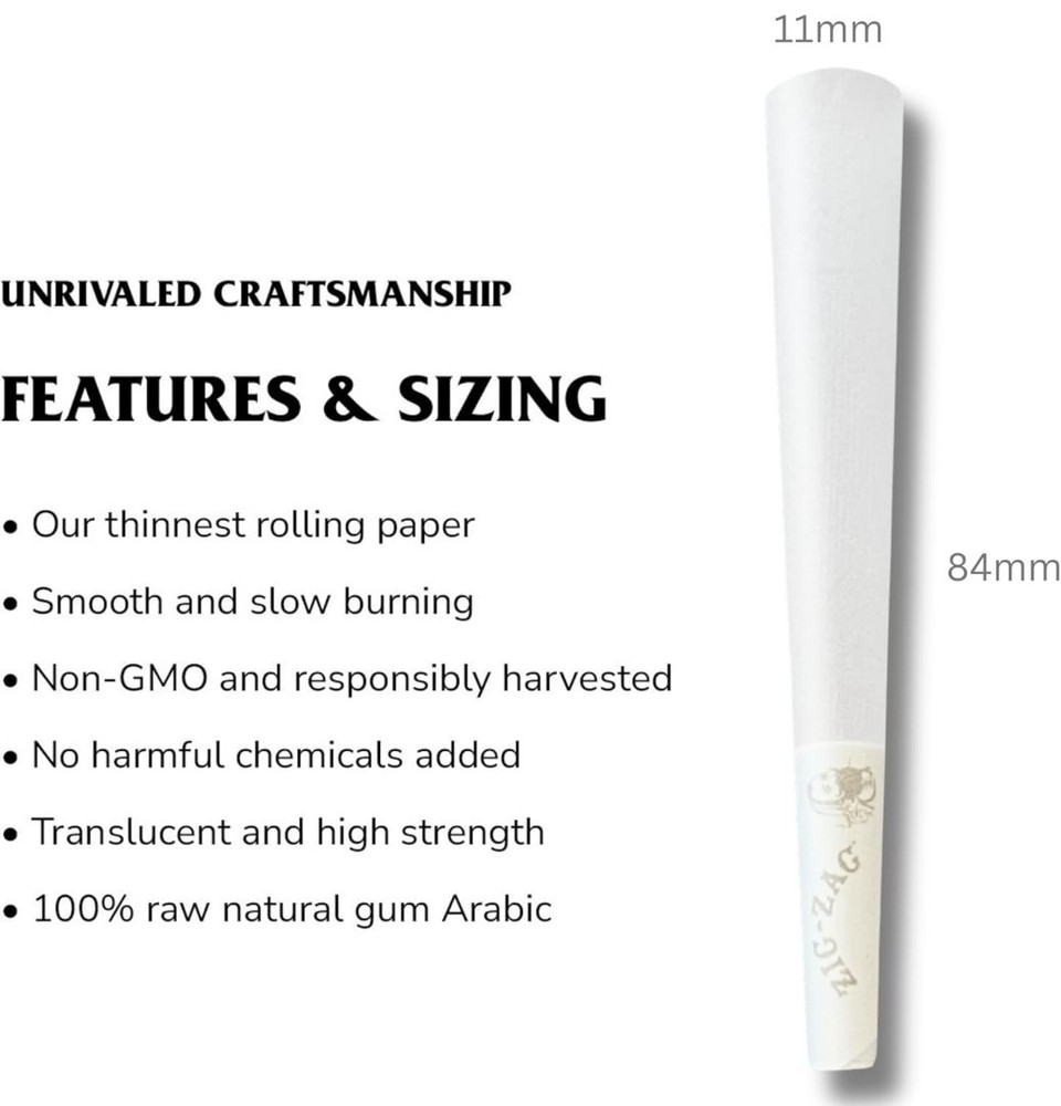 Brand: ZIG-ZAG Material: Flax Material Feature: Plant Based, Vegan Sheet Count: 144 Sheet Size: 1 1/4 Inches Product Dimensions: 3.31"L x 1.25"W PREMIUM PRE-ROLLED CONES: Zig Zag 1 ¼ Size Cones are crafted from natural flax fibers, offering top-quality rolling papers in a convenient pre-rolled format. These ultra-thin cones save time and effort, perfect for both novice and experienced users. Each cone features Zig Zag's patented watermark, ensuring a smooth, even burn and preventing runs. The translucent natural white color showcases the paper's thinness, while the unique cone shape promotes consistent intensity from start to finish. EASY-TO-USE DESIGN: Experience the ultimate convenience with Zig Zag pre-rolled cones. Simply fill with your preferred smoking material, twist the end, and enjoy. These cones are ideal for those who find hand-rolling challenging or want to optimize their time. The 1 ¼ size measures 84mm in length with a 26mm tip diameter, holding up to 2 grams depending on the substance's texture. Each pack contains 24 ready-to-use cones, eliminating the need for rolling skills. SLOW BURN AND SMOOTH EXPERIENCE: Zig Zag rolling papers are renowned for their quality and ability to create memorable experiences. The ultra-thin construction allows for a slow, even burn, enhancing the flavor of your smoking material. The cone shape design ensures a consistent burn from beginning to end, maintaining the same strength and efficiency with each puff. Enjoy a smoother, more satisfying smoke with these expertly crafted cones. ALL-NATURAL MATERIALS: Unlike some competitor brands, Zig Zag cones are made from a blend of natural plant fibers and finished by hand. The company prioritizes quality, using a gum that takes 24 hours to dry during production. This meticulous process results in superior cones that provide a clean, pure smoking experience. Rest assured that you're using a product free from harmful chemicals or additives, focusing solely on enhancing your smoking ritual. CONVENIENT PACKAGING: Each pack of Zig Zag Ultra-Thin Pre-Rolled Cones contains 24 classic 1 ¼ size cones, perfectly suited for individual use or sharing with friends. The crushproof box design ensures your cones remain intact and ready for use, even when stored in a pocket or bag. With Zig Zag's commitment to quality and convenience, you'll always have a reliable and enjoyable smoking option at your fingertips. Choose the brand trusted by smokers for generations.