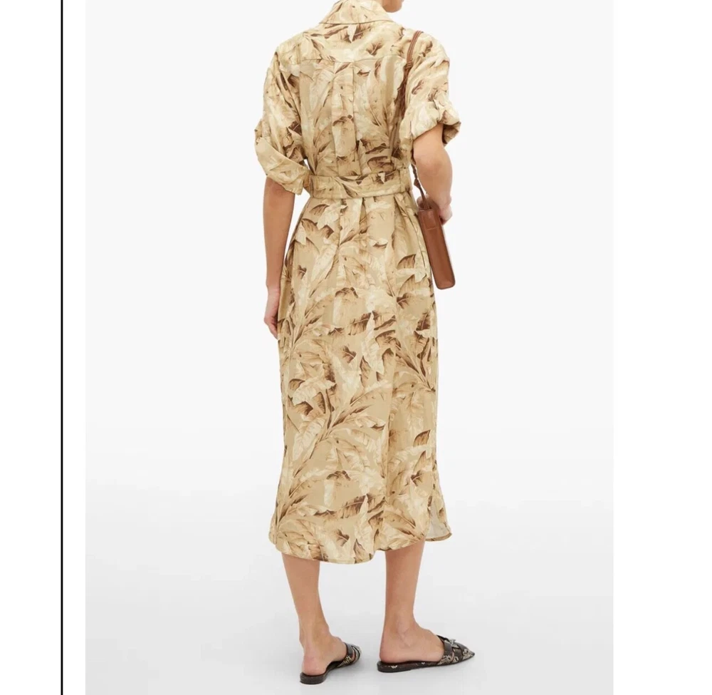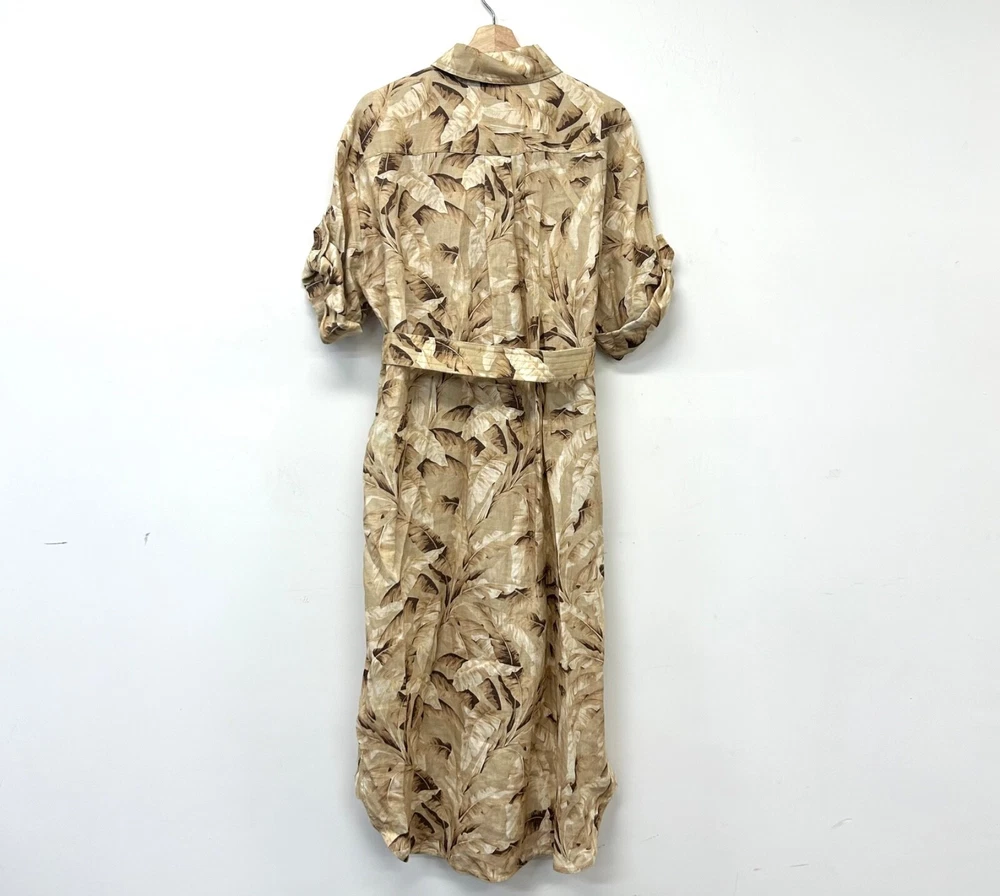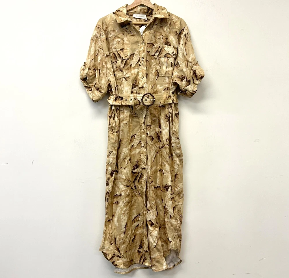 ZIMMERMANN SUPER EIGHT PALM TREE PRINT LINEN BELTED SAFARI SHIRT DRESS IN NEUTRALS Size 3 (AU/UK 14, US 10) Pls refer to brand website for more specific info re sizing Brand new with tags Safari style shirt dress Printed 100% Linen Pleated back Short sleeves with Buttoned tabs Detachable belt with bamboo circle buckle detail Folded cuffs Two side slit pockets Breast pockets Button fastenings through front Curved hem Non-stretchy fabric Mid-weight fabric Delicate dry clean 100% Linen ***pls note this is a brand new dress and condition is as such - however there is a tiny mark on the back of belt, if you refer to last pic & zoom in you might be able to see it, however due to the nature of the busy print its really not noticeable but wanted to disclose*** If you have any questions or require more details, photos ect pls don’t hesitate to msg me Pls check out my other listings - am open to reasonable offers (no low balls pls) and happy to combine postage #designer #australian #alemais shona joy alice mccall acler aje spell tropical safari African Safari Holiday