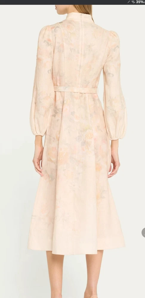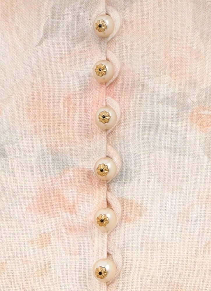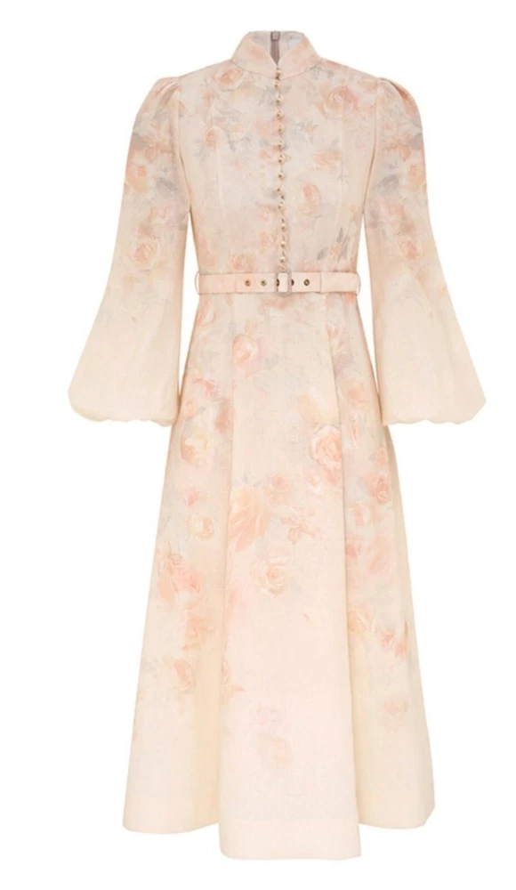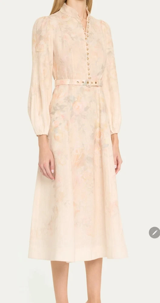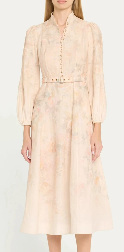 The Crush Buttoned Midi Dress in Ciara Floral from our Resort 2025 Collection, Crush. A linen midi dress featuring long blouson sleeves with an elasticated cuff, buttons down the centre front bodice and a removable self covered belt. Linen midi dress Stand collar Rouleau button loops Removable buckle belt Invisible zip at centre back