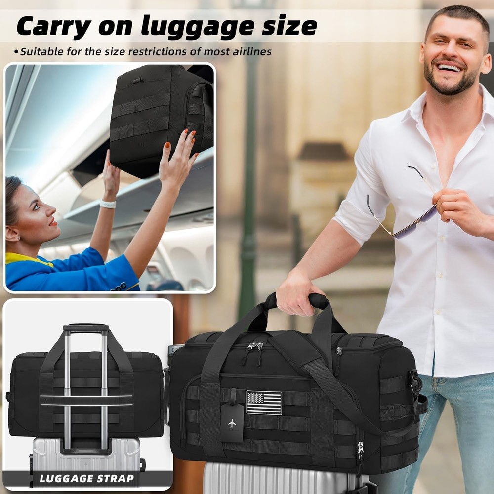 ZOMFELT Tactical Gym Bags for Men, 40L Travel Duffle Bag with LARGE, Black Product Details Product Dimensions: 21 x 9 x 11.5 inches Item Weight: 2 pounds Department: Unisex Manufacturer: ZOMFELT Item model number: YDB024 3-in-1 Versatile Design: Convertible into a duffel bag, shoulder bag, or travel backpack—perfect for gym, travel, and tactical use. Effortlessly switch styles for workouts, trips or missions—ergonomic, rugged & versatile for any lifestyle. Customizable Organization: 2 removable dividers let you create 2-3 compartments for gym gear, travel essentials, and tactical items. The innovative vertical shoe compartment design of this gym bag saves space in the main compartment and enables effortless shoe storage Military-Grade Durability: Crafted from 900D water-resistant nylon with reinforced stitching and heavy-duty zippers, this duffle backpack tackles rugged outdoor adventures fearlessly—rain, rough trails, or heavy loads Comfort & Travel-Friendly: This carry on bag meets most airline carry-on limits (Size: 21” x 11.5” x 9”) and features a luggage sleeve for stacking on rolling bags. The adjustable shoulder strap and padded handles make it comfortable for airport transit or hiking trails Tactical Expandability: Equipped with a full MOLLE webbing system, this tactical bag effortlessly attaches extra pouches, tools, or gear—perfect for tactical operators and outdoor adventurers craving customizable, mission-ready versatility