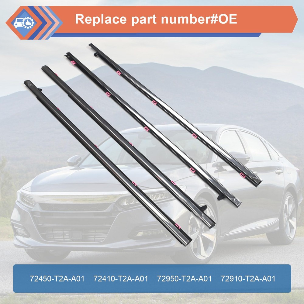 Package Include: 2 * Front Outer Door Window Weatherstrip Seal Belts 2 * Rear Outer Door Window Weatherstrip Seal Belts Replaces Part Number: #72410-T2A-A01 72450-T2A-A01 72910-T2A-A01 72950-T2A-A01 Compatible with Honda vehicle:2013-2018 Accord 【Replacement Part Number】 - #72410-T2A-A01, 72450-T2A-A01, 72910-T2A-A01, 72950-T2A-A01. Before ordering, please confirm compatibility and weather are suitable for your vehicle! 【Compatible Vehicle】 - This outer door window weatherstrip seal belt compatible with Honda vehicle 2013-2018 Accord. 【High Quality】- Our outer door window glass weatherstrip made of high-performance material that are completely corrosion-resistant and dust-proof, wear-resistant, heat-resistant, strong impact resistance, and good overall performance. It’s equivalent parts fully comply with the original manufacturer's specifications and functions. 【Direct Fit & Easy To Install】 - This window molding trim weatherstrip is easy to install and directly to replace the old one. Saving your time and money by replacing it yourself.