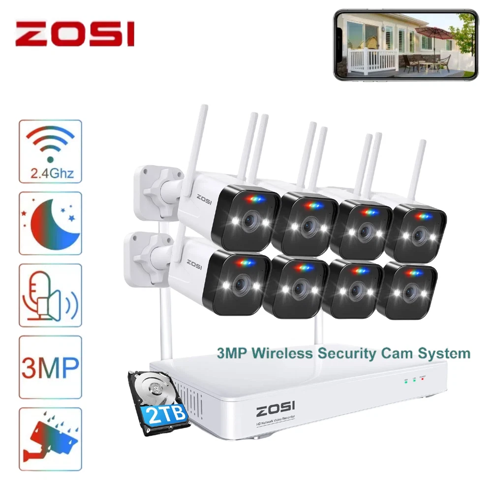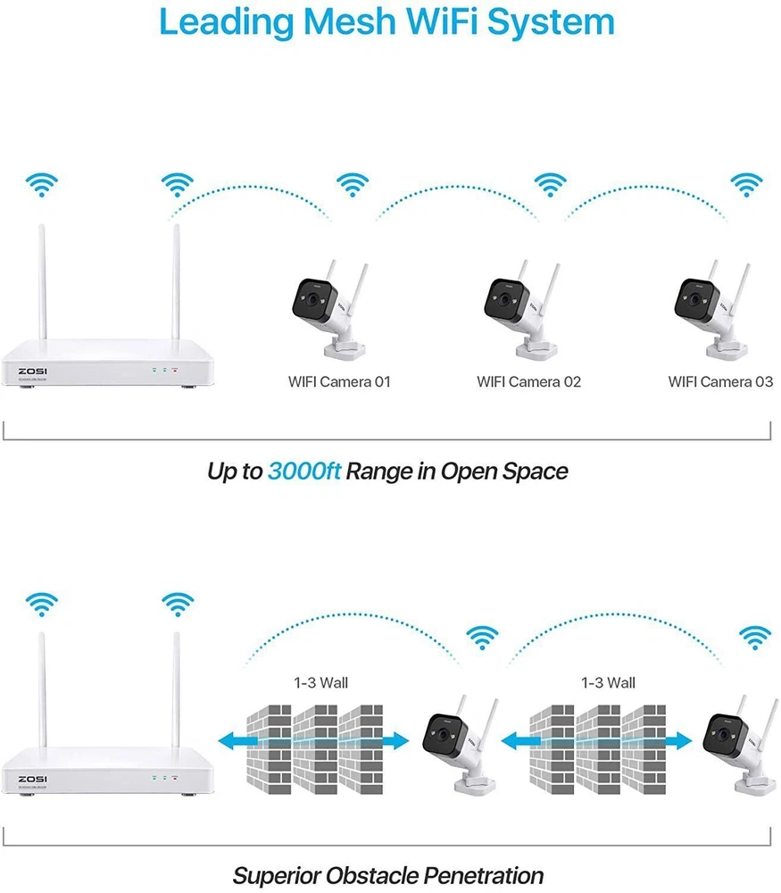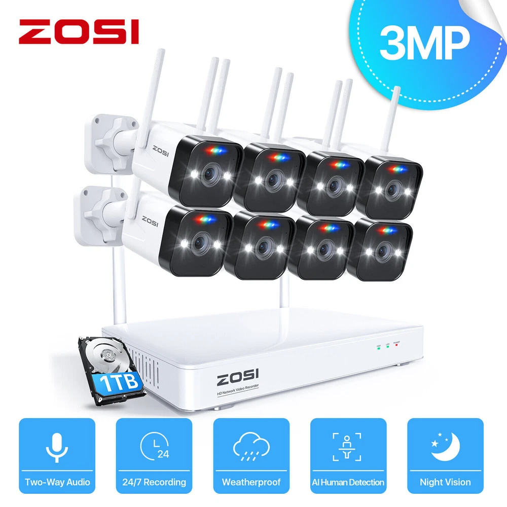 Note Before Purchase: 1. The cameras and the NVR require the power connection. They are not Battery Cameras. 2. WiFi security cameras mean the cameras connect wirelessly to a NVR. 3. WiFi security cameras are designed for continuous recording, which requires them to be plugged in to a power source. 3MP Super HD Visual Quality With 3MP high resolution, the wireless security camera system present you with clear and smooth videos in subtle details. Three Night Vision Modes 1.Smart Night Vision 2.Black & White Mode by Default 3.Switch to Full Color Night Vision by human movement 4.Color Night Vision 5.Black & White Night Vision Auto Pair, True Plug & Play, Remote Access in Minutes 1.Simple Connection 2. Download Free ZOSI Smart App on Smartphone or AVSS on PC 3. Enjoy Live View from Smartphone, Tablet or PC Advanced Mesh WiFi System Up to 3000ft WiFi range in open areas. Boast cascading and anti-interference algorithm, it provides higher performance for long distance and reliable WiFi connection. High penetration through walls and other obstacles. Note: Only support 2.4 GHz WiFi See, Hear and Talk over the Camera Use two-way audio to respond to guests or warn off the unwanted from anywhere. Smart & Active Deterrence The camera detects humans and activates spotlight and siren alerts to send strangers running. Advanced H265+ & AVBR Video Format Save storage space with the latest H.265+ video compression Smart AI Human Detection Upgraded human detection will trigger alerts (emails, App push notifications and buzzer) instantly when human is spotted in your motion zone to let you know someone is approaching your home, effectively avoiding “false positives” caused by pets, cars or leaves. Simple HDD Installation A sliding cover design make it easy to slot the hard drive into your NVR. Note:This NVR comes with a 1TB or 2TB hard drive according to your choice. Continuous 24/7 Recording This security system supports all day and night recording of all cameras at the same time.