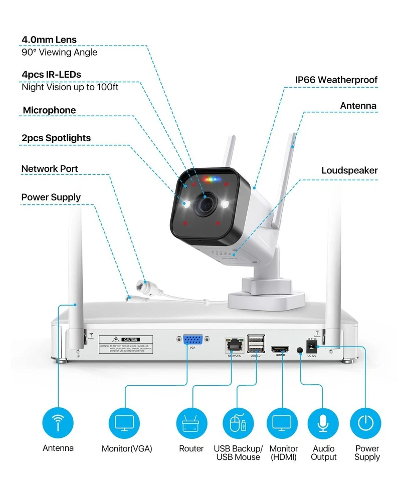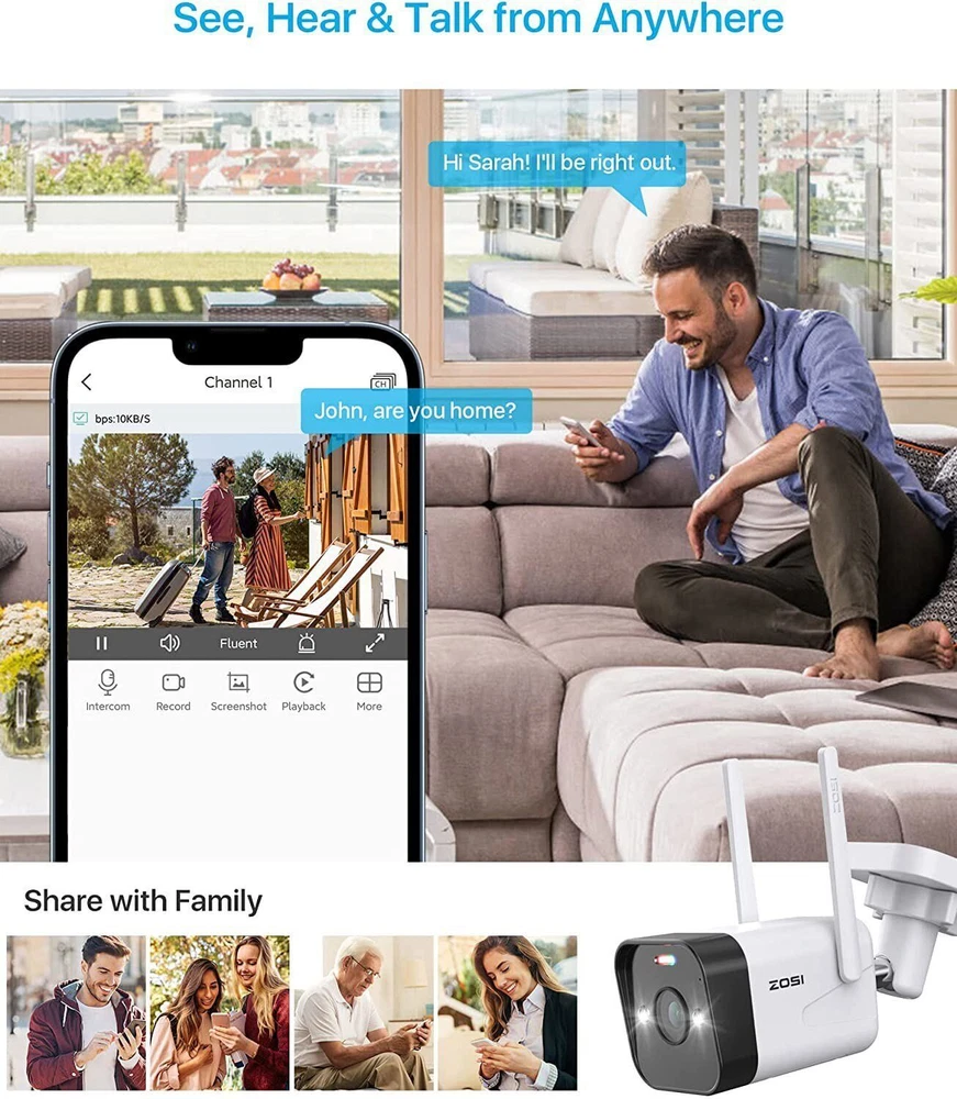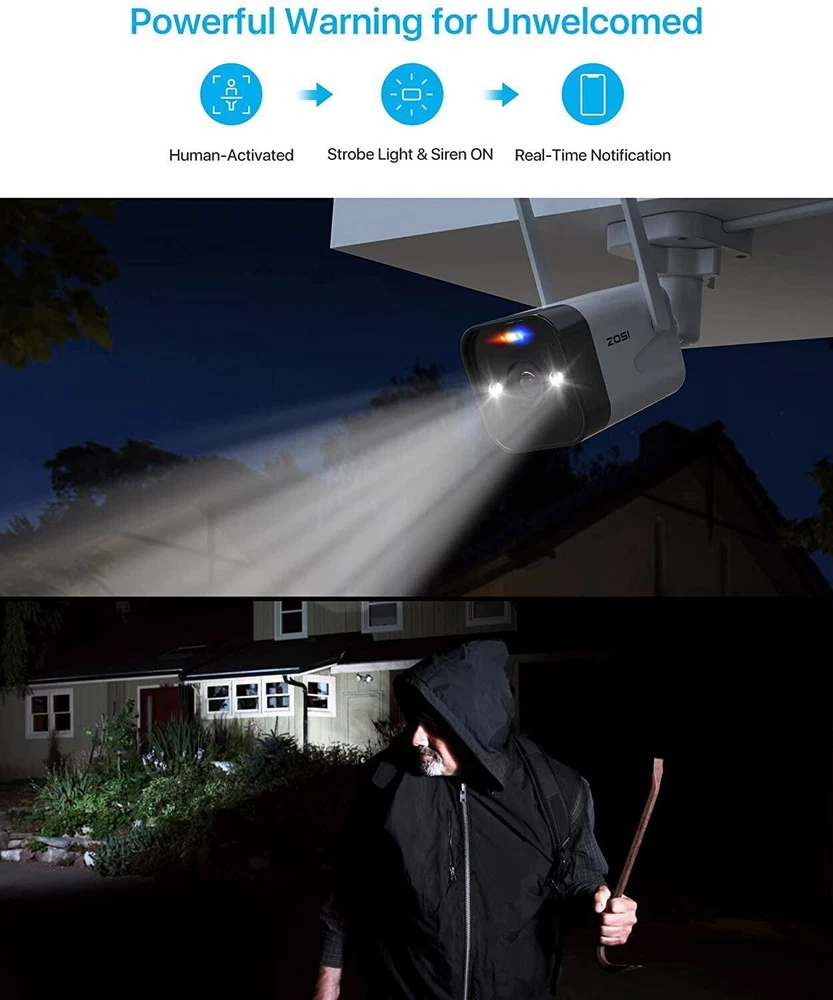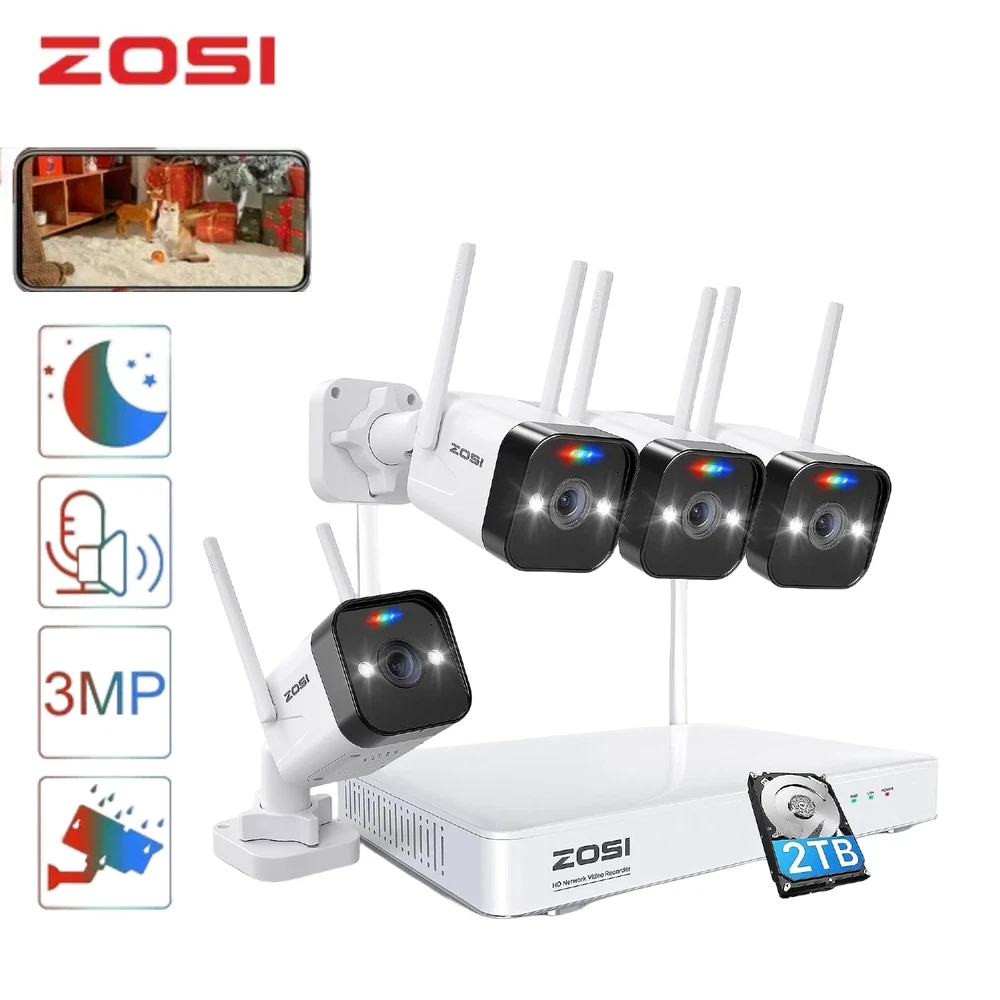 Note Before Purchase: 1. The cameras and the NVR require the power connection. They are not Battery Cameras. 2. WiFi security cameras mean the cameras connect wirelessly to a NVR. 3. WiFi security cameras are designed for continuous recording, which requires them to be plugged in to a power source. 3MP Super HD Visual Quality With 3MP high resolution, the wireless security camera system present you with clear and smooth videos in subtle details. Three Night Vision Modes 1.Smart Night Vision 2.Black & White Mode by Default 3.Switch to Full Color Night Vision by human movement 4.Color Night Vision 5.Black & White Night Vision Auto Pair, True Plug & Play, Remote Access in Minutes 1.Simple Connection 2. Download Free ZOSI Smart App on Smartphone or AVSS on PC 3. Enjoy Live View from Smartphone, Tablet or PC Advanced Mesh WiFi System Up to 3000ft WiFi range in open areas. Boast cascading and anti-interference algorithm, it provides higher performance for long distance and reliable WiFi connection. High penetration through walls and other obstacles. Note: Only support 2.4 GHz WiFi See, Hear and Talk over the Camera Use two-way audio to respond to guests or warn off the unwanted from anywhere. Smart & Active Deterrence The camera detects humans and activates spotlight and siren alerts to send strangers running. Advanced H265+ & AVBR Video Format Save storage space with the latest H.265+ video compression Smart AI Human Detection Upgraded human detection will trigger alerts (emails, App push notifications and buzzer) instantly when human is spotted in your motion zone to let you know someone is approaching your home, effectively avoiding “false positives” caused by pets, cars or leaves. Simple HDD Installation A sliding cover design make it easy to slot the hard drive into your NVR. Note:This NVR comes with a 1TB or 2TB hard drive according to your choice. Continuous 24/7 Recording This security system supports all day and night recording of all cameras at the same time.