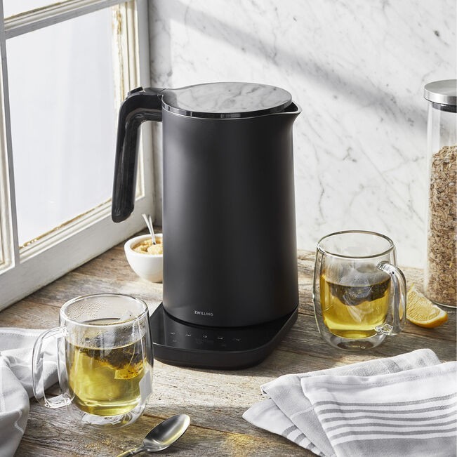 ZWILLING Enfinigy Tea set - Black, 9-pc The Enfinigy Kettle Pro Set in matte black features everything you need to pour the perfect cup of your favorite beverage. With the Kettle Pro you can achieve the ideal water temperature for coffee, tea, baby bottles, and more at just the touch of a button. After you’ve poured your cup, the Sorrento Coffee Glass Mugs maintain their toasty temperature while remaining cool to the touch on the outside. And the ultra-absorbent ZWILLING Care Towels keep your kitchen clean when tea-time is over. They mop up spills and help you dry freshly washed dishes in no time. The Cool Touch Kettle features 6 pre-set program settings on the 360° docking base so you can choose your temperature with just one touch. Additional features include precise temperature control +/- 4°F. and a 30-minute keep-warm function. And while it stays nice and hot on the inside because of the double-walled insulation, it’s always cool to the touch on the outside. Mouth-blown by skilled artisans, Sorrento’s innovative double-wall design maintains your beverage's ideal temperature, without messy condensation or the need for a coaster. Exceptionally durable due to their high quality, sturdy borosilicate glass construction, these lightweight glasses are perfect for outdoor dining, dinner parties, and everyday use. The set also includes ZWILLING Care Kitchen Towels, a kitchen staple that gives back. Proudly made in India from 100% cotton, these highly absorbent towels ensure a speedy cleanup. Quick-drying and lint-free, the towels are ideal for wiping countertops and handling hot pans. Plus, they feature a convenient hanging loop for storing. By purchasing our kitchen towels, you support the ZWILLING Care foundation’s work in providing vocational training to women, young people with disabilities, and others who may be at a disadvantage in society. Set includes 1 Kettle Pro, 2 Sorrento coffee glass mugs, 4 grey kitchen towels Kettle available in black or silver Kettle Pro features 6 pre-set program settings for the ideal temperature selection for coffee, tea, baby food, and more Keep-warm function holds water at the desired temperature for up to 30 minutes Double-walled body keeps water hot longer while the outside remains cool to the touch Integrated cord winder for convenient storage Double wall glasses maintain perfect temperature of beverages. Keep hot drinks hot while remaining cool to touch and cold drinks stay cool for longer with no messy condensation Glasses constructed of high-quality, durable borosilicate glass that is mouth blown by skilled artisans Glasses are microwave, freezer, and dishwasher safe, towels are machine washable Kitchen towels made in India as part of the ZWILLING Care foundation charitable work