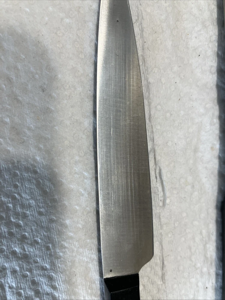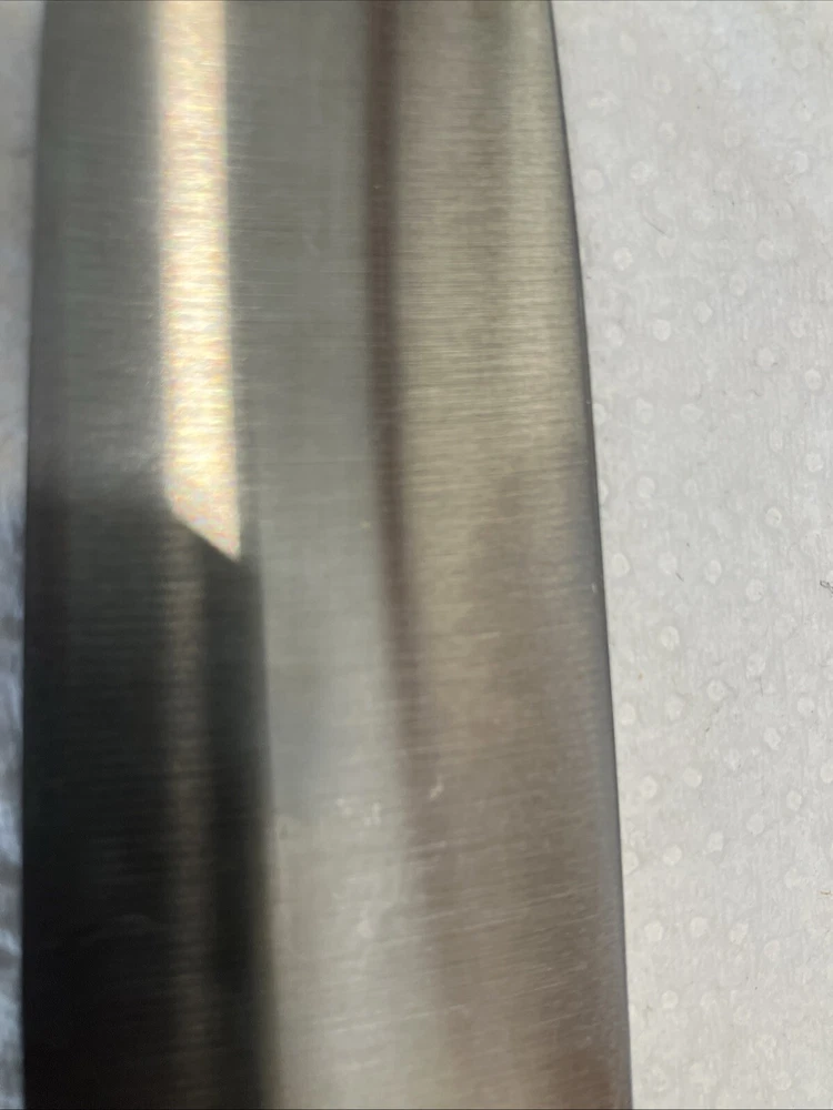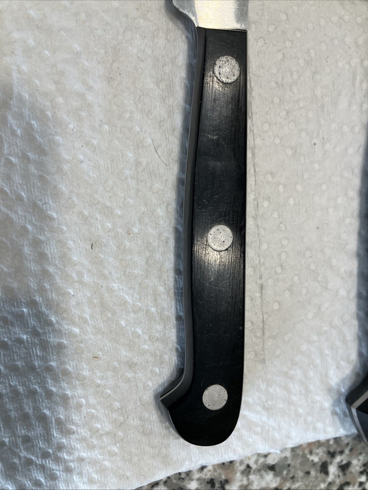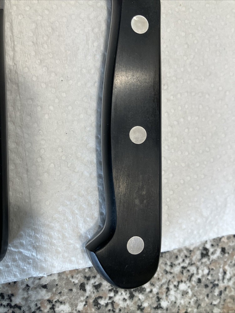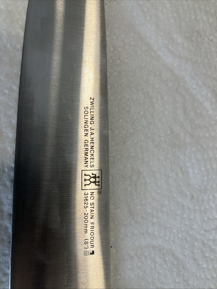 This is a set of 2 knives from ZWILLING J.A. HENCKELS, made in Solingen, Germany. The set includes a 8" Chef's Knife and a 4" Paring & Peeling Knife. Both knives are made of stainless steel with a hollow blade edge. The knives are identified by model numbers 31625-200mm and 31620-100mm. Very clean items looks like new.