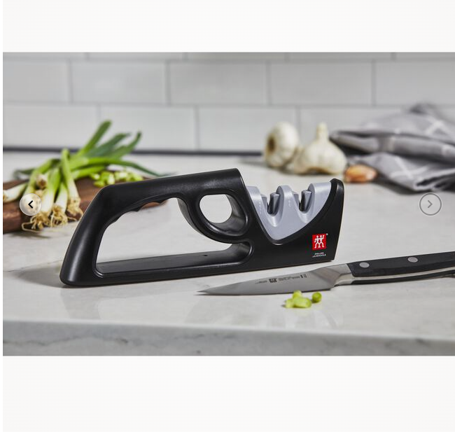ZWILLING TWO-STAGE PULL-THROUGH SHARPENER-GRAY Safely and easily keep your knives razor sharp with the 2-Stage Pull Through Knife Sharpener. Ceramic rods in both coarse and fine grits will put an edge on even the dullest knife with only a few strokes. The protected safety grip keeps your fingers out of harms way while allowing the sharpener to stay firmly on a surface. Suitable for all western-style blades. Quickly and safely sharpens your blades Non-slip bottom Comfortable handle also protects fingers Two stages, coarse and fine Easy to use, just pull through. Made in China TWO-STAGE PULL-THROUGH SHARPENER-GRAY