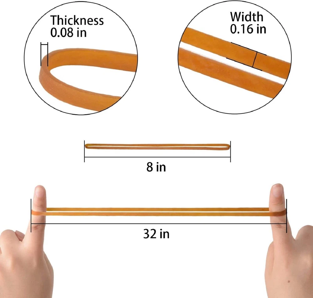 50 Pack Large Rubber Bands Heavy Duty,Heavy Duty Trash Can Band, Strong Elastic Bands for School Home OfficeSupplies, Garbage Cans, File Folders Large Rubber Bands High stretchy: theserubber bands have good elasticity and thick enough (thickness- 0.08"width- 0.16"), not easy to break, can serve for a long time.These bigrubber bands are approx. 20 cm/ 8 inches in flat length ( can stretch to 4times), 4 mm/ 0.16 inch in width and 2 mm/ 0.08 inch in thickness. Rubber Bands Office Supplies Wideapplications: can be applied to bundle office supplies, trash cans, folders,furniture, DIY art craft in daily life, your imagination can create lots ofother art crafts. Large rubber bands material: made of quality natural rubber, no harm to human body, durable to be applied. High stretchy: these rubber bands have good elasticity and thick enough (thickness- 0.08" width- 0.16"), not easy to break, can serve for a long time. These big rubber bands are approx. 20 cm/ 8 inches in flat length ( can stretch to 4 times), 4 mm/ 0.16 inch in width and 2 mm/ 0.08 inch in thickness. Large Rubber Bands Heavy Duty Quantity: come with 50 pieces long rubber bands in natural yellow color, rich quantities can be applied for a long time Rubber Bands Office Supplies Wide applications: can be applied to bundle office supplies, trash cans, folders, furniture, DIY art craft in daily life, your imagination can create lots of other art crafts