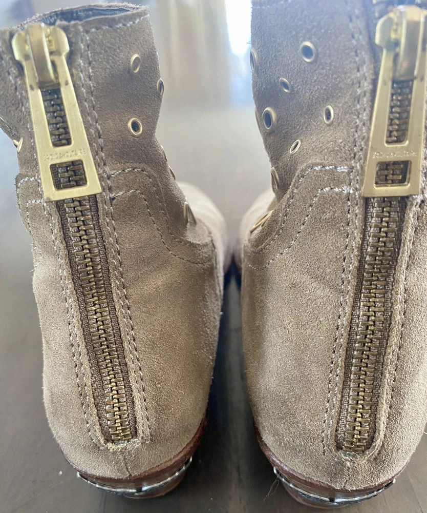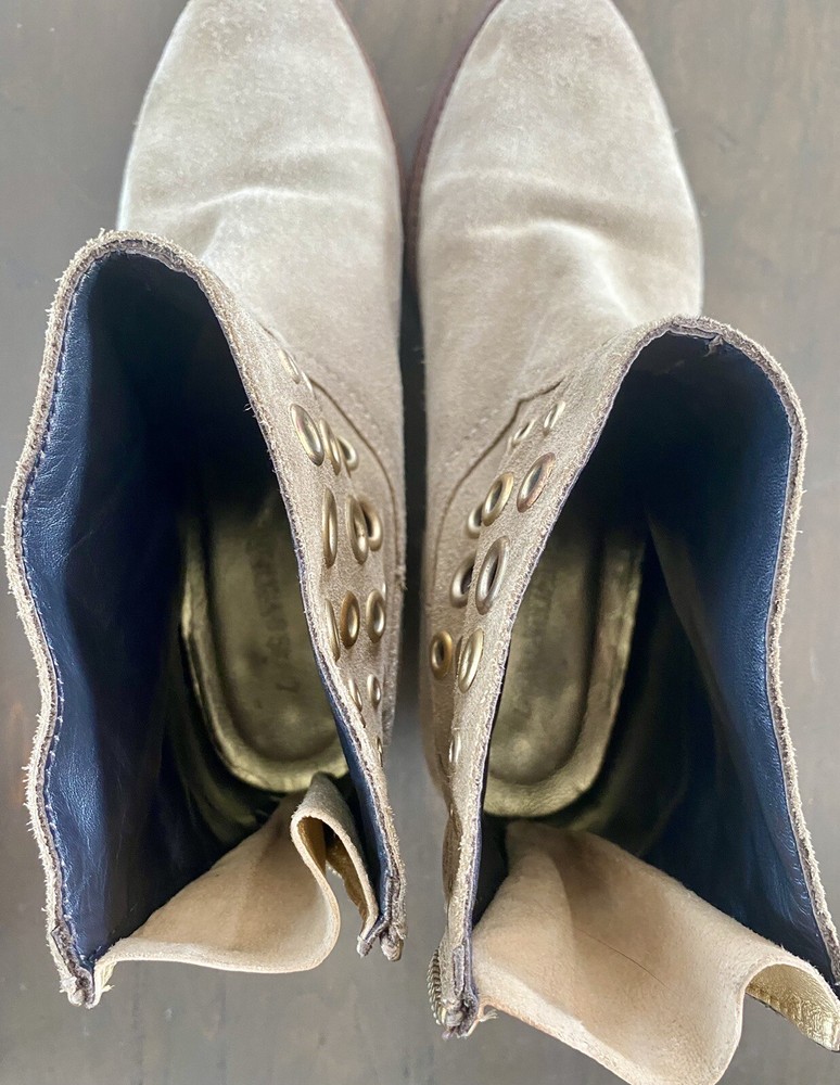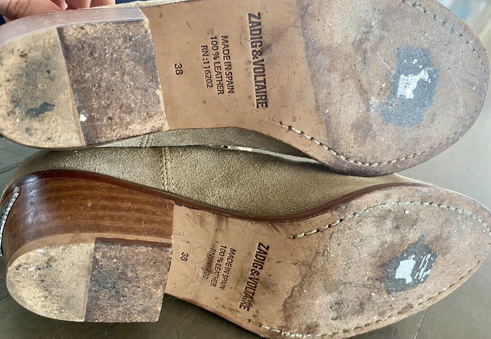 Elevate your shoe game with these stunning Zadig & Voltaire booties in tan suede. The ankle-length boots feature a solid pattern with an almond toe shape and a low block heel, making them perfect for travel, parties, or casual wear. The studded gold-tone rivet accents add a touch of glamour to the overall design, while the zip closure ensures easy wear. These booties come in US shoe size 8 or EU shoe size 38 and are made with high-quality materials, including suede and rivet accents. The motorcycle theme adds a touch of edginess to the style, making them a versatile addition to any wardrobe. Whether you're dressing up or down, these Zadig & Voltaire booties are sure to turn heads. One small rivet is missing near ankle. Suede shows some wear. Comfortable, cute booties that pair great with skinny jeans, skirts, and shorts.