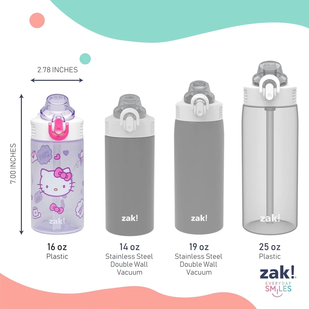 Zak Designs Sanrio Sage Kids Water Bottle For School or Travel, 16oz Durable Brand Zak Designs Material Plastic, Silicone Bottle Type Reusable Plastic Color Hello Kitty Capacity 473 Milliliters Features LIFESTYLE: Staying hydrated is an important part of being healthy! With fun art featuring Hello Kitty, Zak Designs' innovative water bottles help make it easy for grown-ups and fun for kids! FEATURES: The leak-proof water bottle has a comfortable silicone spout that's easy for kids to drink from and a screw-on lid that prevents splashes and mess. It fits in most car cup holders for convenient travel. HYGIENIC SPOUT COVER: Keep the spout clean in the house or while you're traveling--the spout cover protects contact surfaces and has a flip-up lock to keep it closed, preventing leaks and spills. When it's time to drink, the action lid allows one-handed operation, and the spout easily pops up at the push of a button. EASY TO CLEAN: This travel water bottle is top rack dishwasher safe, and with the removable straw and silicone spout, the lid can be disassembled for thorough cleaning. SIZE & MATERIAL: This Zak water bottle has a 16-ounce capacity, measuring 4.33 by 2.78 inches wide and 7 inches tall. It's made of durable, break-resistant, and BPA-free plastic, and recommended for children age 3 and up. Our Business 100% Customer Satisfaction We go above and beyond to ensure you receive the best level of service. Returns We want you to be happy with your purchase, however in the rare occasion that you are not, please let us know and we will contact you to arrange either a collection or a refund. Please CONTACT US before leaving any negative feedback and we will promptly sort out any issue with your order. 8401743