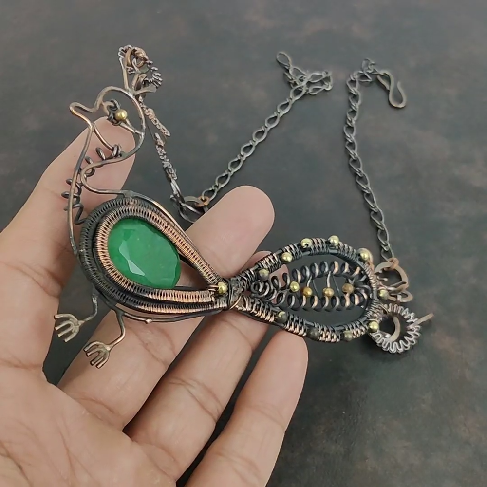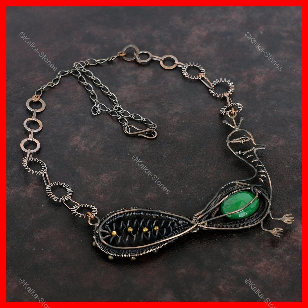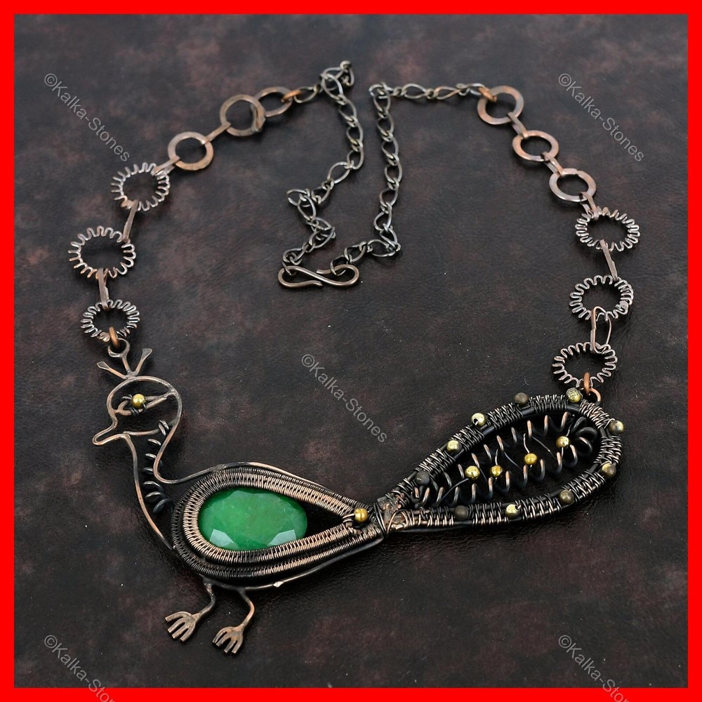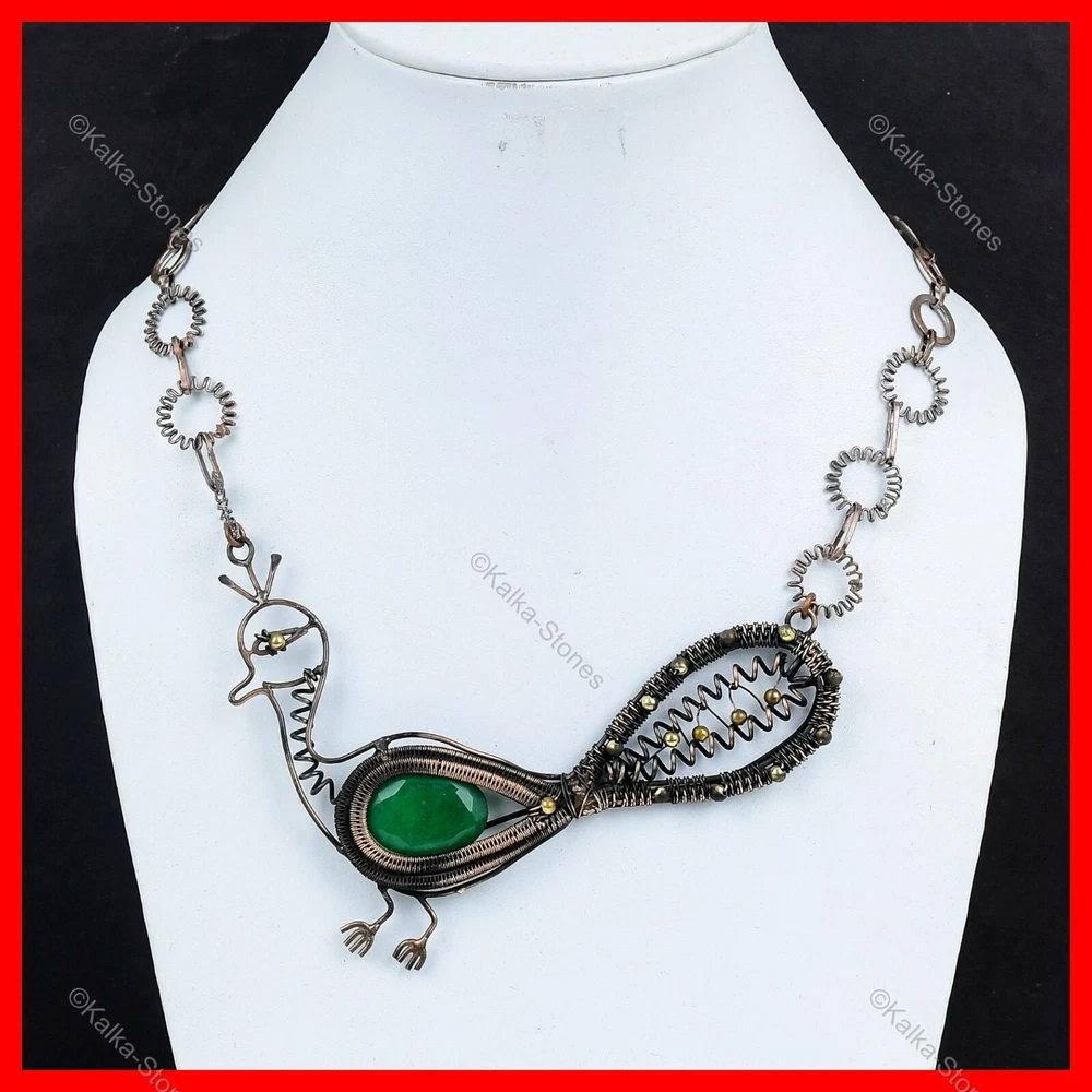 Note : Due to the natural formation of this gemstone. Slight variation in design and color are to be expected. Welcome to Kalka Stones Zambian Emerald Stone Copper Chain Ethnic Wire Wrapped Peacock Necklace Jewelry Handmade Necklace, Wire Wrapped Necklace, Wire Wrapped Jewelry, Copper Pendant, Copper Wire Necklace, Wrapped Jewelry, Wire Wrap Necklace, Wire Wrap Jewelry SKU : VFWN-437 Gemstone : Zambian Emerald Stone Shape : Oval Metal Purity : Unknown Copper Length : 18 Inches Width : Inches Copper has been used for jewelry making for thousands of years, dating back to ancient civilizations such as the Egyptians, Romans, and Aztecs. Copper was valued for its beauty, versatility, and durability, and was often used to make everything from jewelry and coins to cookware and tools. In addition to its historical significance, copper jewelry also offers several benefits. Copper is a natural conductor of heat and electricity, which makes it ideal for energy healing and therapeutic purposes. Wearing copper jewelry is believed to have various health benefits, such as improving circulation, reducing inflammation, and boosting the immune system. Some people also believe that copper jewelry has the ability to balance energy and improve mood. For Mother's Day Gift For Father's Day Gift For Promise For Valentine's Day For Halloween Party For Christmas Day Gift For New Year Party For Mom For Her If you can't find the information you need or need some advice for your design? Feel free to contact us. We are fast to reply :) All our work is made by hand with Love and Care in our workshop Thank you so much for visiting and hope you enjoy shopping with us Kalka Stones is committed to delivering the best quality jewelry to customers. As a handmade jewelry manufacturer, we offer an extensive selection of copper gemstone jewelry that showcases the brilliance of our craftsmanship. We are an experienced handmade jewelry supplier with expertise in embellishing gemstones to suit every style. We offer you the liberty to create your jewelry ensemble with sparkling, earthy, and pure gemstones. Our Talented artisans masterfully handcraft each piece of jewelry you see here. Our pieces are made with genuine gemstones.