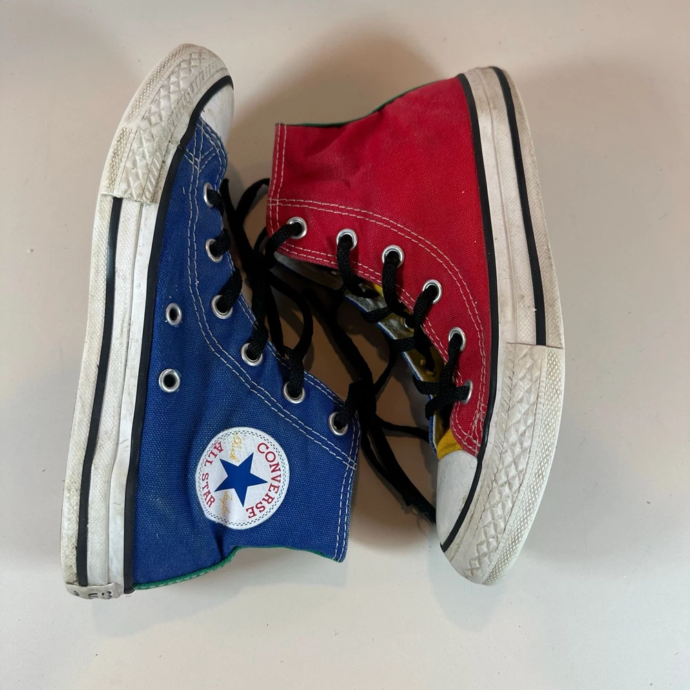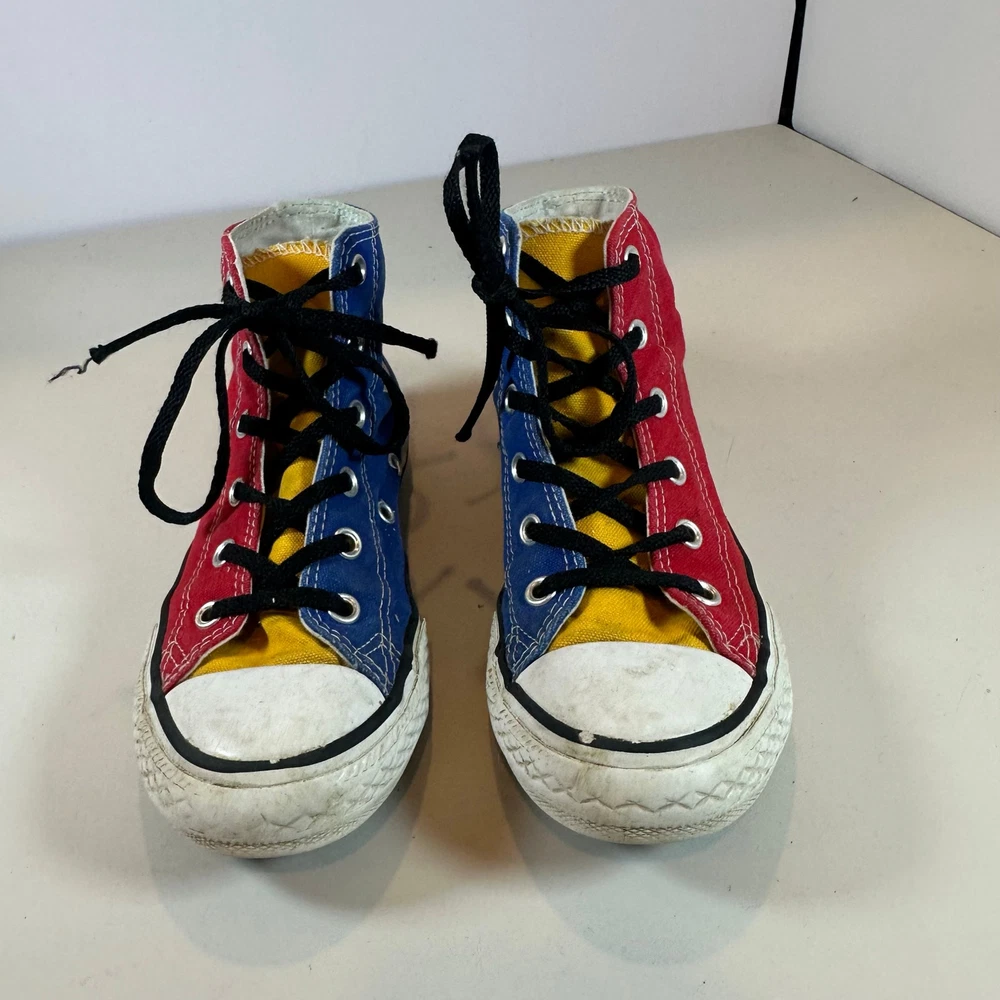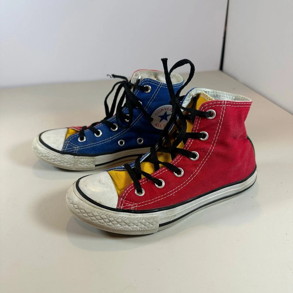 Converse Colorblock High Hi Top Chuck Taylor All Star Sneakers Little Kid Size 1 Primary color colorblock high tops, red blue yellow green. Gently worn, no flaws or major wear, see photos for details, wear. Size 1 little kid/youth, fit us around age 8, YMMV.