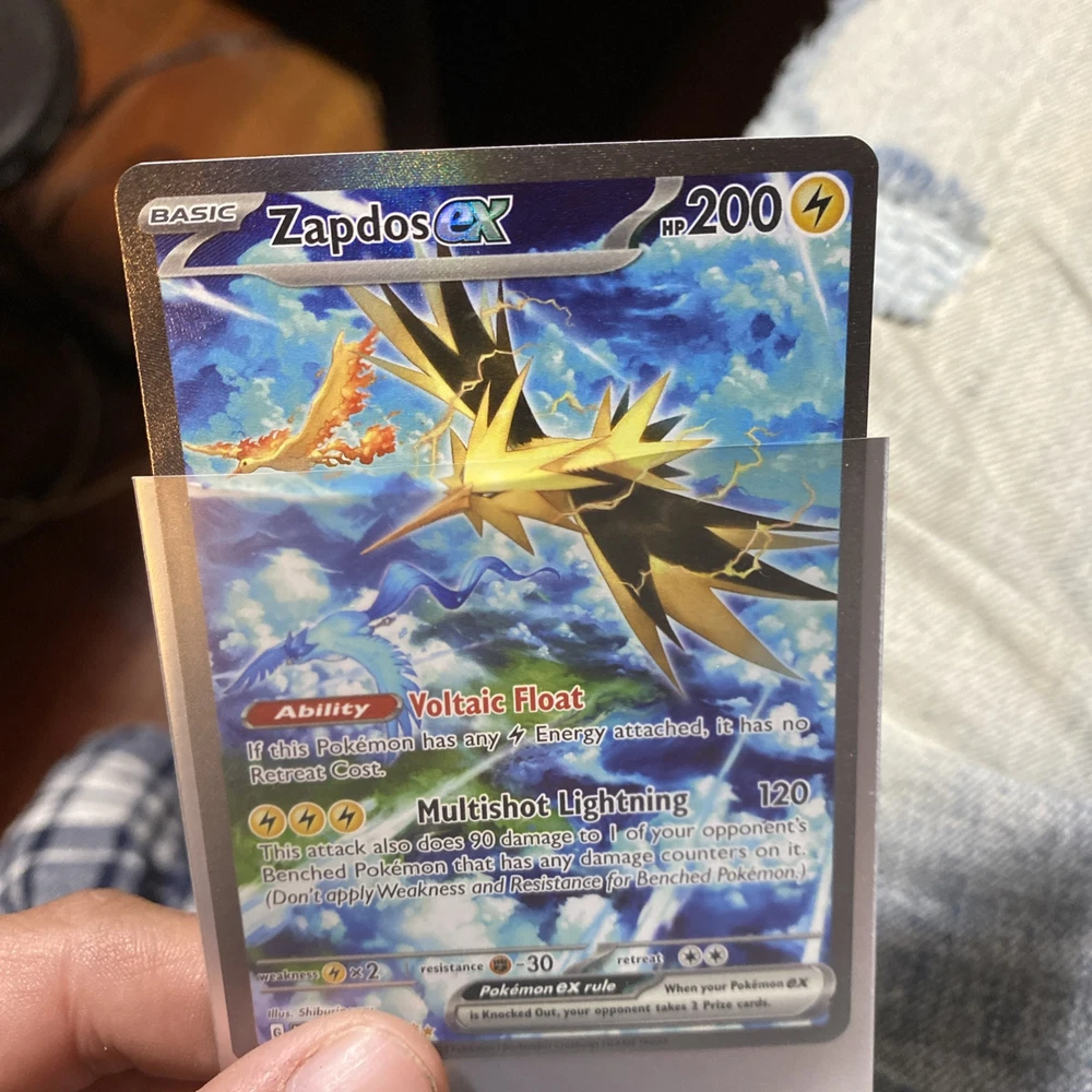 Zapdos ex 202/165 Sv: Scarlet & Violet 151 Holo is a Pokémon TCG card featuring a Special Illustration Rare design. It is an EX card with 200 HP, part of the Basic stage. The card is in English and illustrated by Shiburingaru, manufactured by The Pokémon Company. It has a holographic finish and is in near mint or better condition.