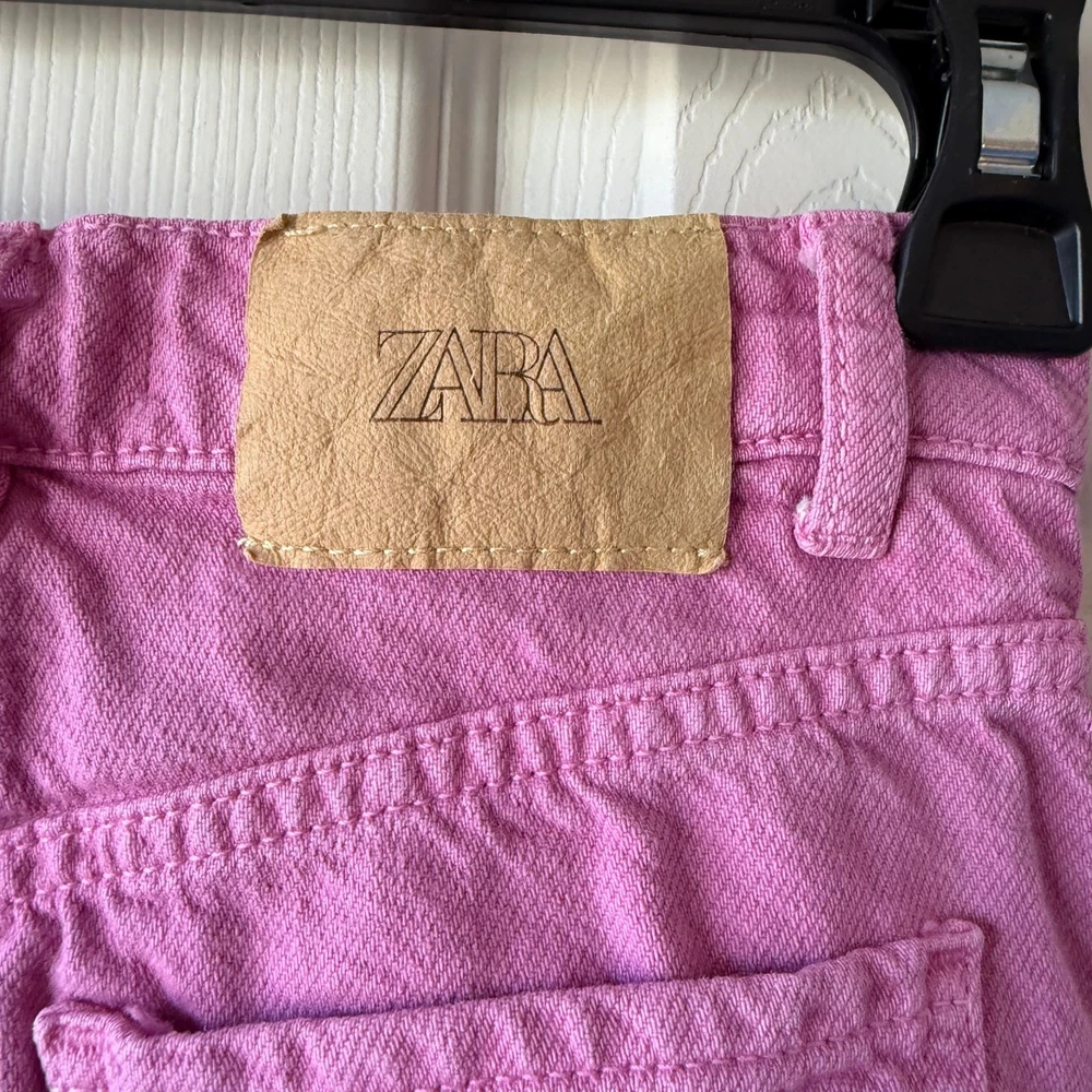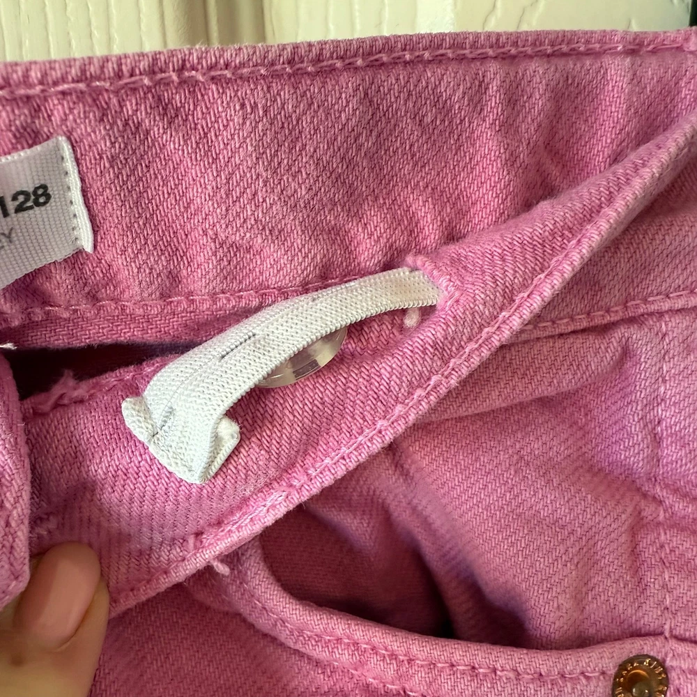 Size 8 (128 cm) Zara Girls Bubble Gum Pink wide leg jeans. Button snap fly. Adjustable waistband. Good/fair used condition for light wash wear. I dont see any stains. So cute! D-4412