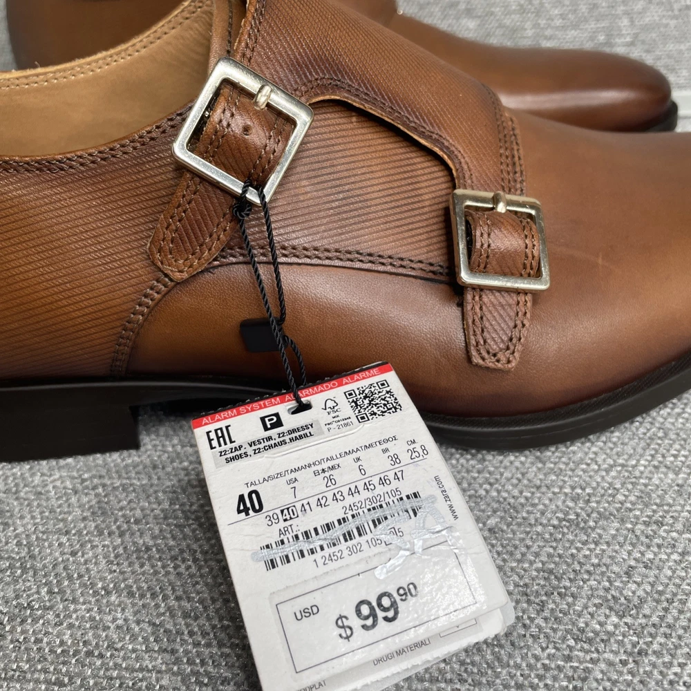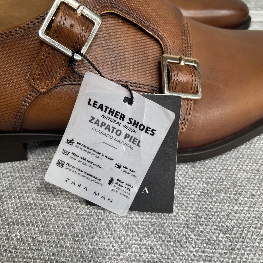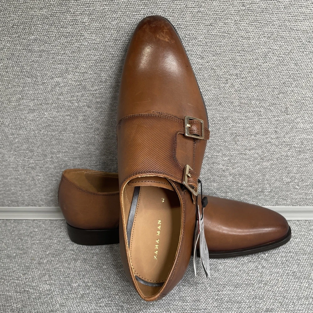 Zara Leather Monk Strap Brown Dress Buckle Shoes New with Tags - Defect. Size: Men’s US 7 EUR 40 No box. Defects: toe of right shoe has some scuffs (as shown) and bottom of right shoe has permanent marker. Please see all photos for item details and condition. Fast shipping from a smoke free home!