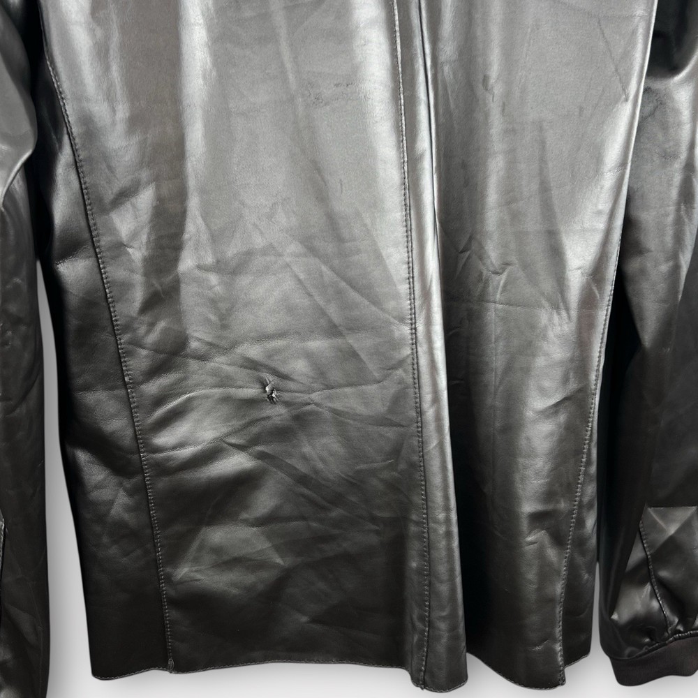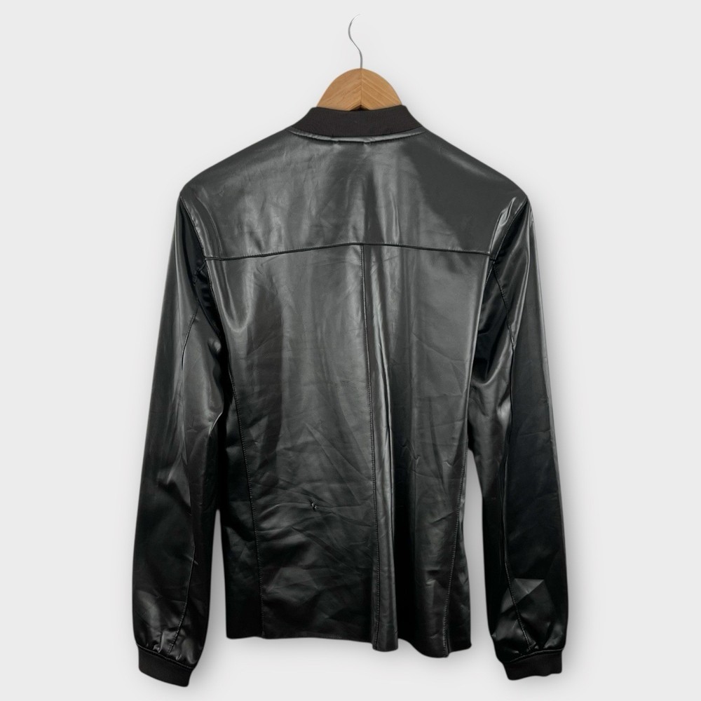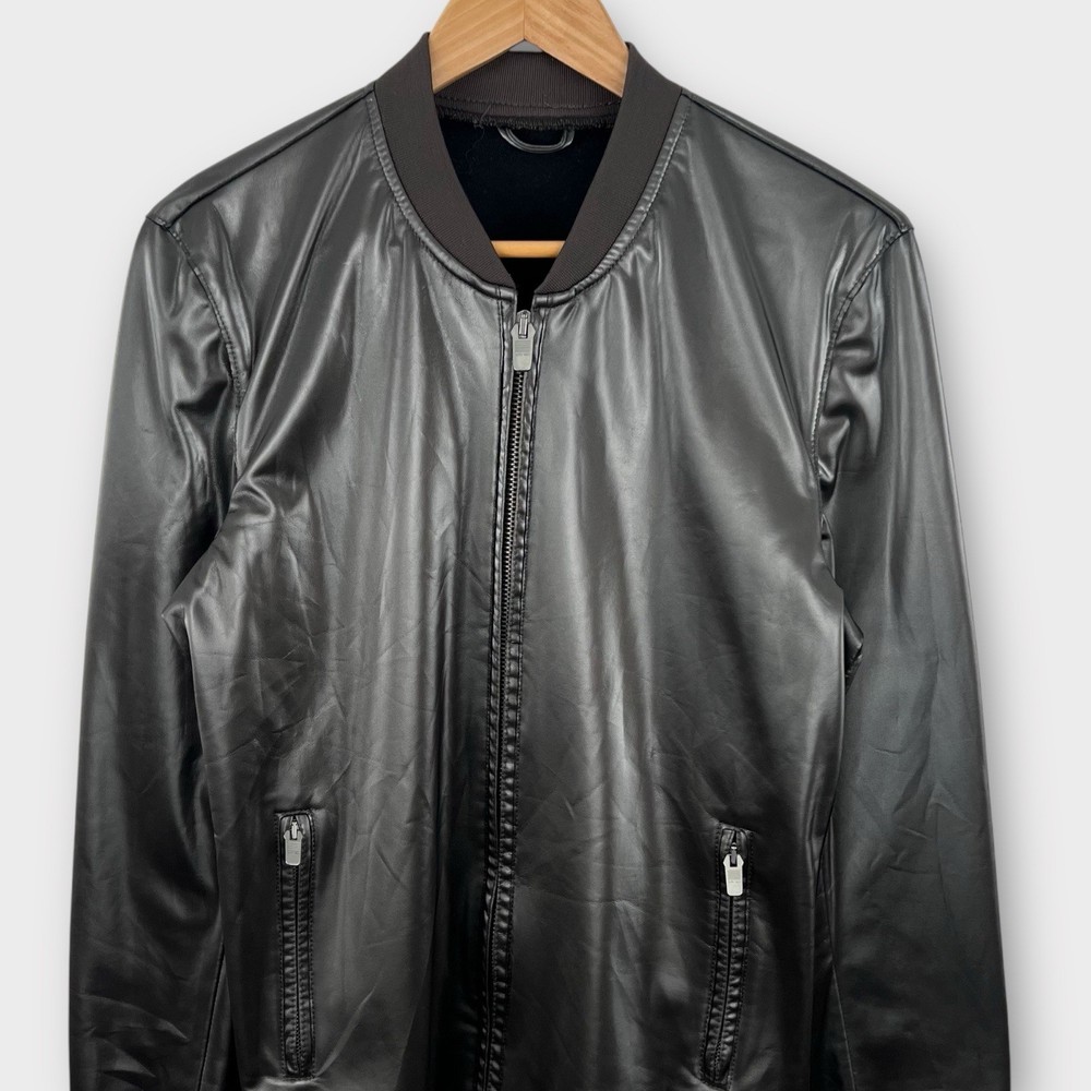 This Zara Man bomber jacket is a must-have for any stylish man. The silver faux leather material gives it a unique and classic look that is perfect for the fall, spring, and winter seasons. The jacket features a full zip closure, collared neckline, and pockets for added convenience. The lightweight and softshell fabric type makes it comfortable to wear, while the polyester lining material ensures durability. The mid-length of the jacket provides ample coverage, and the solid pattern is easy to match with any outfit. Accents such as the zipper add a touch of edginess to the jacket, making it suitable for motorcycle and metal-themed outfits. This bomber jacket is perfect for any man who wants to look stylish without sacrificing comfort. Tag Size: N/A Best Fit: * Men: M Approximate Flat Measurements: * Chest: 20.5” * Length: 27” * Material: Polyurethane Condition: small rip flaw on back lower jacket pictured All items are second hand, many being vintage and may have small imperfections. Anything major is noted.