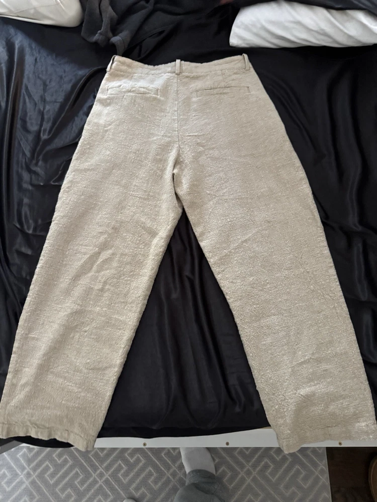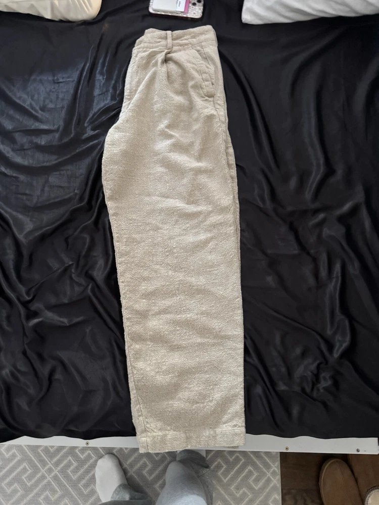 These Zara Pants are designed for men in a size 31 with a classic fit. Made from a blend of linen and cotton, they feature a beige color and a straight leg style. The pants have a flat front with a zip and button closure, ideal for casual occasions with a coastal or beach theme. They are ankle-length with a mid-rise and breathable fabric, perfect for wear in winter, fall, or spring. Easy to care for with machine washable instructions, these pants offer comfort and style for a minimal yet sophisticated look.