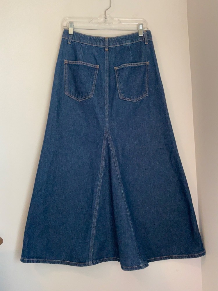 The Zara Denim Maxi Skirt in women's size S is a stylish and versatile addition to any wardrobe. This A-line long skirt features a solid blue color with a high rise and zip closure, perfect for casual occasions or travel. Made of denim fabric and accented with buttons and zippers, this skirt offers a trendy 90s Y2K vibe with a vintage twist. Perfect for all seasons, this skirt is lined for added comfort and quality, making it a must-have for fashion-forward women looking for a unique and chic alternative to traditional denim pieces. Measurements Waist : 13.5”(26-27) Hip: 18” (36) Length : 36” Condition : Good