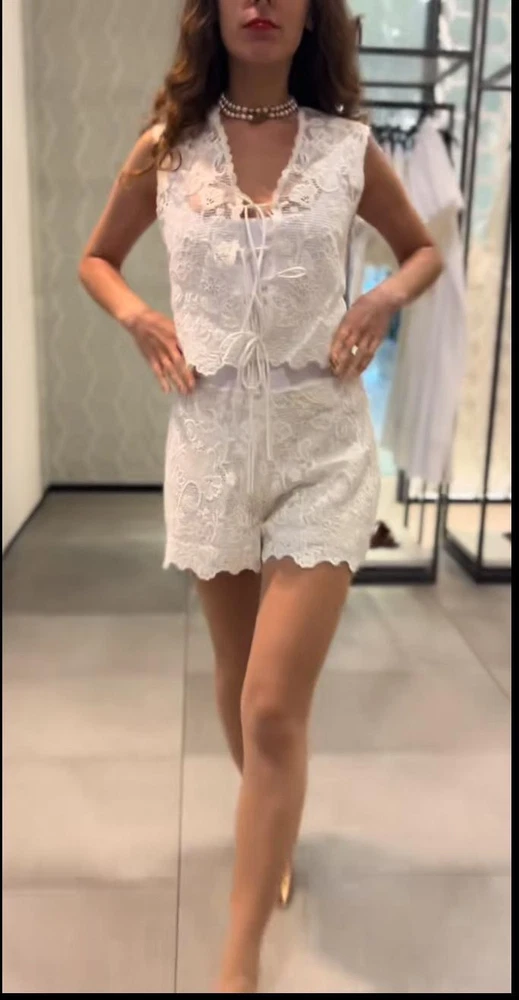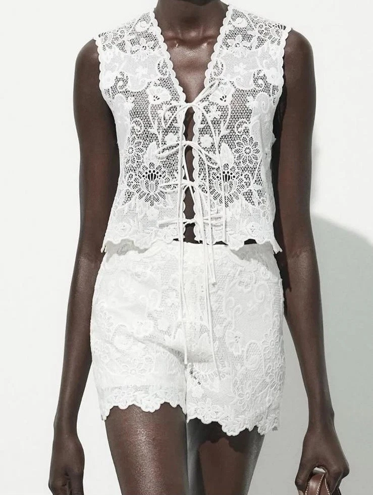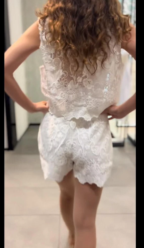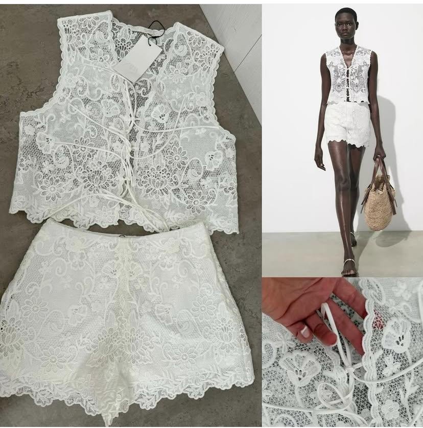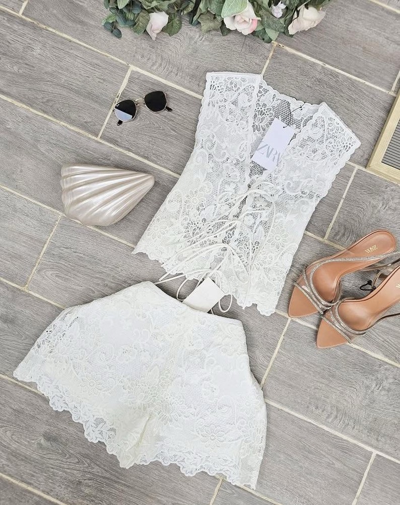 The Zara ZW Collection Embroidered Lace Co Ord Set in size S features a floral pattern with a square neckline and sleeveless design. The set includes a top and Bermuda shorts, perfect for various occasions such as travel, weddings, parties, and formal events. Made from linen, cotton, and lace fabric, the outfit is accented with an elasticated adjustable drawstring waist and embroidered details. The ecru white colour and high-quality materials make this set a versatile and stylish choice for any season.
