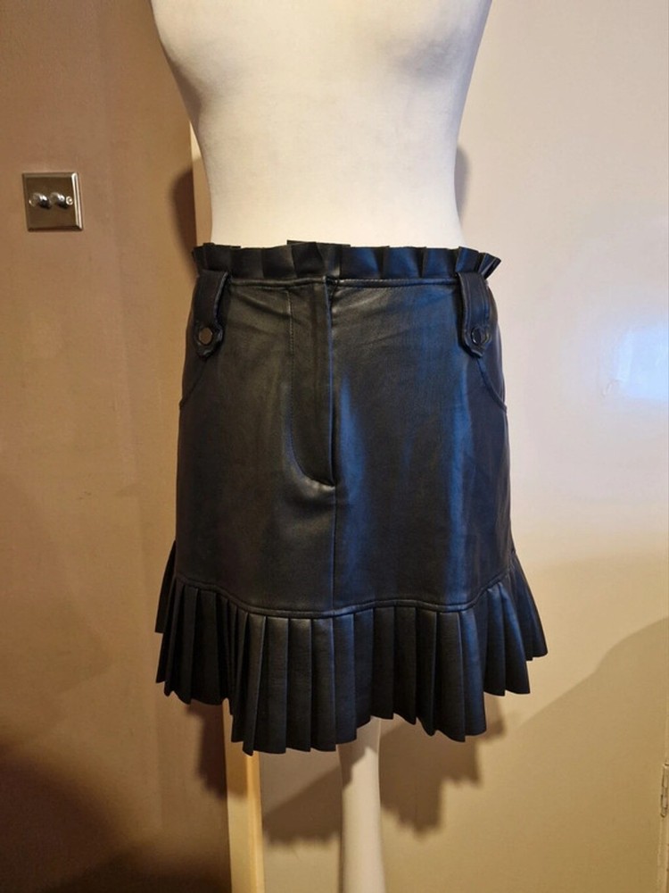 Zara faux leather pleated skirt - Size medium. Worn once, immaculate condition. Ruffle pleated detailing on the hem and waist. Chrome studded belt loops. Zip fastening with pockets.