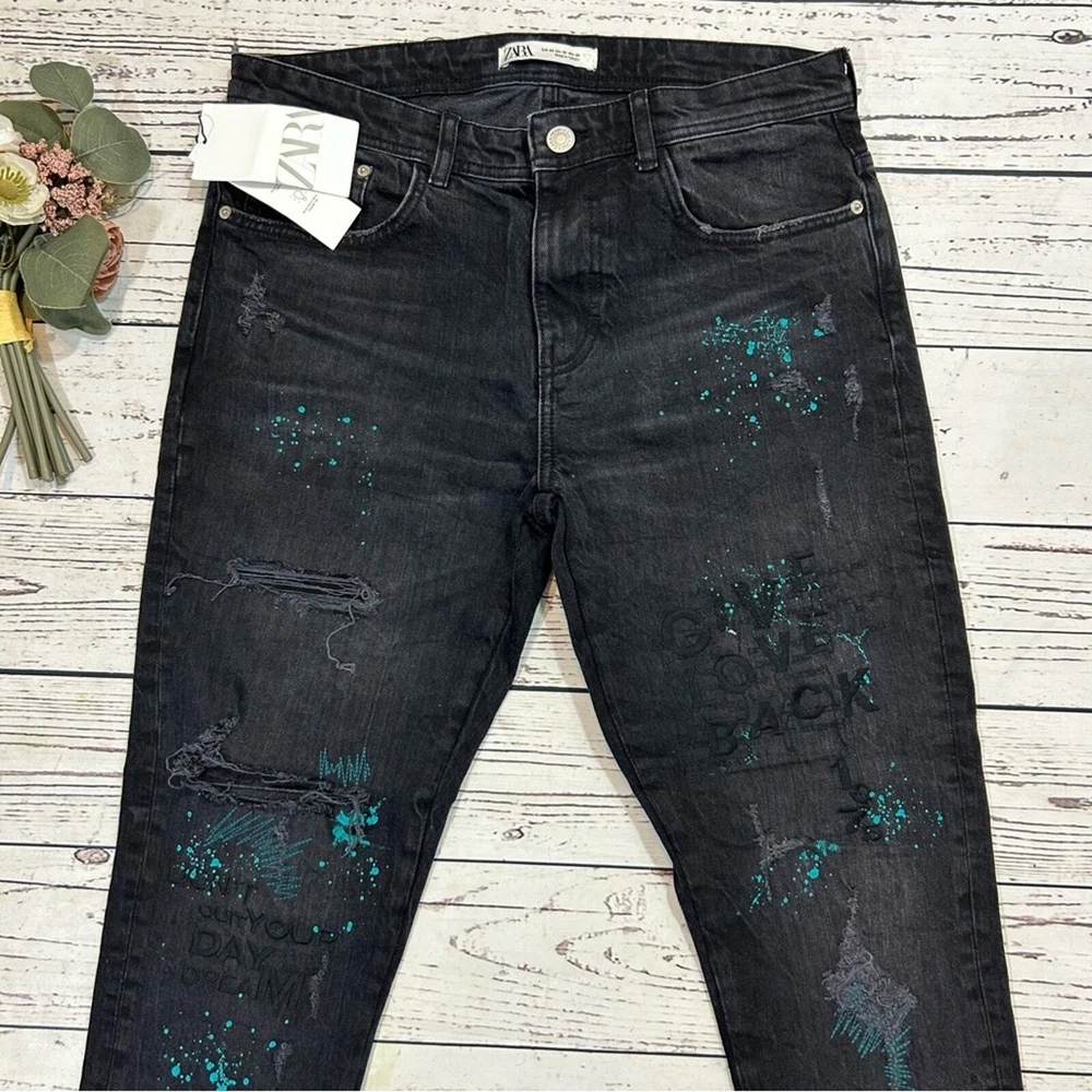 Zara paint splatter ripped distressed black denim skate slim jeans NWT . Super nice . Size 32 . Flat lay measurement waist 17 inch . Rise 10 inch . Inseam 29 inch . Shipped with USPS Priority Package, No returns but backed by ebay money back guarantee. If you have any other questions please contact seller . Please leave a wonderful feedback once you are satisfied with the purchase , Thank you . Custom charges may apply for international purchases .
