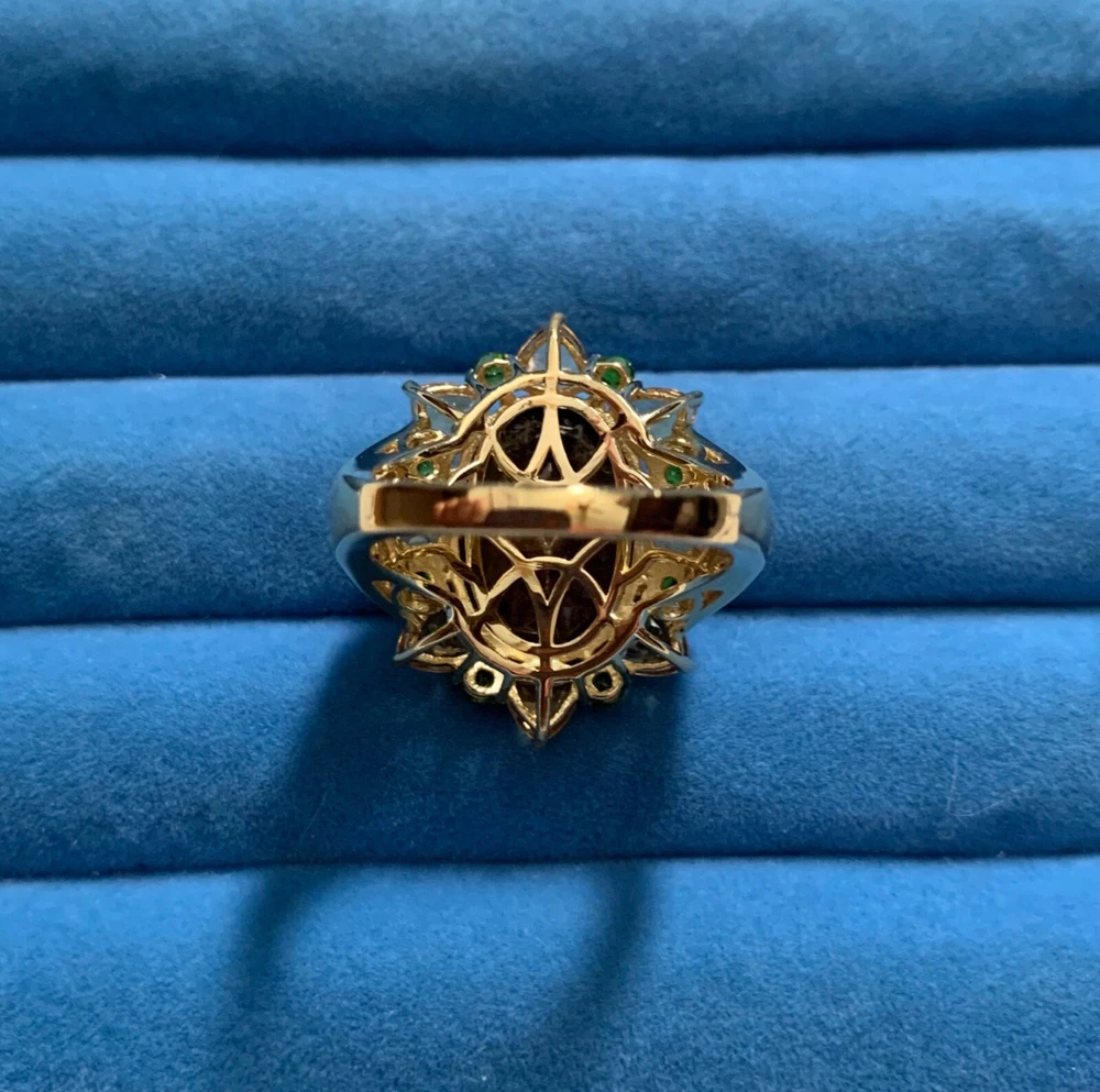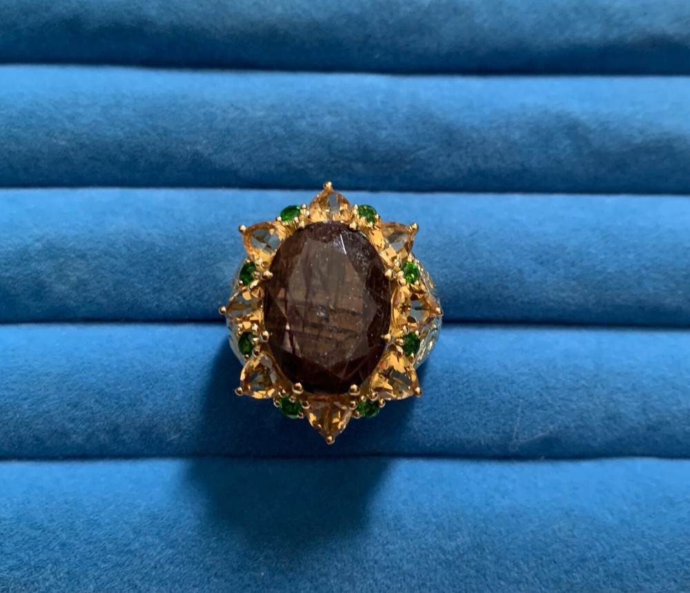 Elevate your jewelry collection with the Zawadi Chocolate Sapphire, MultiGemstone (Citrine and Chrome Diopside) Floral Ring, a size 10 piece that boasts a rich blend of natural beauty and sterling craftsmanship. The oval-shaped, chocolate sapphire centerpiece is complemented by an array of gemstones, creating a floral motif that exudes sophistication and charm. Crafted by D'Joy, this ring features an 18K vermeil yellow gold plating over 925 sterling silver, ensuring a lustrous finish that enhances its elegant design. The brown hues of the main stone harmonize with the multifaceted brilliance of the secondary gemstones, making this piece a versatile accessory for both casual and formal occasions.