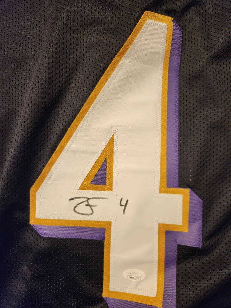 This is a rare opportunity to own a custom autographed Baltimore Ravens jersey by Zay Flowers. The jersey is a size XL and has been authenticated by Beckett Authentication Services (BAS) making it a valuable addition to any sports memorabilia collection. The jersey features the Baltimore Ravens team logo and is made of high-quality materials. It is perfect for any football fan who wants to show their support for the team. This is a one-of-a-kind item that any collector would love to own.