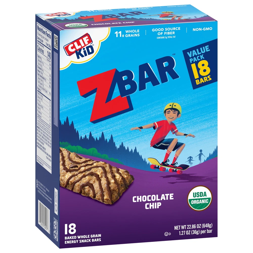Crafted specially for kids, Clif Kid Zbar snack bars are lunchbox-ready with a chewy, soft-baked texture. Made with wholesome, plant-based ingredients like organic rolled oats, each bar has 10-12g of whole grains. Zbar is USDA Organic and non-GMO with no high fructose corn syrup, artificial flavors, or synthetic preservatives. DELICIOUS TASTE: All the thick, chewy, goodness of a chocolate chip cookie – gone nutritious! (packaging may vary) SOFT-BAKED & WHOLE GRAIN: Zbar is an organic, soft & chewy snack bar with 10-12g whole grains per bar, and it is also a good source of fiber ORGANIC & NON-GMO: Clif Kid cares about the planet just as much as your kids - that is why Zbar is certified USDA Organic, Non-GMO, and Climate Neutral Certified GO-TO FOR PARENTS: Zbar is lunchbox ready, free from ingredients that parents are looking to avoid, such as high fructose corn syrup, artificial flavors, and synthetic preservatives DESIGNED TO NOURISH: Zbar is made with a blend of carbohydrates, fiber, protein, and fat to keep kids satisfied at snack time and give them energy to keep zipping and zooming throughout the day Our mission at Mondelēz International is to create more moments of joy and build the best snacking company in the world by growing our people, growing our business and growing our impact on the world around us