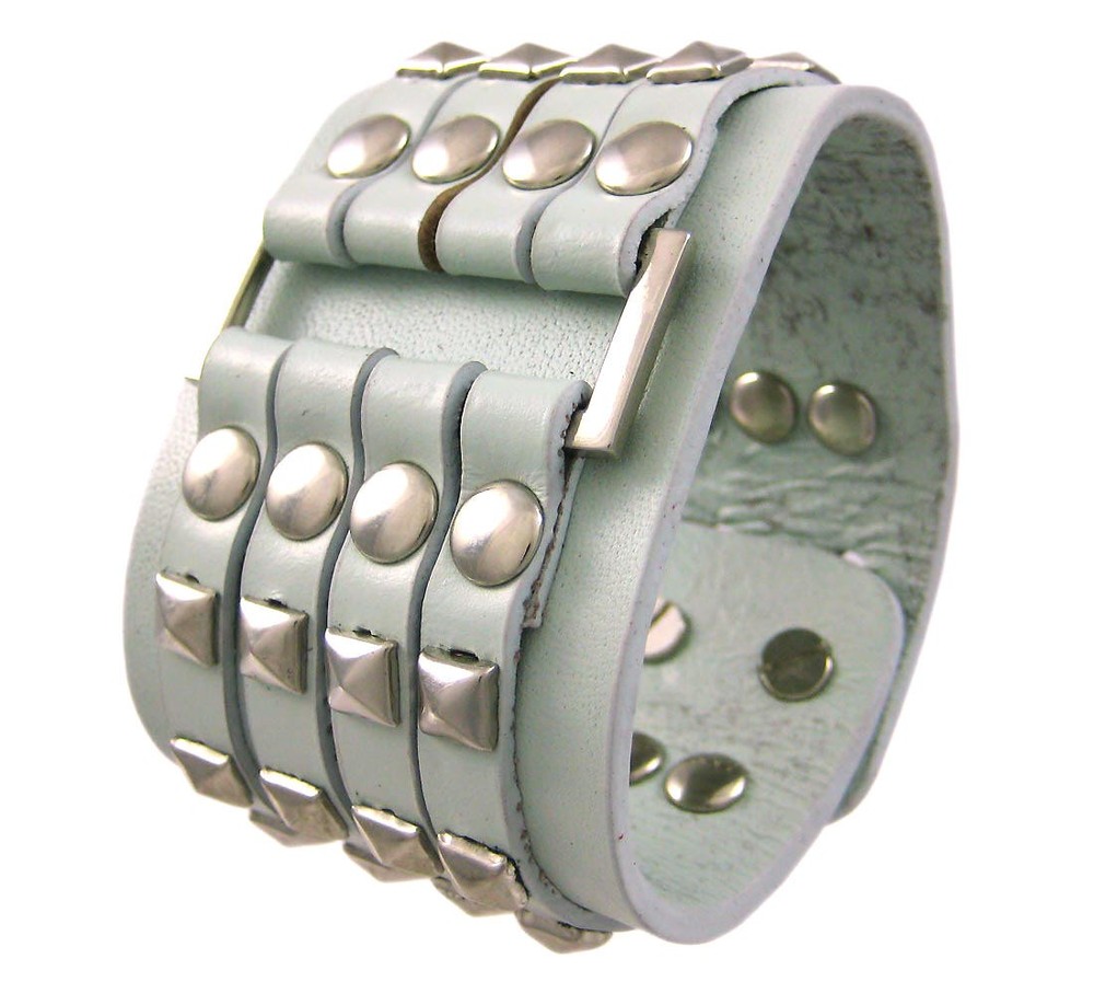 This wristband is seriously cool—the gray leather looks sleek, and the chrome pyramid studs add just the right amount of edge. The gauntlet style fits snugly but comfortably, and the triple tab closure keeps it secure. Perfect for anyone who loves bold accessories—great quality and stylish detail!