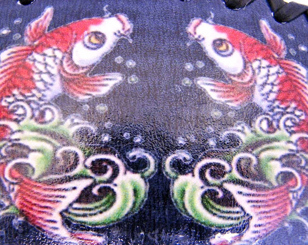Our eBay Store About Us Add to Favorite Sellers Tattoo Koi Fish Black Leather Belt Buckle Strength Makes a Great Gift Item Description: Embrace the rich history and symbolism of the koi tattoo with this stunning black leather belt buckle. Drawing inspiration from ancient Chinese legends, the koi fish has long been associated with courage, the pursuit of lofty goals, and triumph over life's challenges. This buckle pays homage to that symbolism with a captivating tattoo flash design of a pair of koi fish, adding an edgy touch to your outfit. Crafted from durable chrome-plated steel, the buckle showcases a luxurious covering of ultra-soft black leather on its entire front surface. This combination of materials exudes quality and style, making it a versatile accessory suitable for various occasions. Measuring 4 1/4 inches in width and 2 3/4 inches in height, this buckle boasts a bold yet tasteful appearance. Its back loop can accommodate a strap belt up to 1 1/2 inches wide, ensuring compatibility with your favorite belts. This remarkable belt buckle serves as an ideal gift for friends and family, offering a hint of attitude without overwhelming your ensemble. With its enduring quality and meaningful design, it's a statement piece that will withstand the test of time while adding a touch of tattoo-inspired flair to your attire. Elevate your style and embrace the enduring symbolism of the koi with this remarkable belt buckle. Special notes for our International customers: Import duties, taxes, and any other customs charges are not included in the item price or shipping charges. These charges are the buyer's responsibility. These charges are normally collected by the delivering freight (shipping) company or when you pick the item up - please do not mistake them for additional shipping charges. We do not mark merchandise values below value or mark items as gifts, US and International government regulations prohibit such behavior.