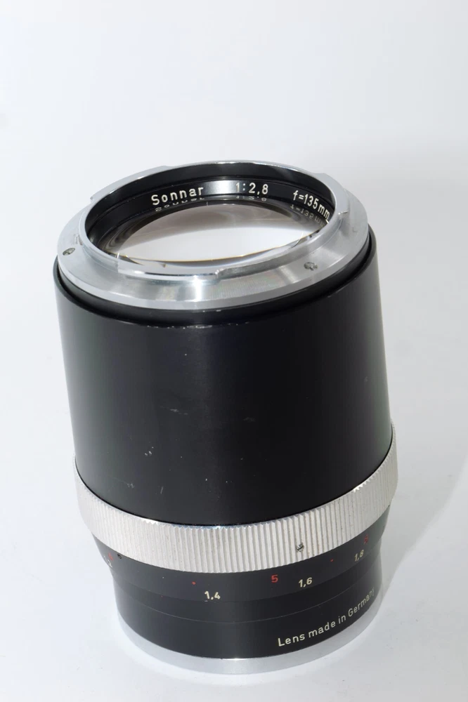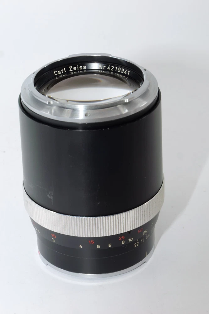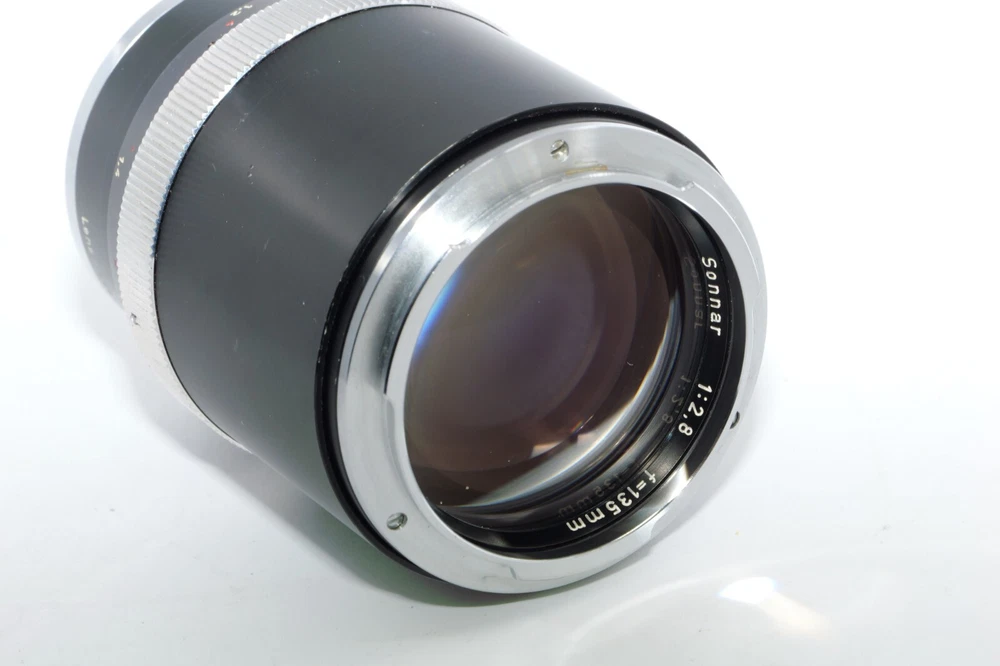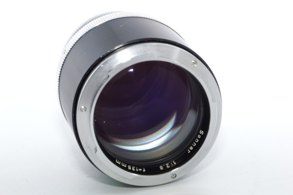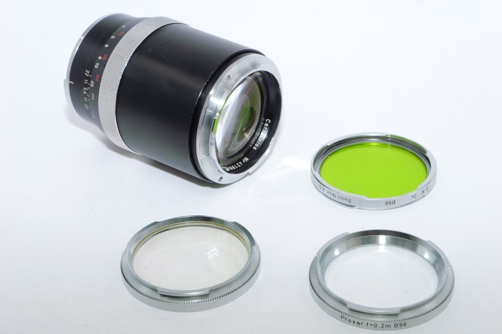 Carl Zeiss Olympia Sonnar 135mm f / 2.8 thelephoto le . Serial # 4219941. Made in Germany. This Sonnar telephoto lens will fit camera's like Contax Contarex, Contax Bullseye, Contax Special and Contax Professional. This lens can also be used on most mirrorless digital cameras with the proper adapter. Lens has close focusing down to 4 ft, or 1.2m. Aperture f/ 2.8 - f/ 22 . Filter size is B56. This Sonnar has a black body. Lens is Ex or 8 of 10 cosmetic condition. No dings or dents. Couple of small marks around on the lens barrel from prior use. Good shooter lens in overall good condition. Nice clean glass. Clean lens coating with no detectable marks or scratches. Clean and smooth six(6) aperture blades. Smooth focus. Also included is a Contarex lens booklet, Zeiss Proxar close-up lens, front lens cap, and B56 skylight filter, and green filters. Nice sharp Contarex 135mm f/2.8 telephoto lens to go with your vintage Zeiss Contarex camera. Sells with NO RESERVE at a price of $375. I have more interesting Contax Rangefinder and Reflex cameras, Contax lenses and Contax accessories on my other Auctions, E-bay Store and web page.