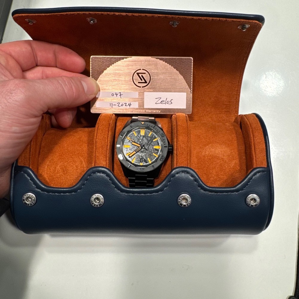 RARE Limited drop Swordfish 40mm. Meteorite Dial. Very hard to find! From up and coming micro brand Zelos. Dark stealth grey with orange. Amazing condition. Rarely worn. Travel case and original links included.