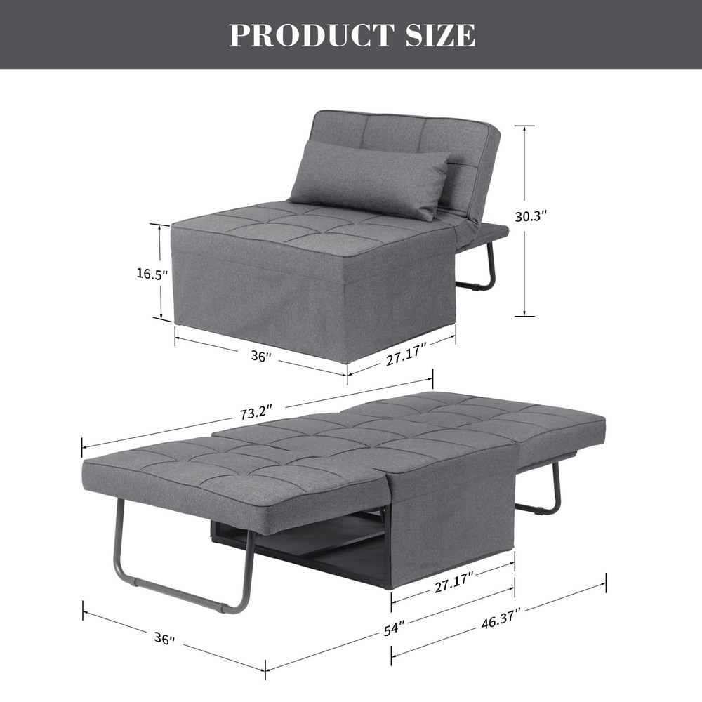 Get ultimate comfort and convenience with our Zenova 4-1 Adjustable Sofa Sleeper with Ottoman. Upholstered in luxurious linen fabric with stereo lines, this versatile piece of furniture is perfect for homes, apartments, offices, dorm rooms and vacation homes. The thick high density foam and durable gear ensure daily use, while the adjustable backrest guarantees extra comfort. The stylish grey cotton-look cover compliments almost any decor, and the black strengthened steel frame is extremely sturdy and durable. Choose from a variety of colors to match your style.Features: 4 in 1 design for convenience and comfort Black strengthened steel frame for durability Magnet fixed to cover the Iron Frame, which is dustproof and beautiful Various color choices: Dark grey/ Dark blue/ Free Shipping Over $49.99* Details Zenova 4-1 Adjustable Sleeper Sofa Chair with Ottoman, Sofa Bed ,Couch Bed Product Description: Get ultimate comfort and convenience with our Zenova 4-1 Adjustable Sofa Sleeper with Ottoman. Upholstered in luxurious linen fabric with stereo lines, this versatile piece of furniture is perfect for homes, apartments, offices, dorm rooms and vacation homes. The thick high density foam and durable gear ensure daily use, while the adjustable backrest guarantees extra comfort. The stylish grey cotton-look cover compliments almost any decor, and the black strengthened steel frame is extremely sturdy and durable. Choose from a variety of colors to match your style. Features: 4 in 1 design for convenience and comfort Black strengthened steel frame for durability Magnet fixed to cover the Iron Frame, which is dustproof and beautiful Various color choicesDark grey/ Dark blue/ White/Grey/Brown/Dark Brown Multi-functionsitting, reclining, foot-support and sleeping to meet all your needs User-friendly designEasy to store and saves space. Adjustable backrest guarantees extra comfort. MaterialUpholstered in linen fabric with full and comfortable stereo lines. Top padding with thick high density foam ensures daily use. Durable gear provides core parts with more stability. Easy assemblySimple and quick assembly process GuaranteeReplacement or money-back guarantee for any quality problem within 30 days. Free replacement parts provided in case of damage or missing parts within 3 months. Specifications: Size As sofa74.02" x 37.4" x 16.93" (LxWxH) As chair46.85" x 37.4" x 31.89" (LxWxH) Folding as ottoman37.4" x 27.17" x 16.93" (WxDxH) Net weight61.7 lbs Gross weight53 lbs Max weight capacity440 lbs Package included: 1 x Folding Ottoman Set 1 x Bolster