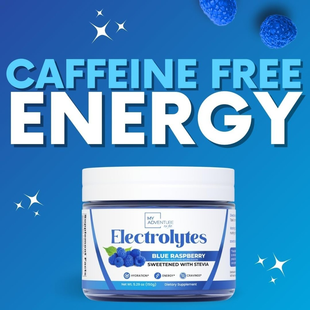 Zero Sugar - Blue Raspberry Electrolytes Powder - Refreshing Hydration - Caffeine Free Energy - All Natural Ingredients - Vegan, Keto and Paleo - Sugar Free Electrolyte Powder Drink Mix - 37 Servings Flavor Blue Raspberry Unit Count 5.29 Ounce Item Form Powder Item Weight 6.4 ounces Item dimensions L x W x H 2.75 x 2.75 x 2.5 inches Special Ingredients Stevia Diet Type Keto Product Benefits Supports Electrolyte Balance Age Range (Description) Adult About this item Quench Your Thirst - Dive into the ultimate hydration experience with our Blue Raspberry Electrolytes Powder. Perfectly crafted to replenish your body, this electrolytes powder no sugar formula ensures every sip is filled with the goodness of electrolytes, making it your go-to hydration partner. Whether you're tackling intense workouts or just need a refreshing drink, our blue raspberry electrolytes deliver on taste and hydration. Crush Your Cravings - Satisfy your sweet tooth without the guilt! Our sugar free electrolytes powder is naturally sweetened with Stevia, offering a delicious Blue Raspberry flavor that curbs cravings instantly. Ideal for those on a ketogenic diet, our keto electrolytes powder seamlessly fits into your lifestyle, allowing you to manage your cravings while staying on track. Caffeine Free Energy - Experience a steady, natural boost of energy with our caffeine-free formula. Infused with essential nutrients, our electrolyte powder enhances your energy levels without the jitters or crash associated with caffeine. Perfect for any time of the day, this hydration powder keeps you energized and focused. Sweetened With Stevia - Enjoy the luscious taste of blue raspberry electrolytes without any added sugars. Our electrolight powder is thoughtfully sweetened with Stevia, providing a guilt-free way to stay hydrated and indulge in a sweet treat. It's the perfect balance of flavor and health, making it a family-friendly choice for all. Refreshing Hydration With Zero Sugar - Elevate your hydration game with our electrolytes powder sugar free formula. Designed for maximum refreshment without the sugar, our Blue Raspberry electrolytes drink mix is your ally in achieving optimal hydration and pH balance. Whether you're in the gym, on a hike, or need a refreshing break, our hydration powder delivers unparalleled taste and hydration benefits. Product details Product Dimensions : 2.75 x 2.75 x 2.5 inches; 6.4 ounces Item model number : KEMAF42 Date First Available : November 15, 2023 Manufacturer : My Adventure to Fit Country of Origin : USA Important information Safety Information Consult with a physician prior to taking if you are pregnant, nursing or taking any medication. Keep out of children's reach. Ingredients Potassium Citrate, Citric Acid, Magnesium Citrate, Himalayan Pink Salt, Stevia Leaf Extract, Silica (Mineral), Calcium Ascorbate, Malic Acid, Calcium Citrate, Blue Spirulina Extract, Natural Blue Raspberry Flavor, Zinc Citrate, Manganese Gluconate. Directions Mix one scoop with 10-16oz of water. Add ice for best taste Take 1 or more scoops daily for optimal hydration. Legal Disclaimer Statements regarding dietary supplements have not been evaluated by the FDA and are not intended to diagnose, treat, cure, or prevent any disease or health condition. Product Description